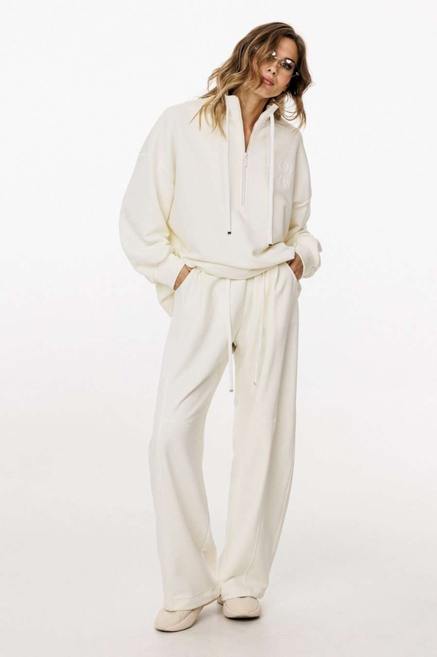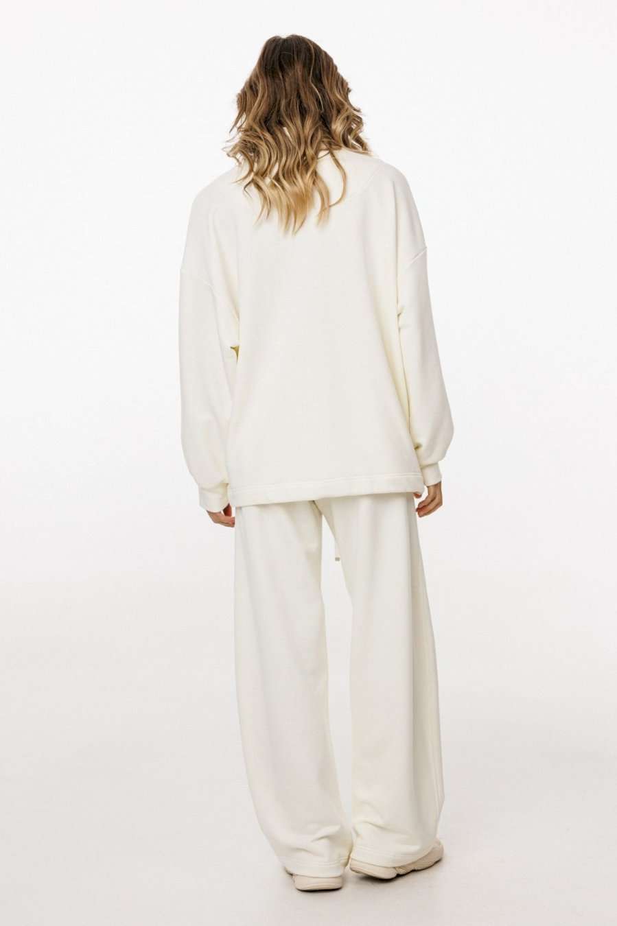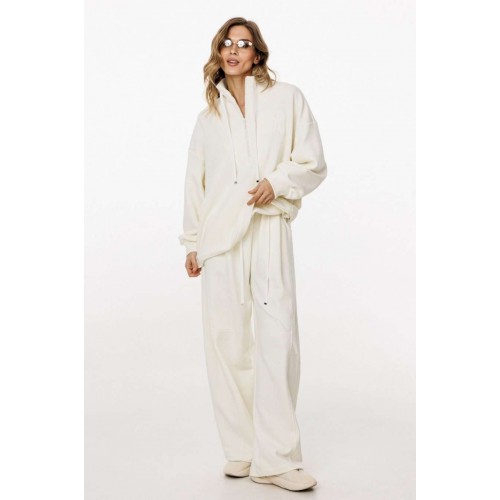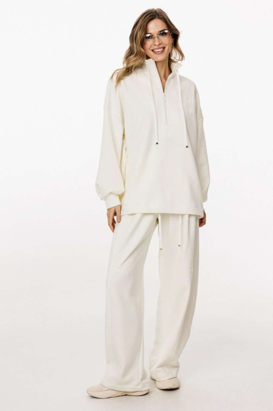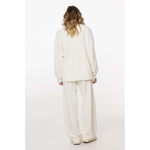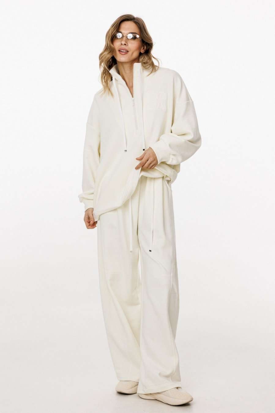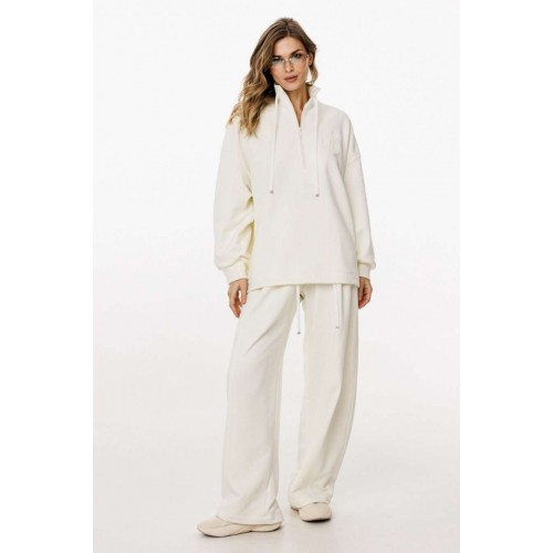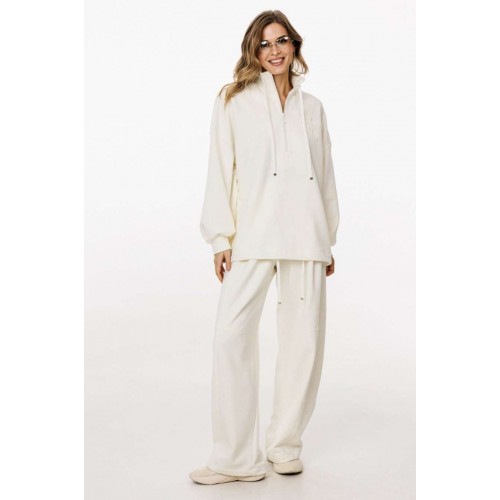 Комплект: джемпер+брюки. Комплект выполнен из трикотажного полотна. Джемпер прямого силуэта, покроя \"oversize\" длиной до линии бедер. Спереди застежка на молнию. Воротник-стойка. Плечевой шов удлинен. Рукав рубашечного покроя, одношовный, расширенный и присборенный к низу. Низ рукава на притачной манжете. Низ джемпера на эластичной тесьме с фиксаторами. Джемпер декорирован вышивкой по переду. Брюки прямого силуэта, длиной в пол, на притачном поясе с эластичной тесьмой. Спереди боковые карманы с фигурным входом, петли в поясе, в которые втянут шнур из основной ткани, коленные вытачки, складки. Сзади справа накладной карман. Длина джемпера: р. 44-48 - 68,5 см, р. 50-54 - 70 см. Длина рукава от горловины: р. 44-48 - 77,5 см, р. 50-54 - 78,5 см. Длина брюк: р. 44-48 - 107 см, р. 50-54 - 108,5 см. КОМПЛЕКТ м. 3048 44 46 48 50 52 54 ДЖЕМПЕР Длина по центру спинки 69 69 69 70,5 70,5 70,5 Длина рукава от горловины 76,5 76,5 76,5 78 78 78 Объем по груди 139 143 147 151 155 159 Объем по талии 132 136 140 144 148 152 Объем по низу 126 130 134 138 142 146 Объем рукава вверху 56 58 60 60 62 64 Объем рукава внизу 22 22 22 24 24 24 БРЮКИ Длина сбоку с поясом 113 113 113 114 114 114 Объем по талии 62/96 66/100 70/104 74/108 78/112 82/116 Объем по бедрам 124 128 132 136 140 144 Ширина пояса 5,3 5,3 5,3 5,3 5,3 5,3