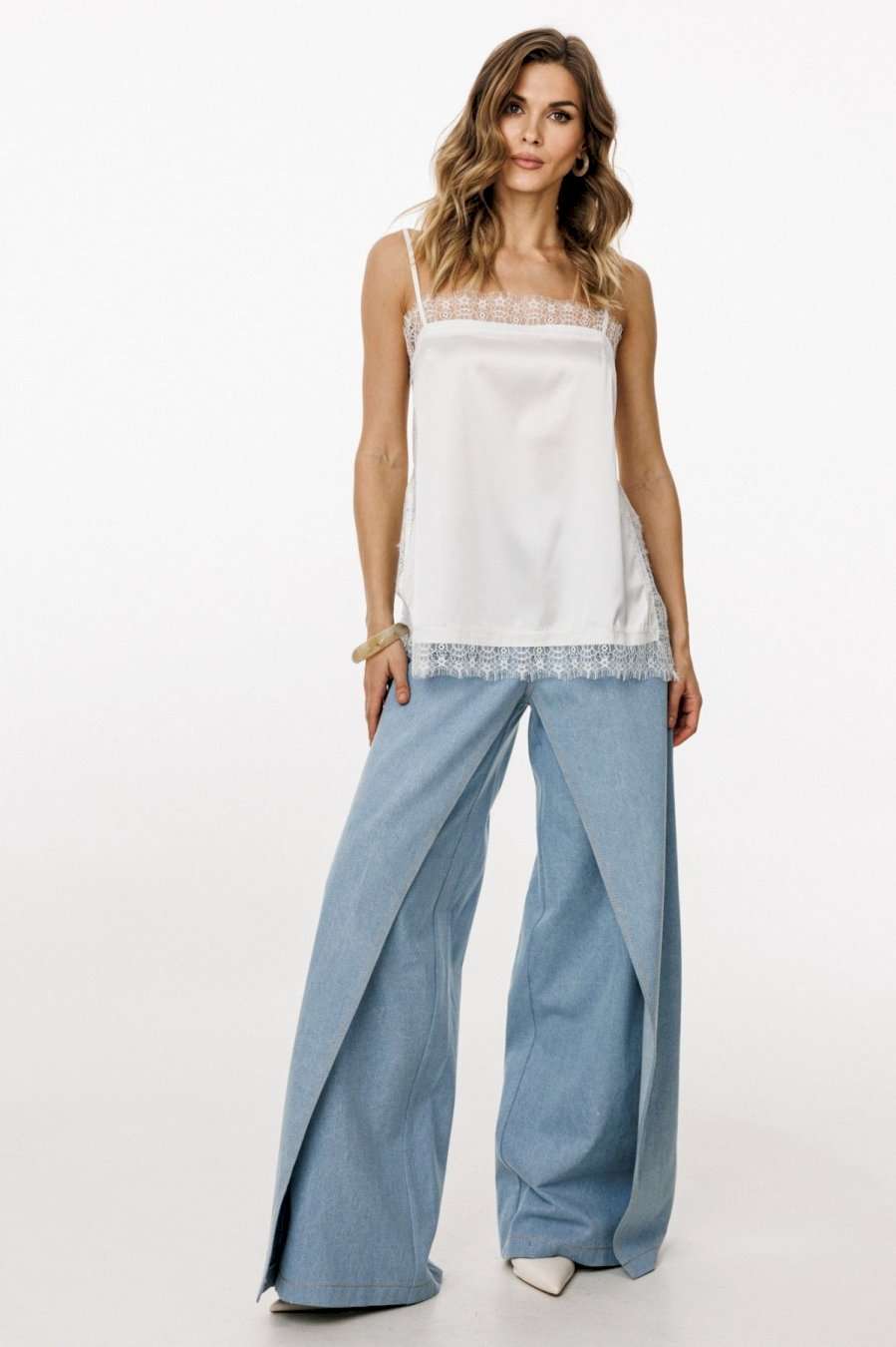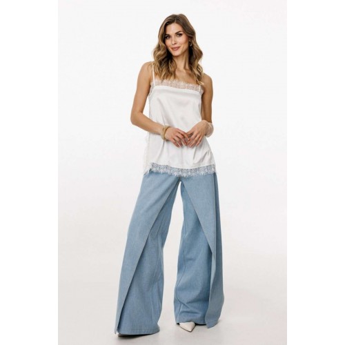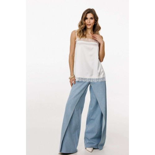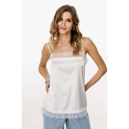 Топ выполнен из тонкого атласа. Топ прямого силуэта длиной выше линии бедер. По переду обработаны нагрудные вытачки. Топ на регулируемых бретелях из основной ткани. В боковых швах обработаны разрезы. Топ декорирован тесьмой-кружевом по горловинам переда и спинки, по боковым и по низу. Длина топа: р. 42-46 - 50 см, р. 48-52 - 52 см. ТОП м. 3055 42 44 46 48 50 52 Длина по центру спинки 50 50 50 52 52 52