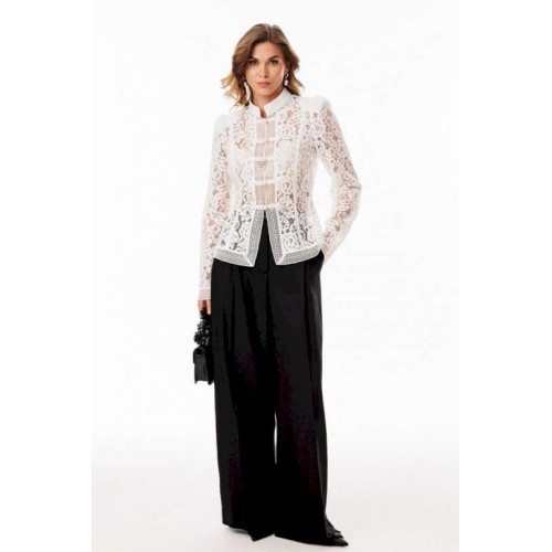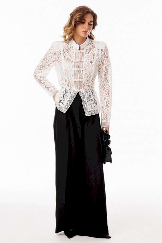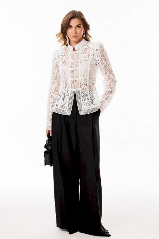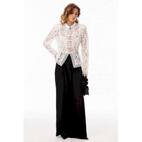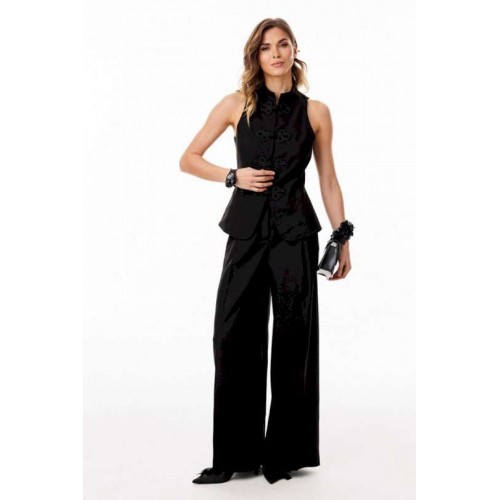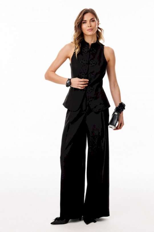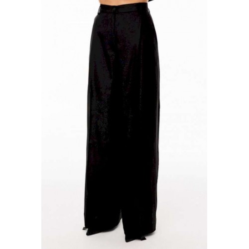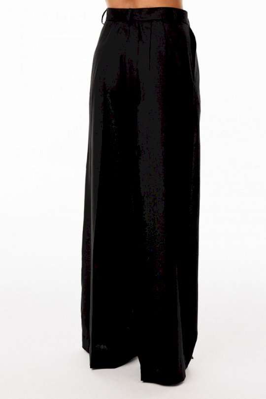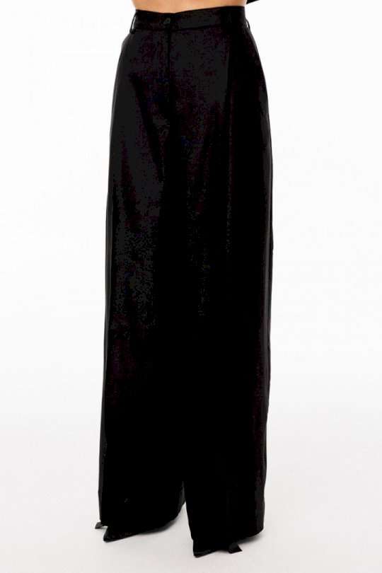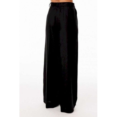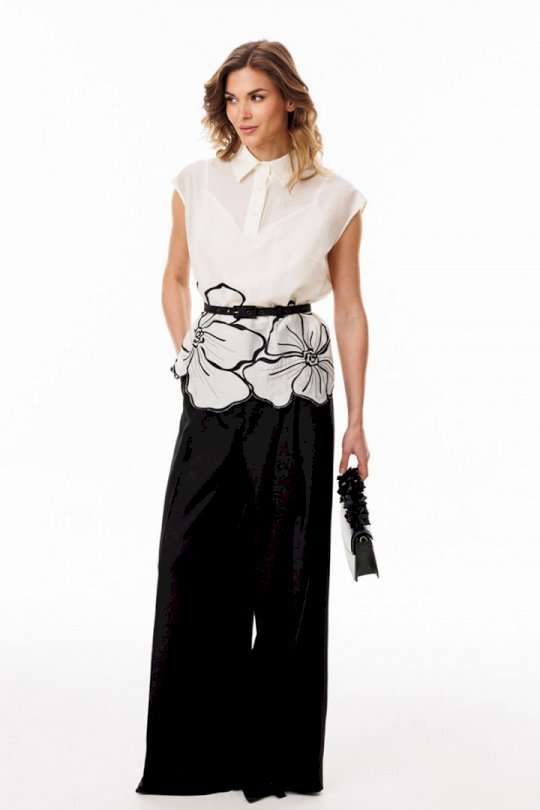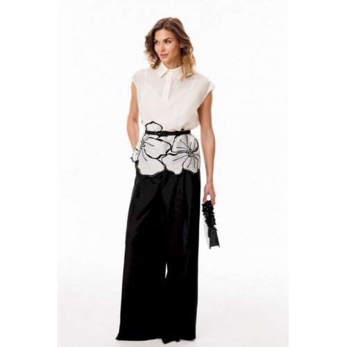 Брюки-палаццо выполнены из льна. Брюки на притачном поясе, длиной в пол, расширенные к низу. Спереди складки и боковые карманы с наклонным входом. Застежка спереди на молнию с гульфиком и пуговицу. На задних частях обработаны талиевые вытачки. Длина брюк: р. 42-46 - 116,5 см, р. 48-52 - 117,5 см