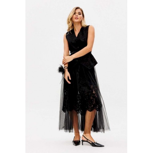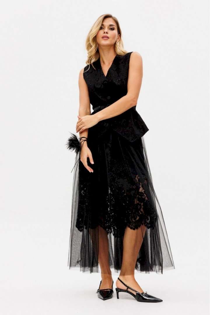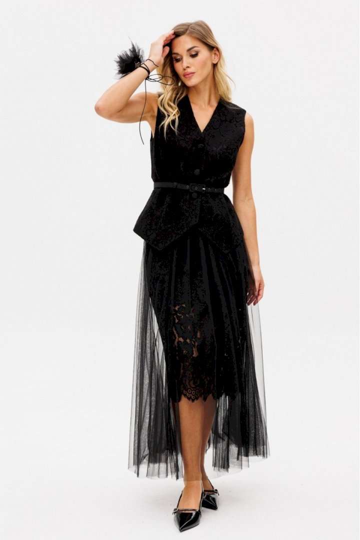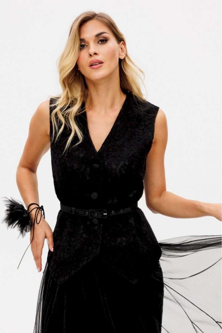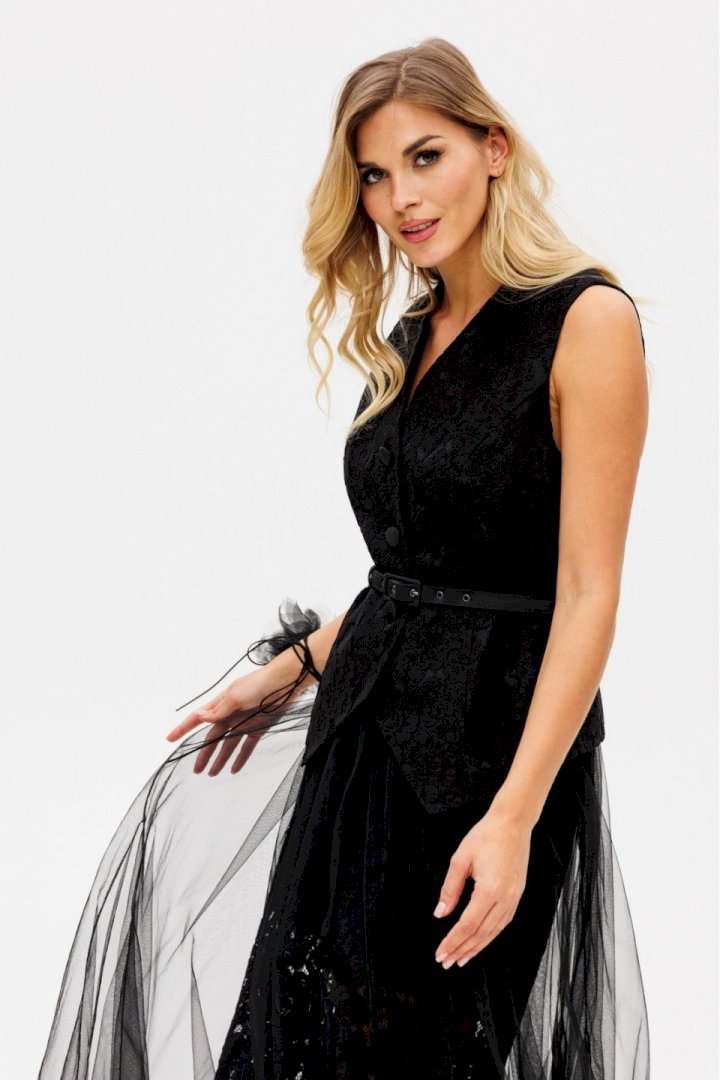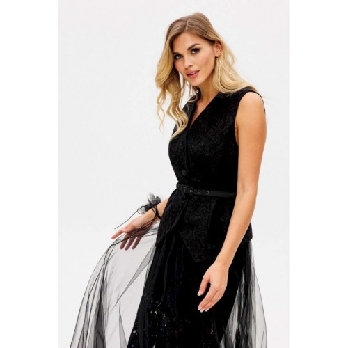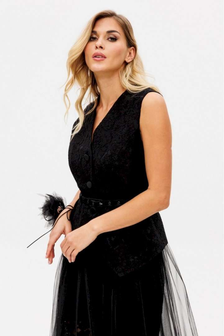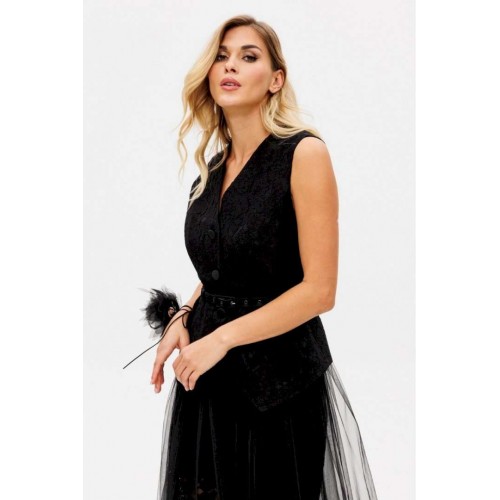 Жилет выполнен из гипюра. Жилет полуприлегающего силуэта, длиной до линии бедер. Низ жилета фигурной формы. Спереди декоративные карманы и центральная застежка на пуговицы. Горловина переда V-образной формы. Жилет на притачной по низу подкладке. В комплект входит ремень са пряжкой. Украшение в виде цветка на руке в комплект не входит, можно заказать отдельно арт. 0048 Длина жилета: р. 44-48 - 55 см, р. 50-54 - 56 см.