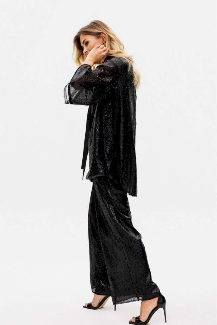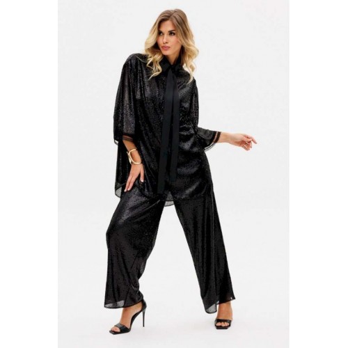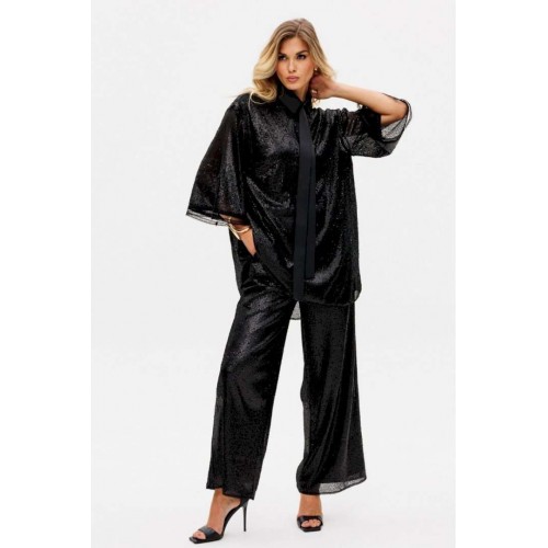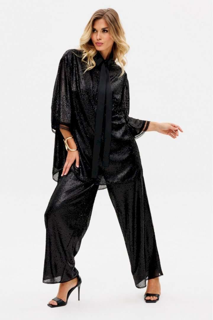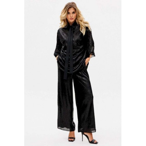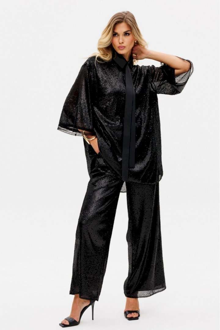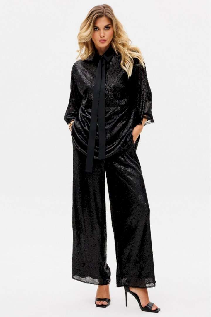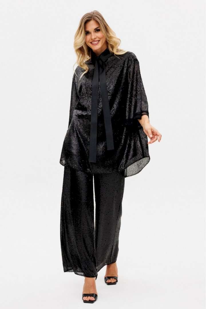 Комплект: блузка+брюки. Комплект выполнен из трикотажного полотна в пайетки. Блузка прямого силуэта, длиной ниже линии бедер. Перед и спинка цельные. Спереди застежка на пуговицы. Стояче-отложной воротник с отрезной стойкой. Плечевой шов удлинен. Рукав рубашечного покроя, одношовный, длиной ниже линии локтя. Низ рукава декорирован тесьмой-кружевом. В комплект входит съемный галстук. Галстук и воротник выполнены из атласа. Низ блузки фигурной формы. Блузка на отлетной по низу подкладке. Брюки прямого силуэта, длиной до линии щиколотки, на притачном поясе с эластичной тесьмой. В боковых швах карманы. Брюки на отлетной по низу подкладке. Длина блузки: р. 44-48 - 83 см, р. 50-54 - 84 см. Длина рукава: р. 44-48 - 56 см, р. 50-54 - 57 см. Ддина брюк: р.44-48 -102 см, р. 50-54 - 103 см. Гарантийный срок не установлен ГОСТ 31409 -2003