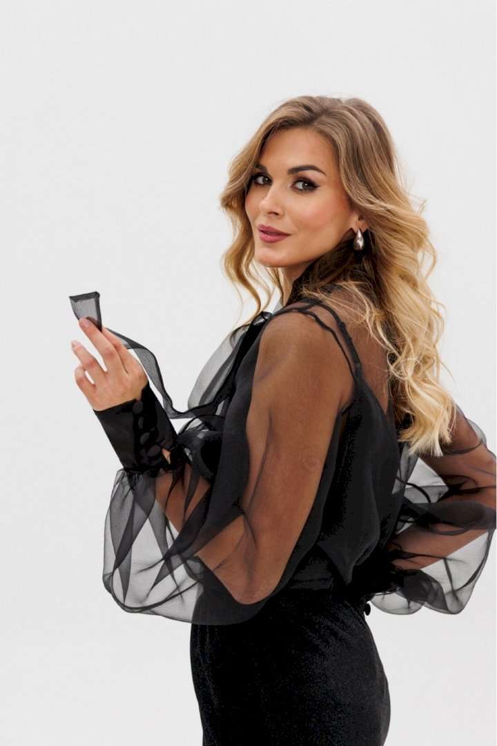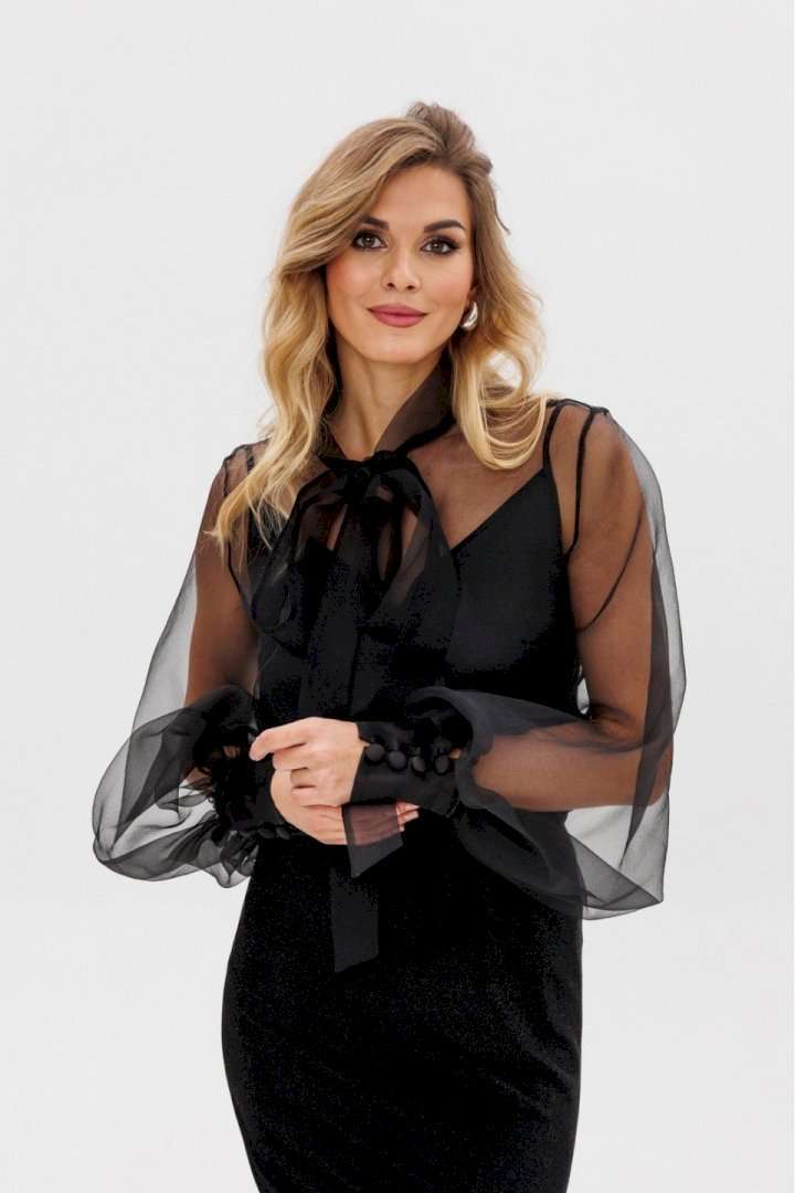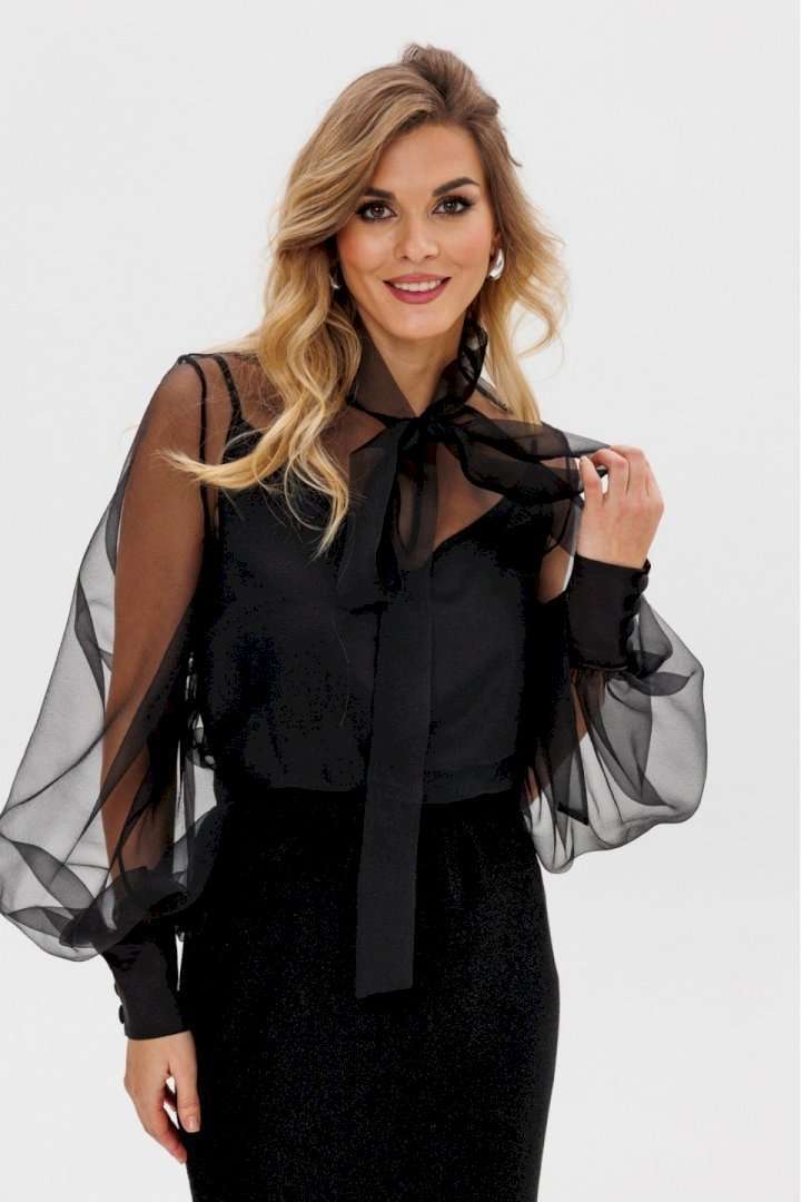 Блузка + топ. Блузка выполнена из органзы. Блузка прямого силуэта, длиной выше линии бедер. Перед и спинка цельные. Спереди прорезь. Воротник-стойка, переходящий в бант. Рукав втачной, одношовный, расширенный к низу и присборенный. Низ рукава на притачной манжете из отделочной ткани, застегивающейся на четыре пуговицы. В комплект входит топ из атласа. Топ на регулируемых бретелях. Перед и спинка топа цельные. Длина блузки: р.42-46 - 70 см, р.48-52 - 71 см. Длина рукава: р.42-46 - 71 см, р.48-52 - 72 см. Гарантийный срок не установлен ГОСТ 25294 -2003