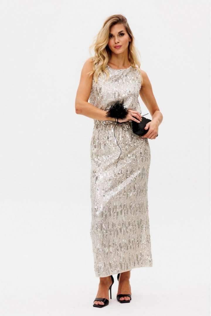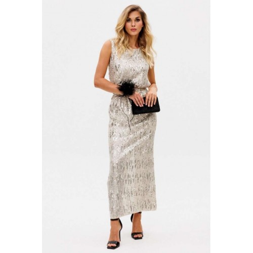 Топ выполнен из трикотажного полотна в пайетки. Топ прямого силуэта, длиной до линии бедер. Перед и спинка цельные. Горловина округлой формы. Плечевой шов укорочен. Топ на отлетной по низу подкладке. Длина топа: р. 42-46 - 61 см, р. 48-52 - 62,5 см. Гарантийный срок не установлен ГОСТ 31409 - 2009