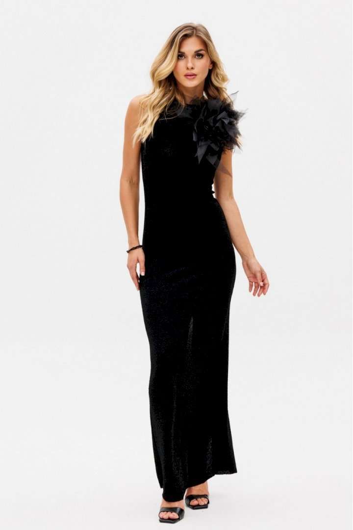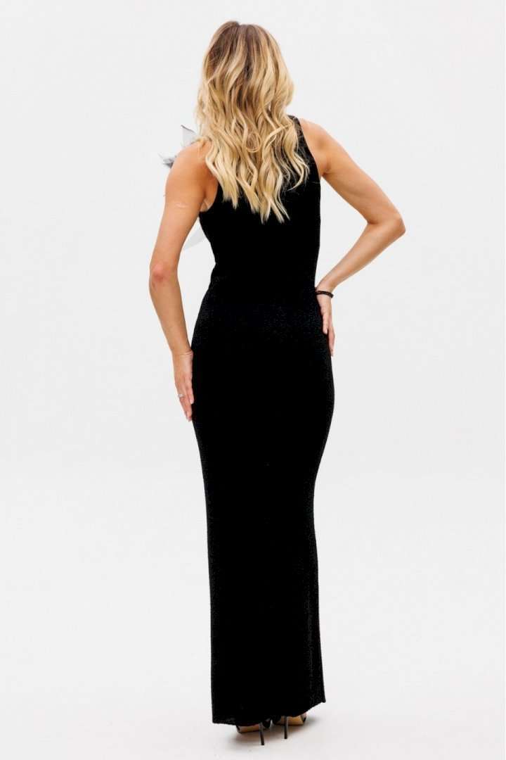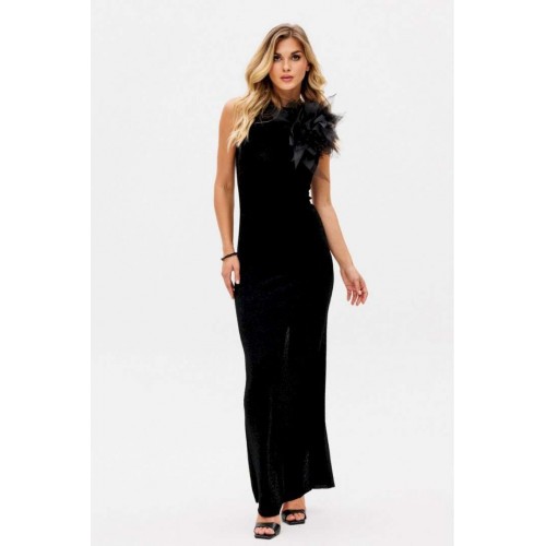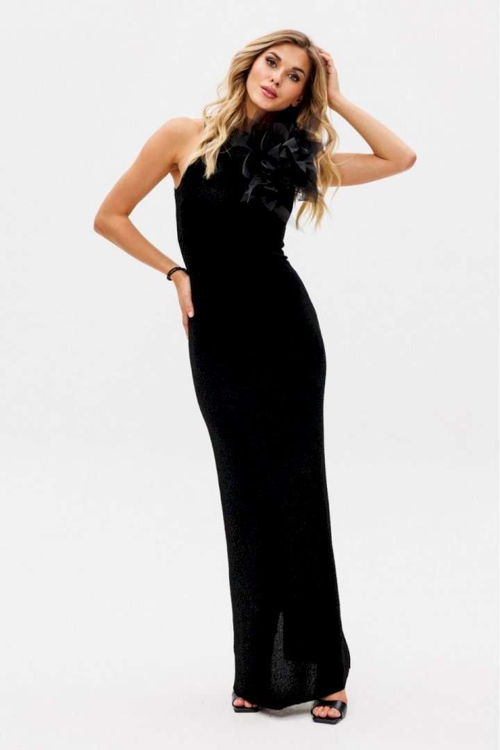 Платье выполнено из трикотажа с блеском. Платье приталенного силуэта, длиной в пол. На спинке средний шов с разрезом. Горловина округлой формы. Плечевой шов заужен. Брошь в комплект не входит, можно приобрести отдельно арт. 0047. Длина платья: 141 см. Гарантийный срок не установлен ГОСТ 31409 - 2009
