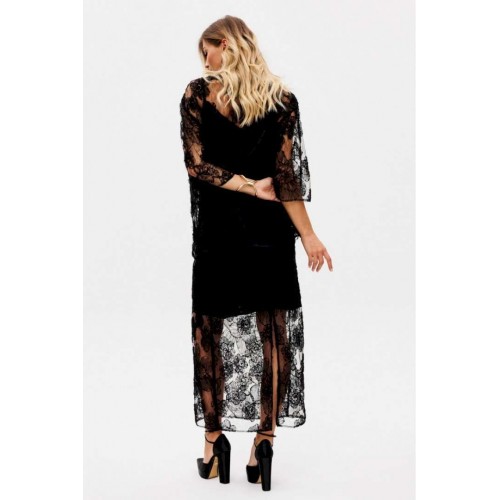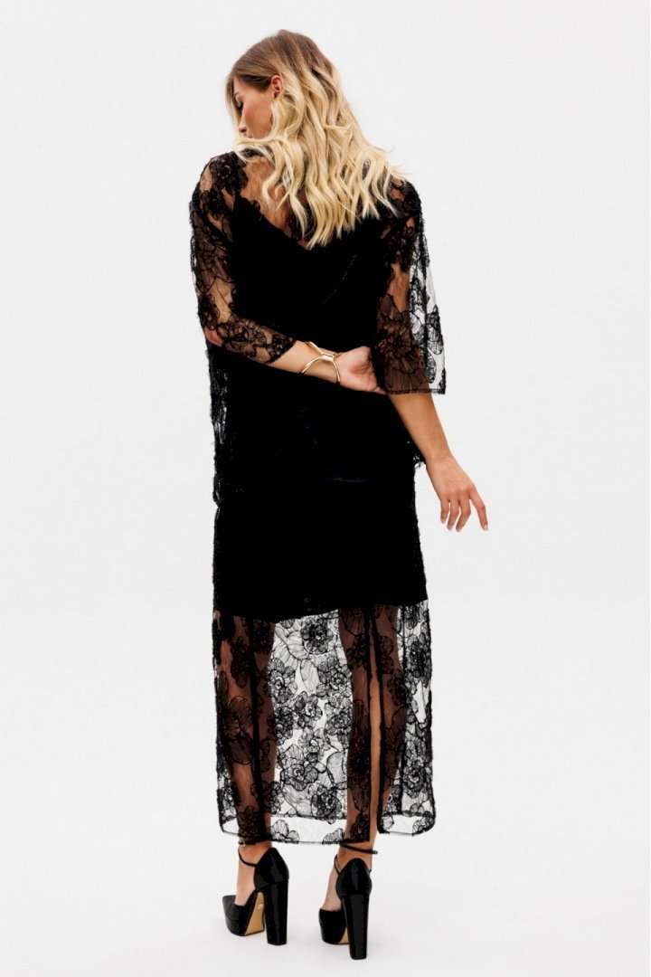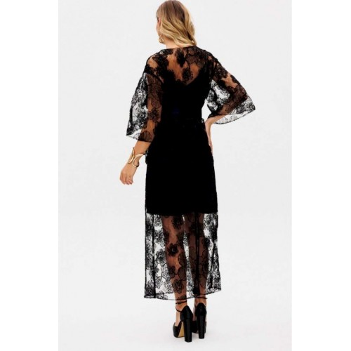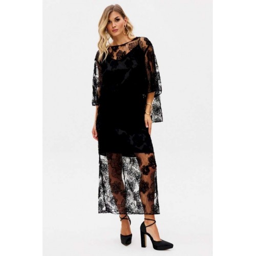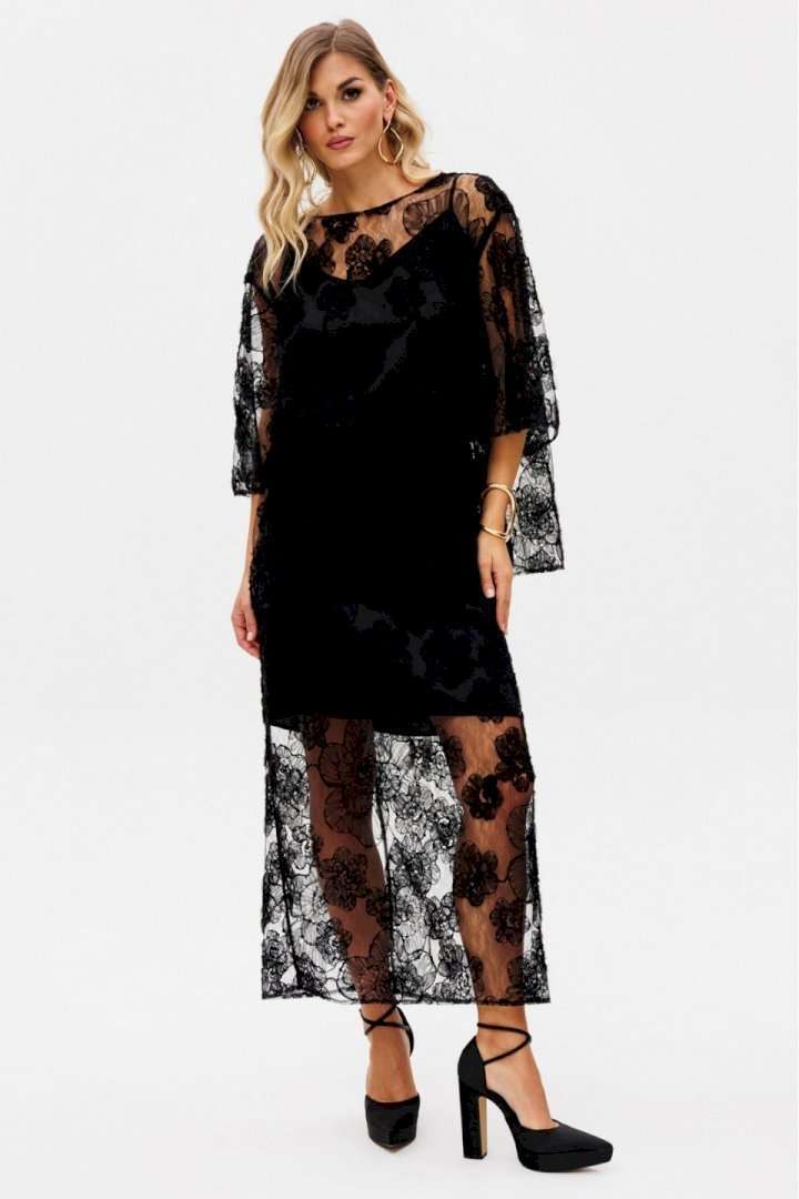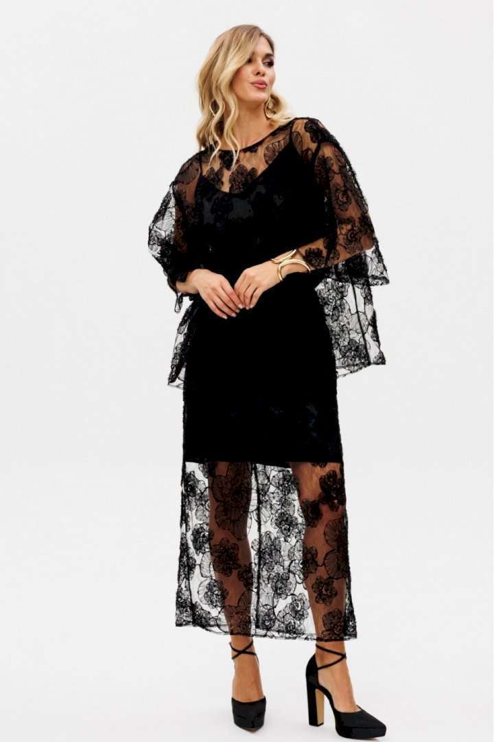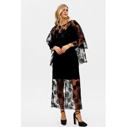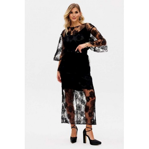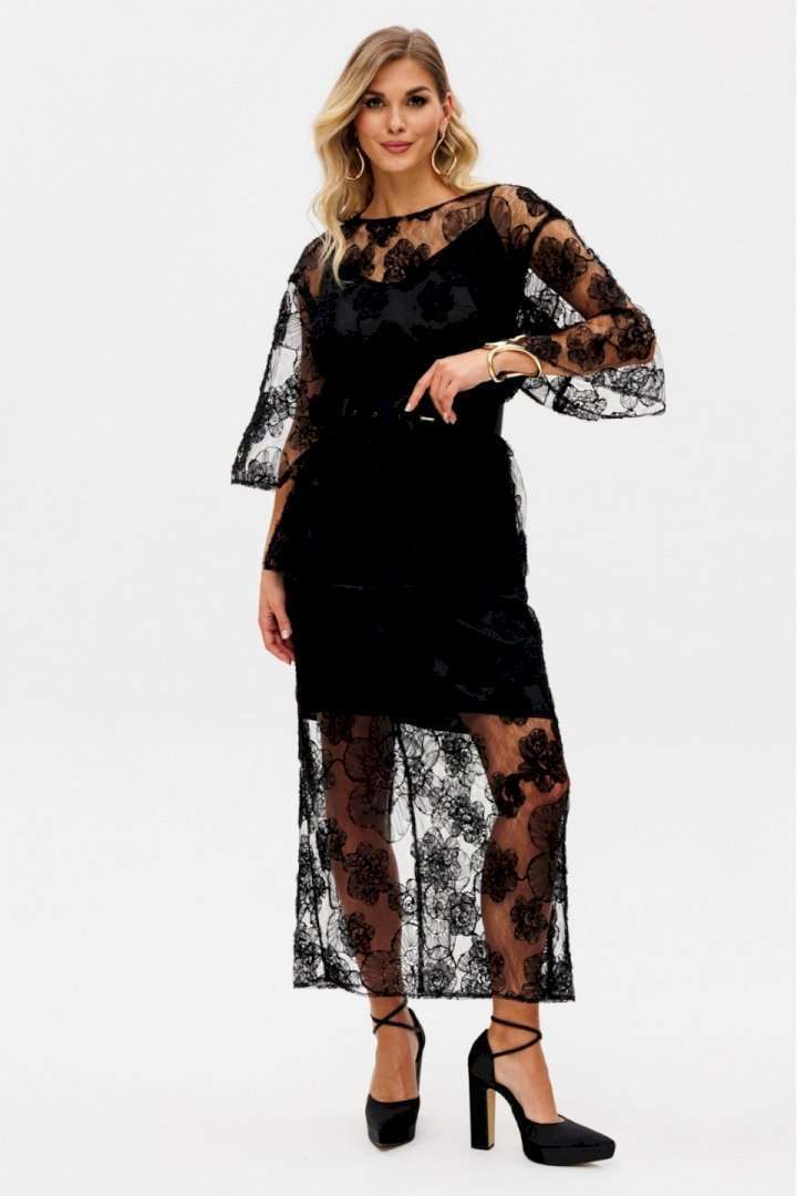 Юбка выполнена из сетки с цветочной аппликацией. Юбка прямого силуэта, длиной миди, на притачном поясе. Сзади в среднем шве шлица и застежка на потайную молнию. Юбка на отлетной по низу подкладке из атласа. В комплект входит съемный ремень из атласа. Длина юбки: 95 см. Гарантийный срок не установлен ГОСТ 25294 - 2003