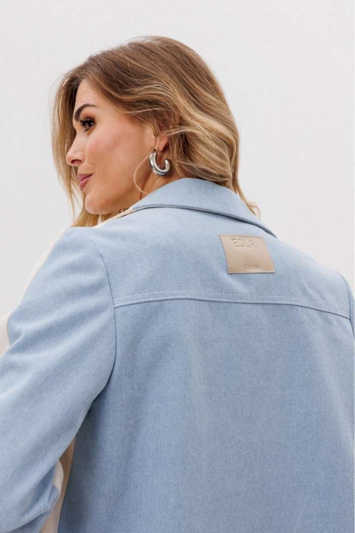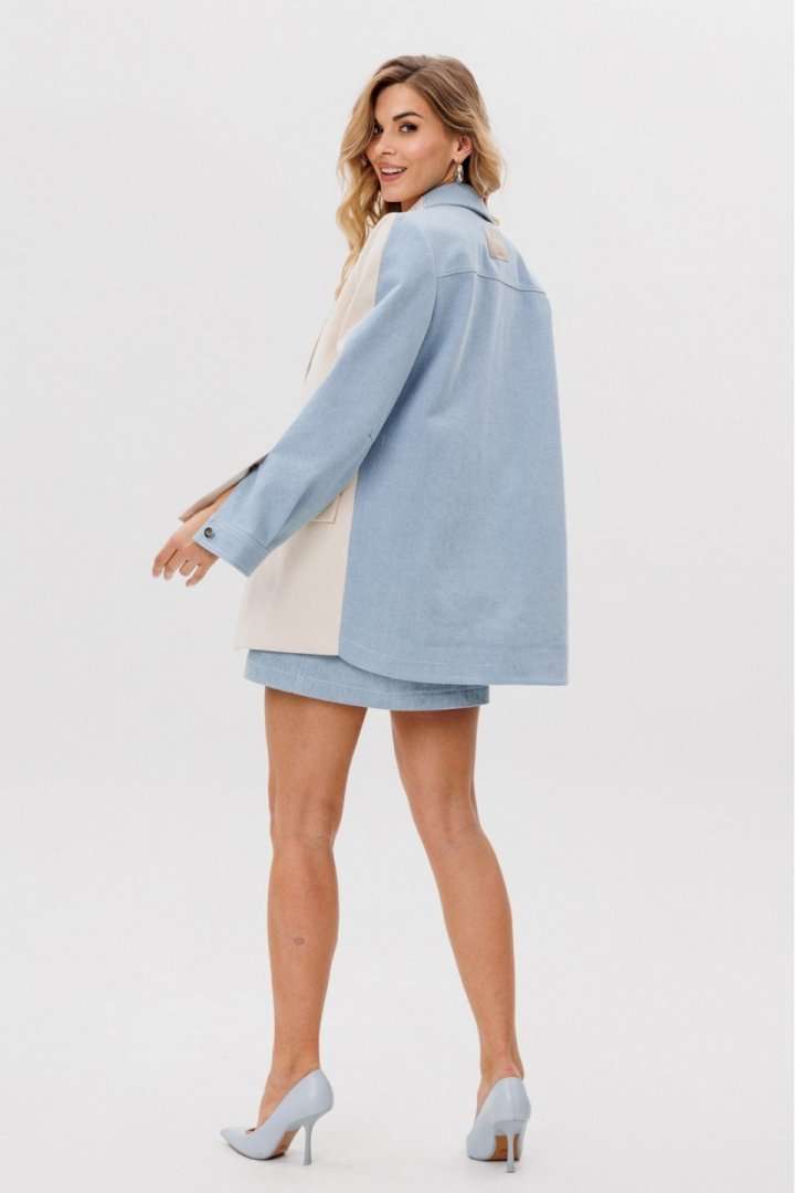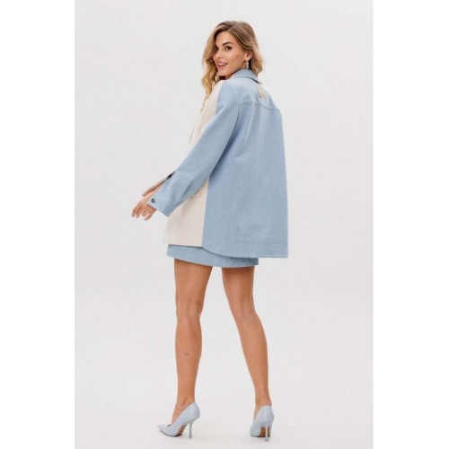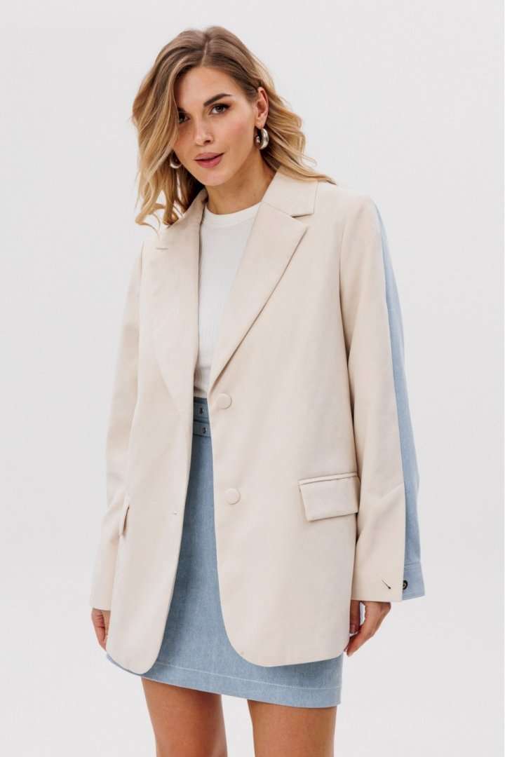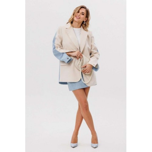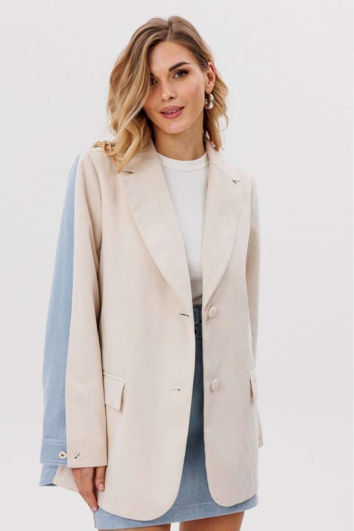 Жакет выполнен из джинса и искуственной замши. Жакет прямого силуэта, длиной ниже линии бедер. Спереди прорезные карманы с клапанами, нагрудные вытачки от горловины, лацканы и центральная бортовая застежка на пуговицы. На спинке кокетка с брендированной нашивкой из натуральной кожи. Низ спинки фигурной формы и длиннее переда. Воротник пиджачного типа. Задняя часть воротника выполнена из джинса, передняя часть из замши. Рукав втачной, двухшовный со шлицей по низу. Жакет на отлетной по низу подкладке. Длина жакета: р. 42-46 - 77 см, р. 48-52 - 78,5 см. Гарантийный срок не установлен ГОСТ 25295 - 2003