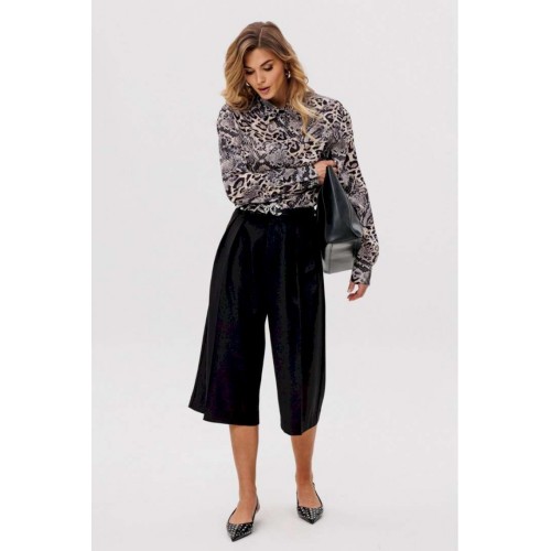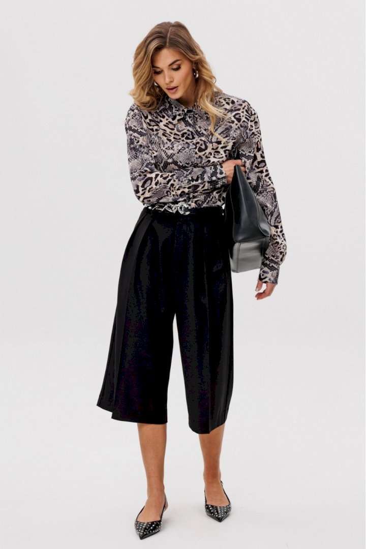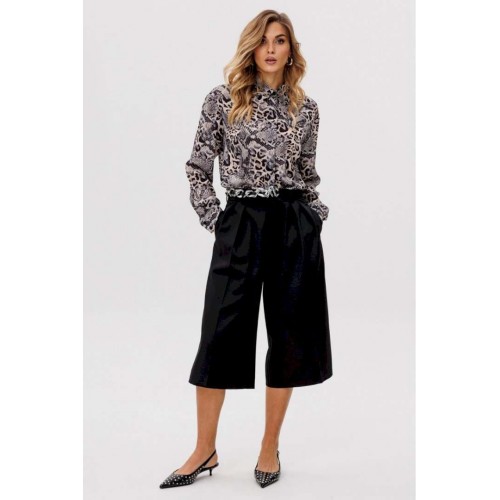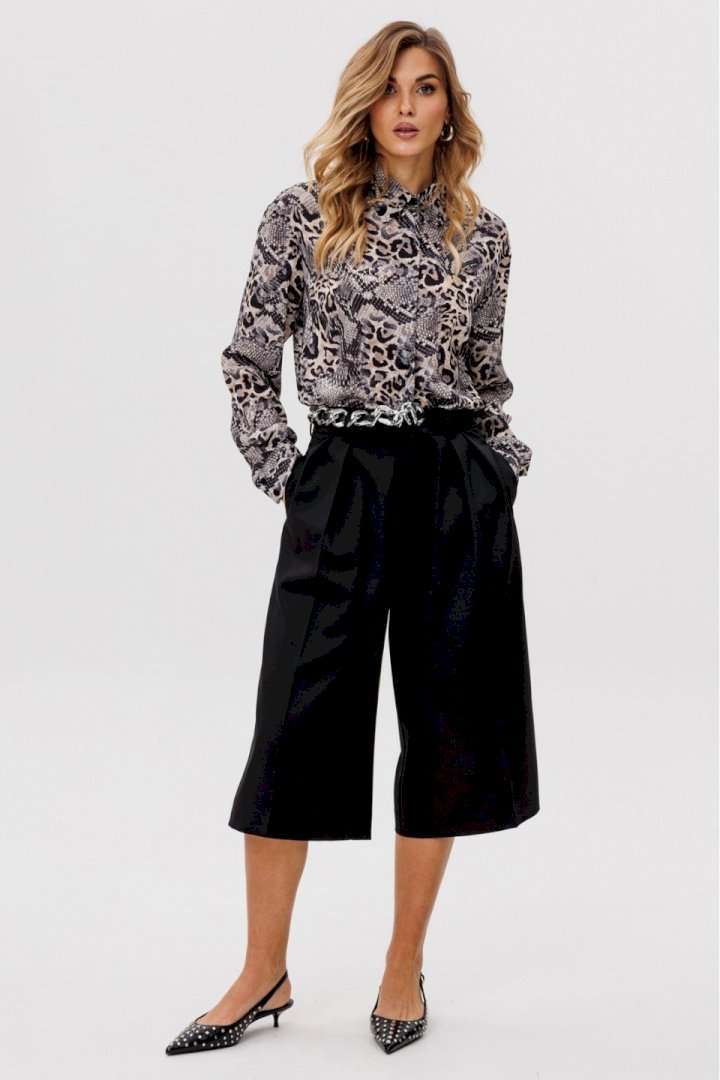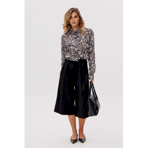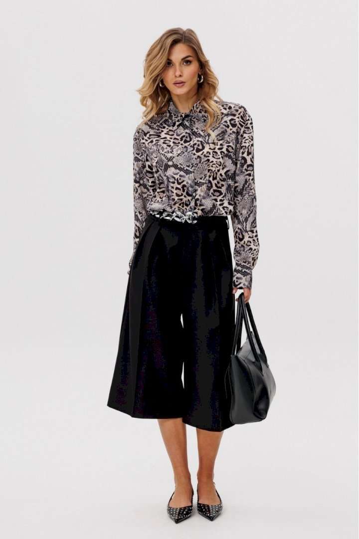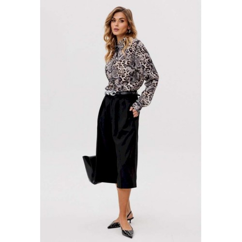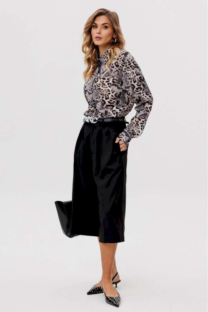 Элегантная блузка из креп-шифона привлекает своим утончённым анималистичным принтом в нейтральных тонах, который является главным акцентом дизайна. Модель обладает стояче-отложным воротником, добавляющим строгости. Спинка блузки оформлена цельным кроем. Расширенные плечевые швы подчеркивают линию плеч, а рукава выполнены в классическом рубашечном стиле с одношовным силуэтом и завершаются аккуратными притачными манжетами. Центральная удобная застежка на потайную планку с пуговицами обеспечивает идеальное прилегание. Длина блузки варьируется от 73 см до 74,5 см в зависимости от размера. Эта элегантная и одновременно функциональная модель станет изысканным выбором для создания деловых или повседневных ансамблей.