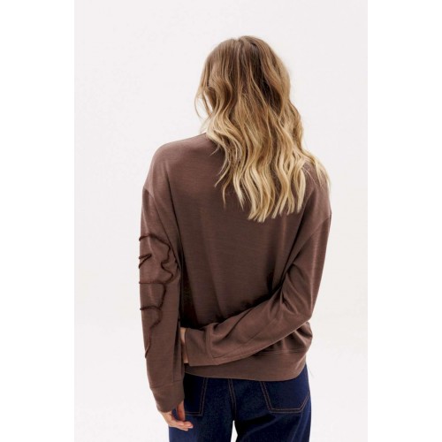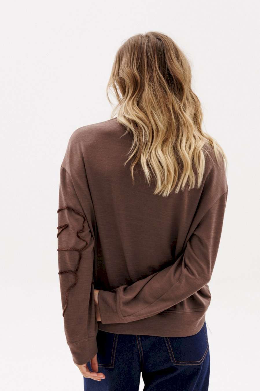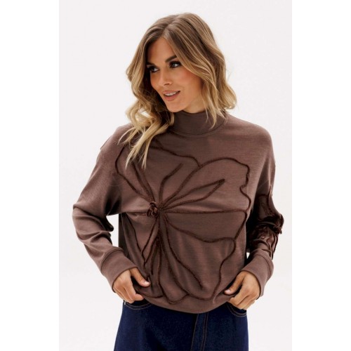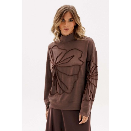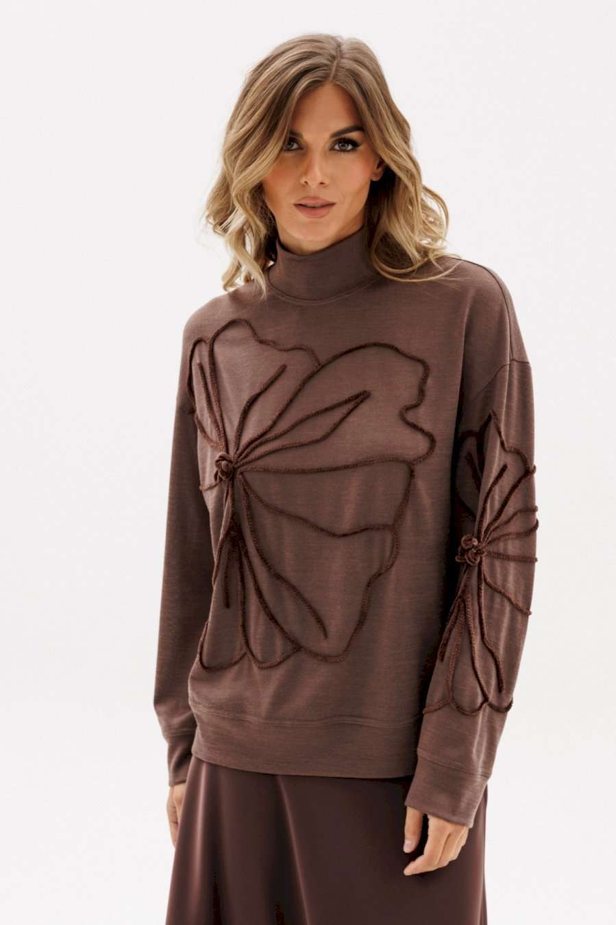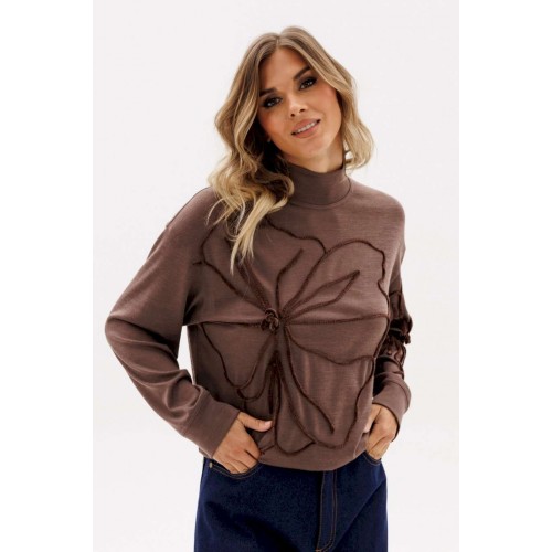 Джемпер выполнен из трикотажного полотна. Джемпер О-образного силуэта, длиной до линии бедер. Перед и спинка цельные. Горловина округлой формы с воротником-стойкой. Плечевой шов удлинен. Рукав рубашечного покроя, одношовный. Низ рукава на притачной манжете из основной ткани. Джемпер декорирован вышивкойпо переду и левому рукаву. Длина джемпера: р. 44-48 - 56 см, р. 50-54 - 57,5 см. Длина рукава от горловины: р. 44-48 - 74,5 см, р. 50-54 - 75,5 см.