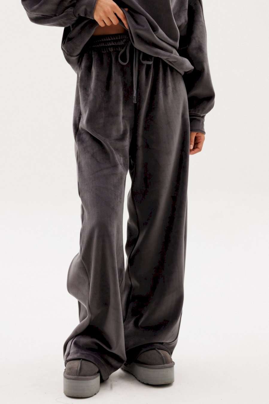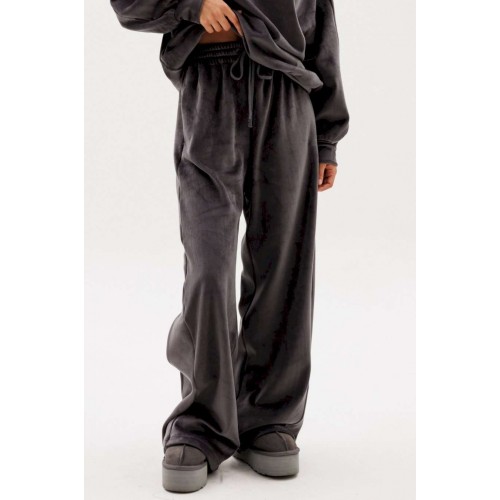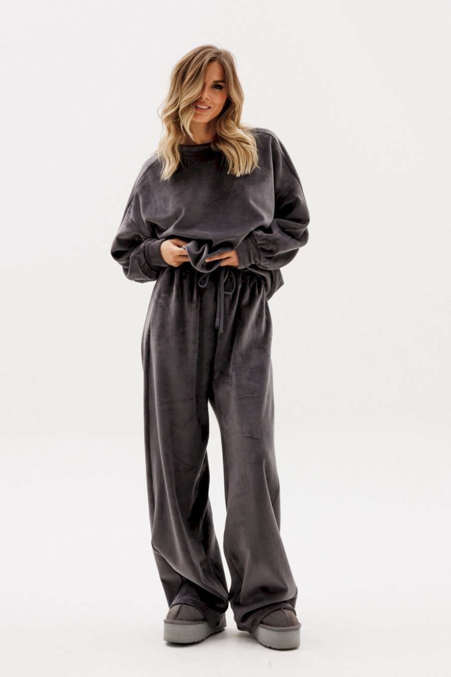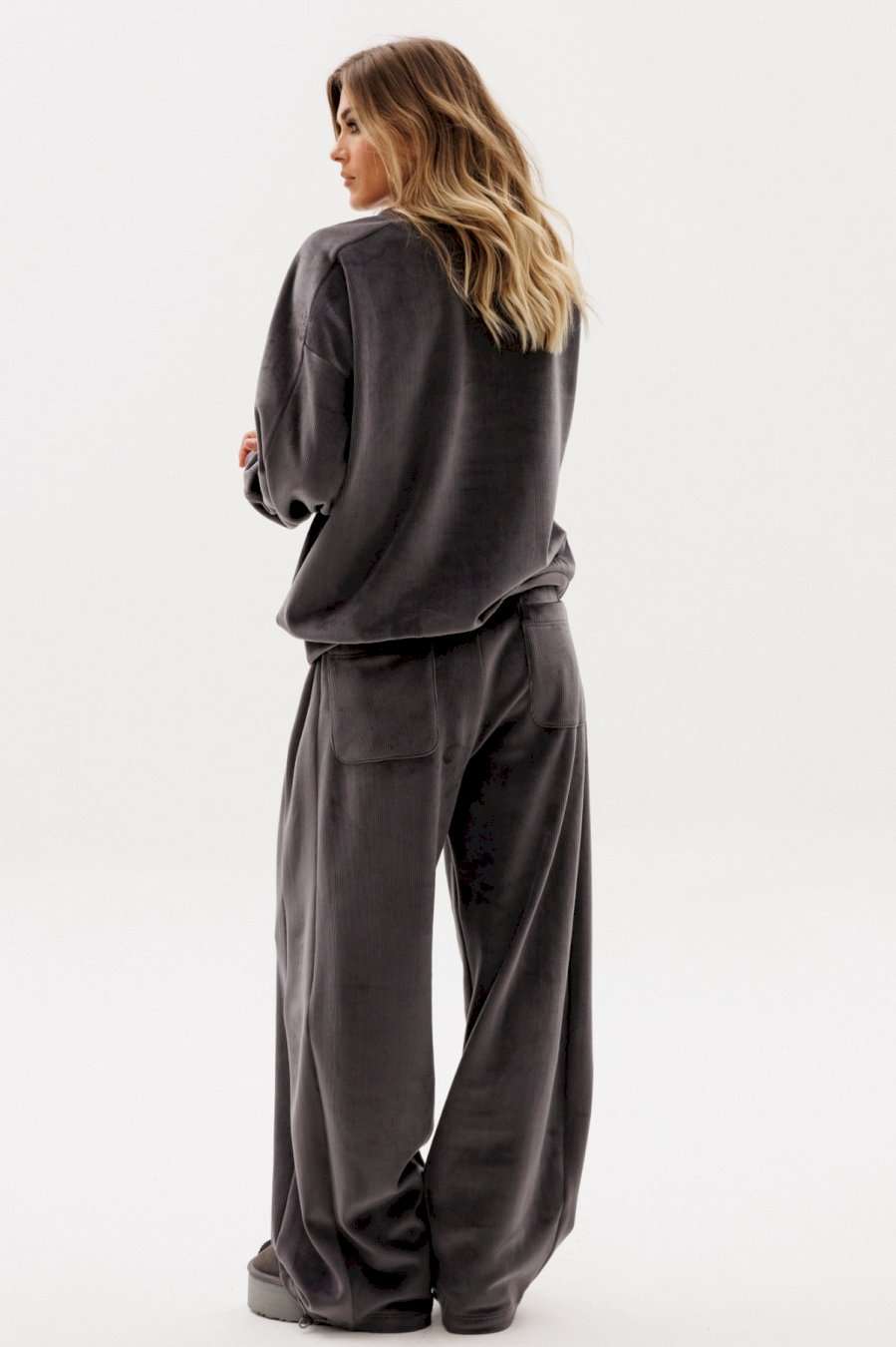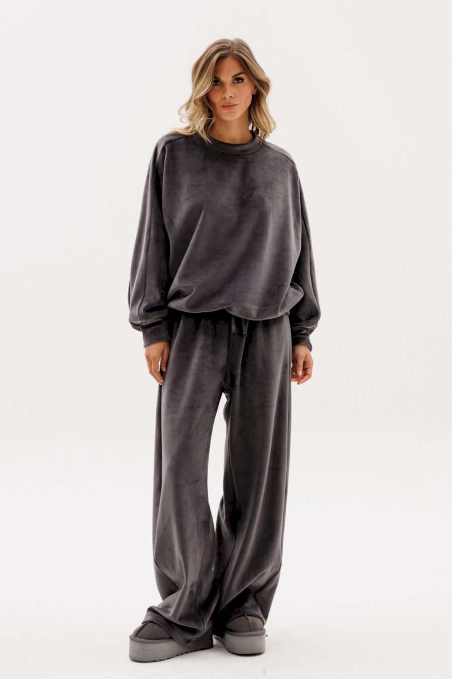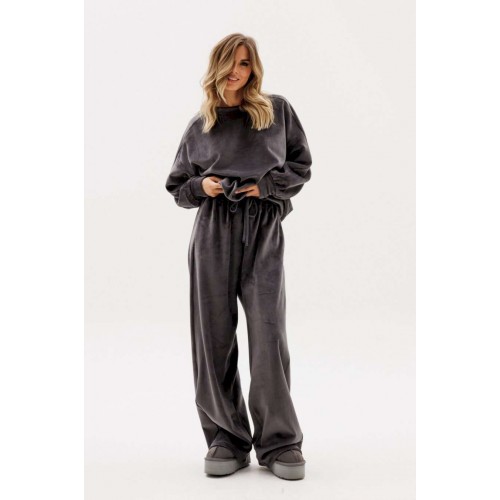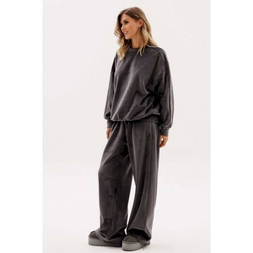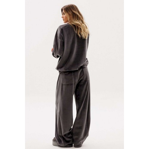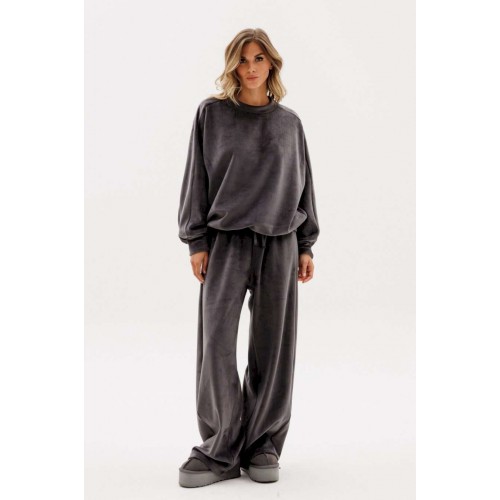 Комплект: джемпер+брюки. Комплект выполнен из двустороннего велюра в мелкий рубчик. Джемпер О-образного силуэта, покроя \"oversize\", длиной до линии бедер. Перед и спинка цельные. Горловина округлой формы, обработана бейкой. Плечевой шов удлинен. Рукав рубашечного покроя, одношовный. Низ рукава на манжете. Верхняя часть рукава переходит в кокетку переда т спинки и доходит до горловины. По низу джемпера обработан пояс. Пояс, манжеты, верхняя часть рукава и бейка горловины выполнены из основной, но без рубчика. Брюки на притачном поясе с эластичной тесьмой, прямого силуэта, длиной в пол, покроя \"oversize\". Боковой шов заменен лампасом. В швах лампаса карманы. Сзади накладные карманы. В пояс протянут шнур с наконечниками. По низу брюк втянута эластичная тесьма с фиксаторами. Лампасы и пояс выполнены из основной ткани, но без рубчика. Длина джемпера: р. 44-48 - 65 см, р. 50-54 - 66,5 см. Длина рукава от горловины: р. 44-48 - 76 см, р. 50-54 - 77 см. Длина брюк: р.44-48 - 109 см, р. 50-54 - 110 см