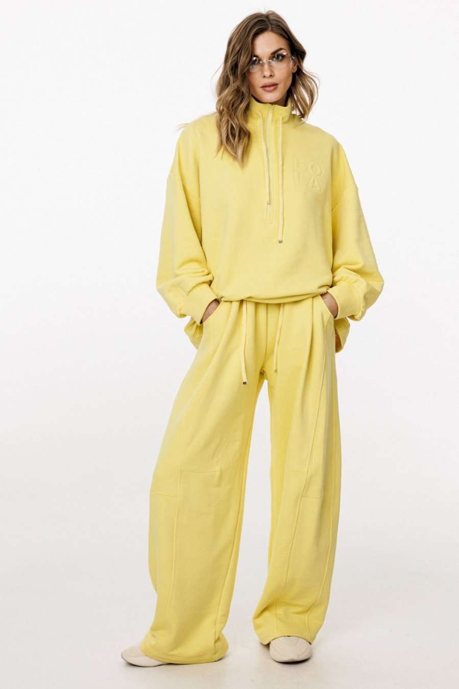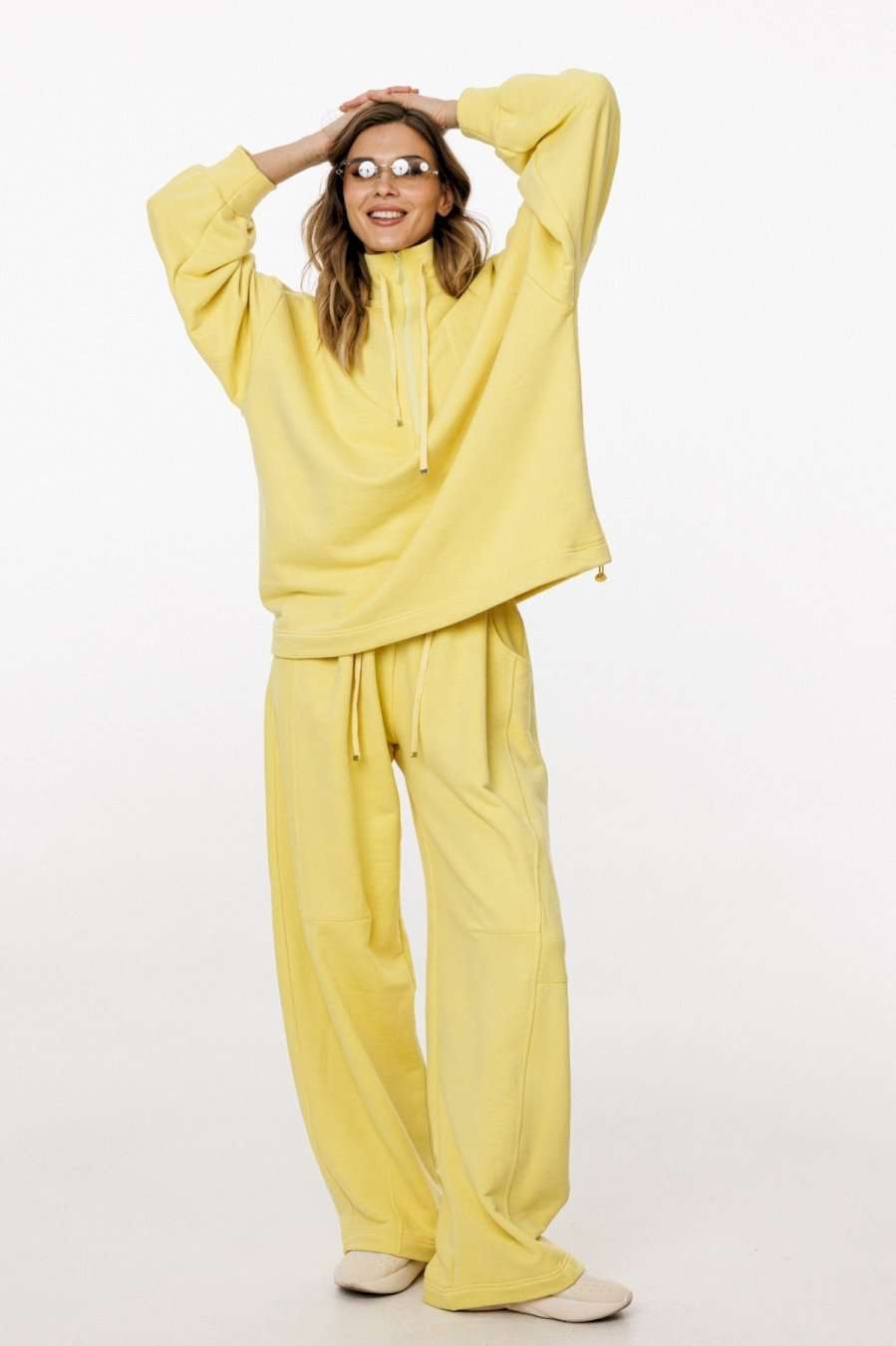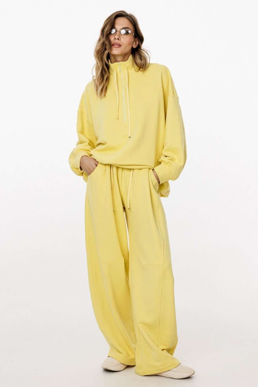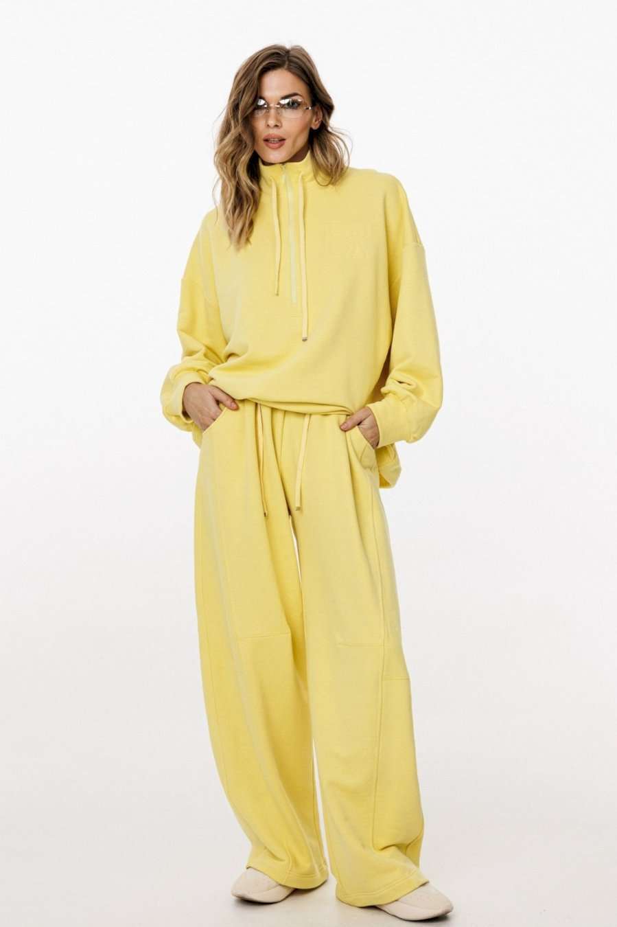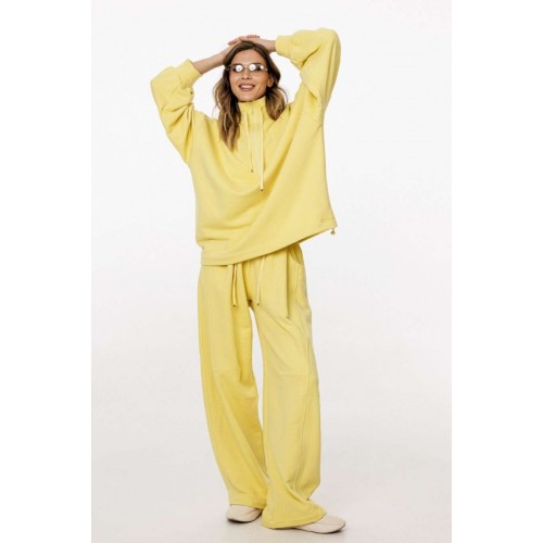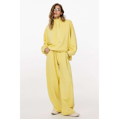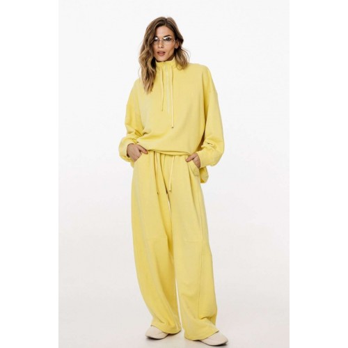 Комплект: джемпер+брюки. Комплект выполнен из трикотажного полотна. Джемпер прямого силуэта, покроя "oversize" длиной до линии бедер. Спереди застежка на молнию. Воротник-стойка. Плечевой шов удлинен. Рукав рубашечного покроя, одношовный, расширенный и присборенный к низу. Низ рукава на притачной манжете. Низ джемпера на эластичной тесьме с фиксаторами. Джемпер декорирован вышивкой по переду. Брюки прямого силуэта, длиной в пол, на притачном поясе с эластичной тесьмой. Спереди боковые карманы с фигурным входом, петли в поясе, в которые втянут шнур из основной ткани, коленные вытачки, складки. Сзади справа накладной карман. Длина джемпера: р. 44-48 - 68,5 см, р. 50-54 - 70 см. Длина рукава от горловины: р. 44-48 - 77,5 см, р. 50-54 - 78,5 см. Длина брюк: р. 44-48 - 107 см, р. 50-54 - 108,5 см. КОМПЛЕКТ м. 3048 44 46 48 50 52 54 ДЖЕМПЕР Длина по центру спинки 69 69 69 70,5 70,5 70,5 Длина рукава от горловины 76,5 76,5 76,5 78 78 78 Объем по груди 139 143 147 151 155 159 Объем по талии 132 136 140 144 148 152 Объем по низу 126 130 134 138 142 146 Объем рукава вверху 56 58 60 60 62 64 Объем рукава внизу 22 22 22 24 24 24 БРЮКИ Длина сбоку с поясом 113 113 113 114 114 114 Объем по талии 62/96 66/100 70/104 74/108 78/112 82/116 Объем по бедрам 124 128 132 136 140 144 Ширина пояса 5,3 5,3 5,3 5,3 5,3 5,3