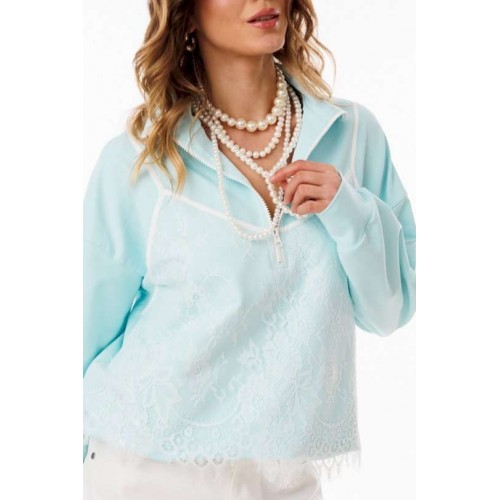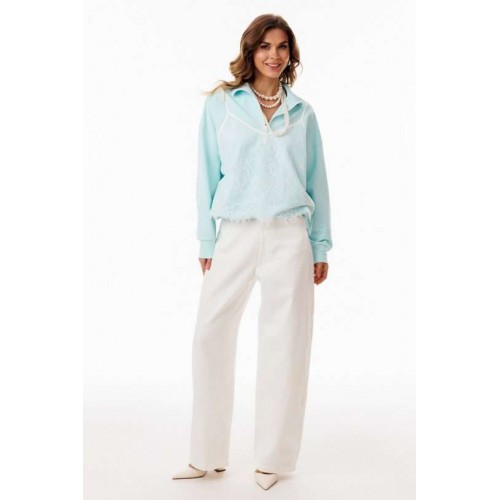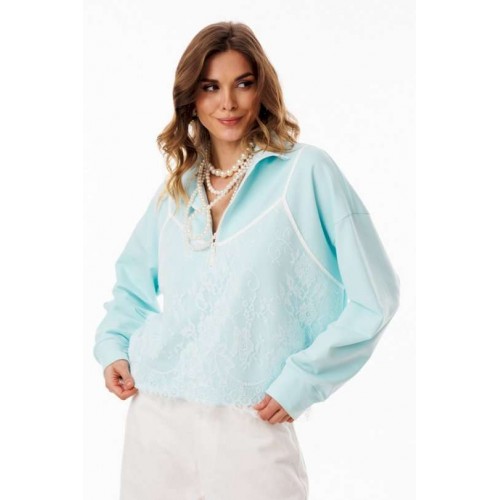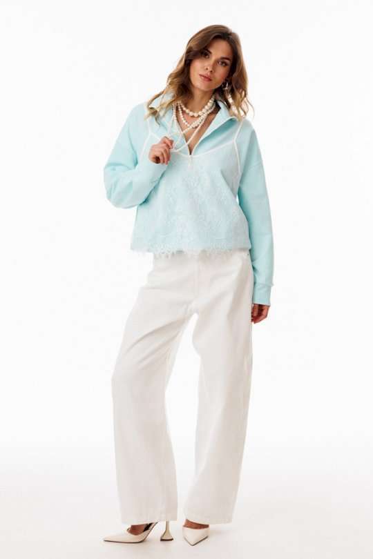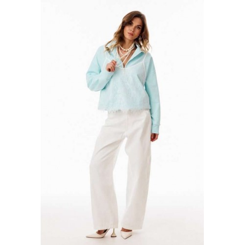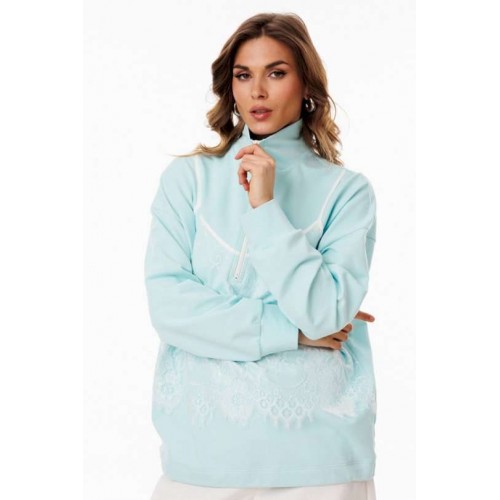 Джемпер выполнен из трикотажного полотна. Джемпер прямого силуэта, покроя oversize. Длиной до линии бедер. По переду обработана застёжка на тракторную молнию от линии груди до верха. Горловина округлой формы, обработана воротником стойкой. Плечевой шов удлинен. Рукав рубашечного покроя, одношовный. Низ рукава обработан притачной манжетой. По низу джемпера обработана эластичная тесьма с фиксаторами. Джемпер декорирован по переду кружевом, имитирующим перед топа на бретелях. Длина джемпера: р. 44-48 - 69,5 см, р. 50-54 - 70,5 см. Длина рукава от горловины: р. 44-48 - 77 см, р. 50-54 - 78 см. ДЖЕМПЕР м. 3056 44 46 48 50 52 54 Длина по центру спинки 69,5 69,5 69,5 70,5 70,5 70,5 Длина рукава от горловины 77 77 77 78 78 78 Объем по груди 134 138 142 146 150 154 Объем по талии 124 128 132 136 140 144 Объем по низу 110 114 118 122 126 130 Объем рукава вверху 42 44 46 46 48 50 Объем рукава внизу 21,5 21,5 21,5 23,5 23,5 23,5