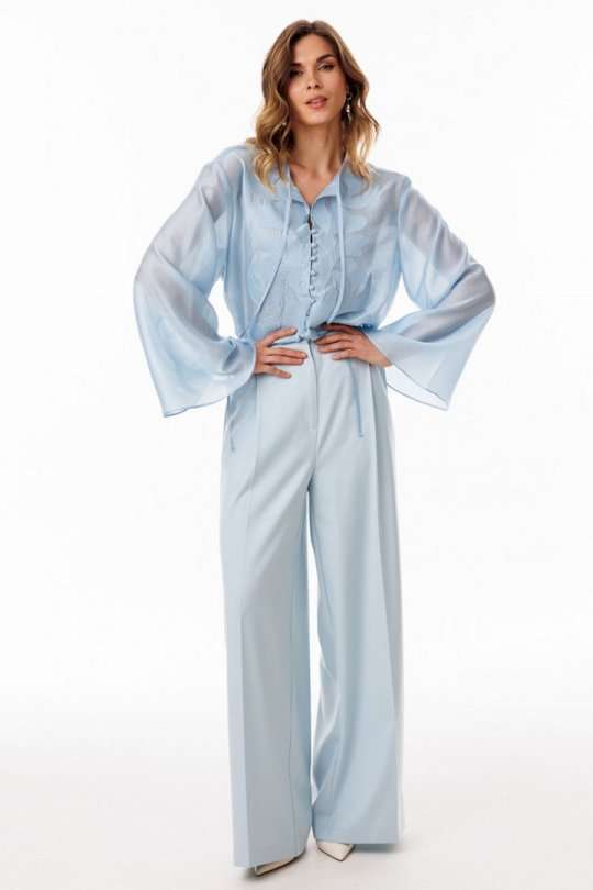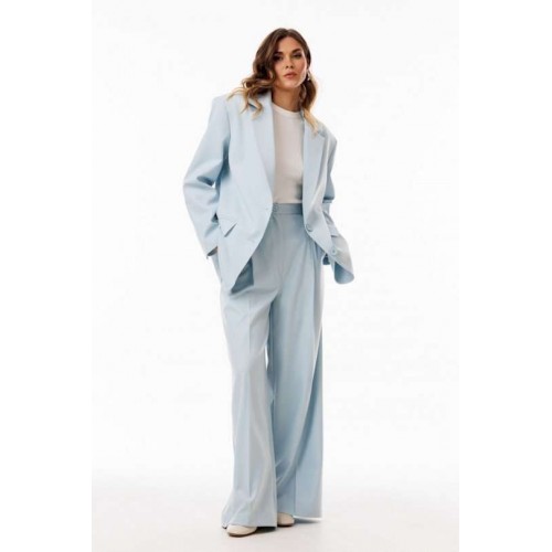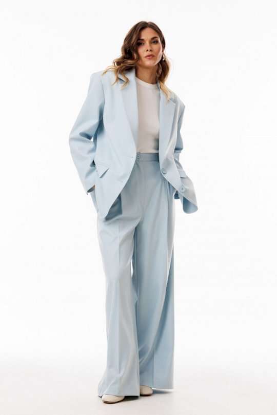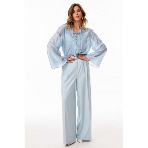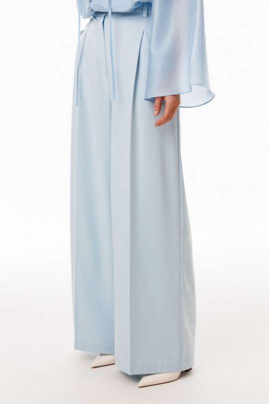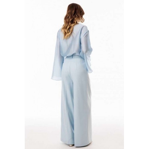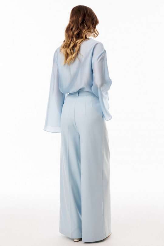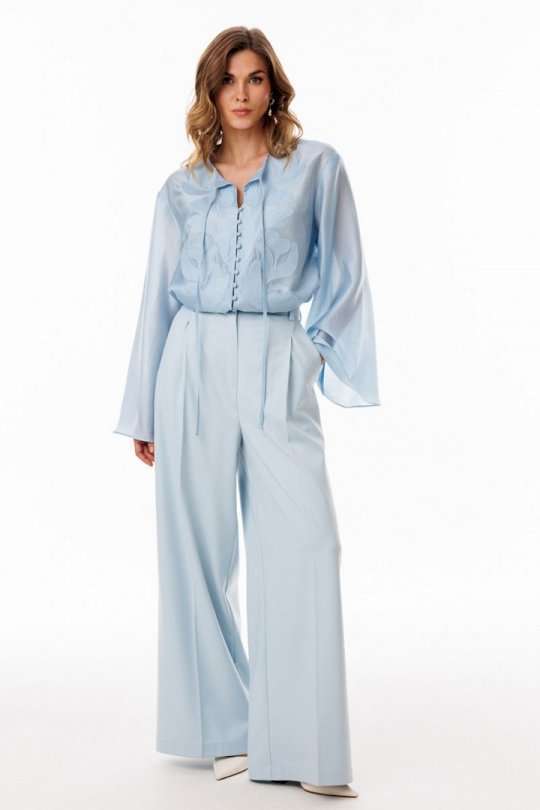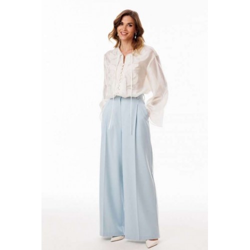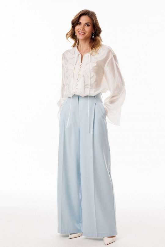 Брюки-палаццо выполнены из плательно-костюмной ткани. Брюки на притачном поясе, длиной в пол, расширенные к низу. Спереди складки и боковые карманы с наклонным входом. Застежка спереди на молнию с гульфиком и пуговицу. На задних частях обработаны талиевые вытачки. Длина брюк: р. 42-46 - 113 см, р. 48-52 - 114 см