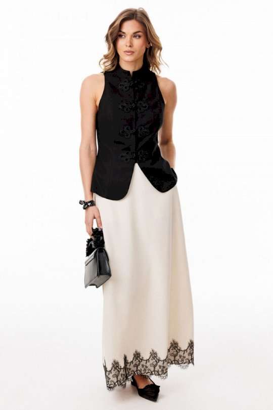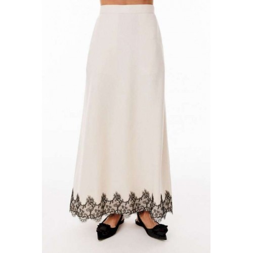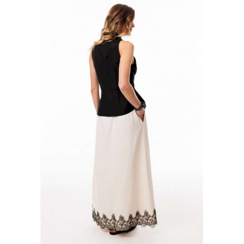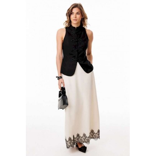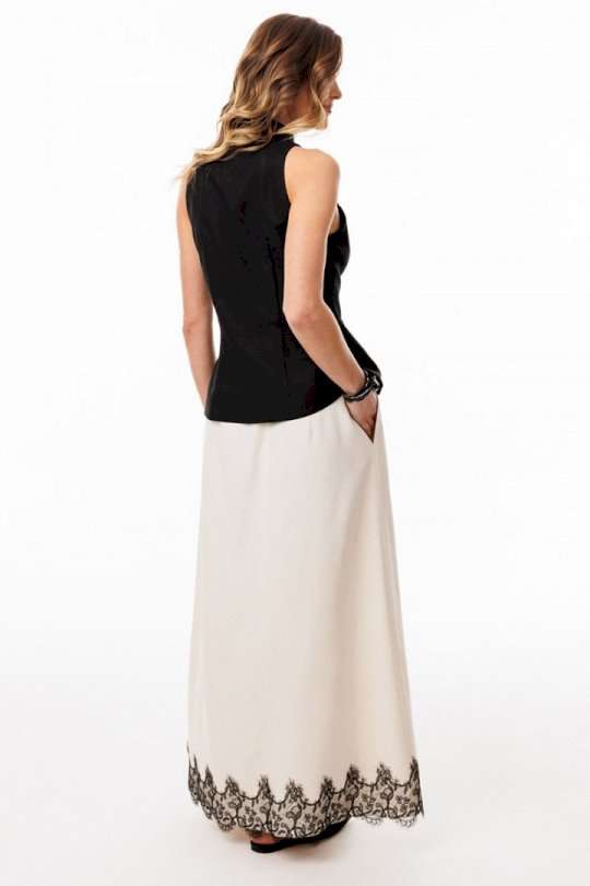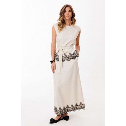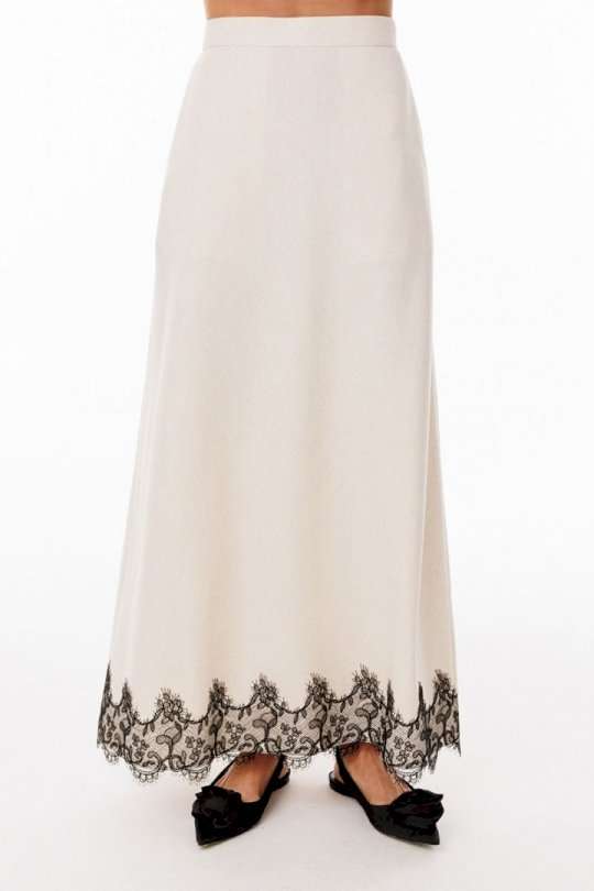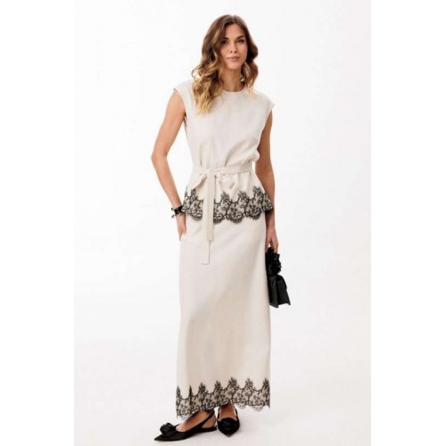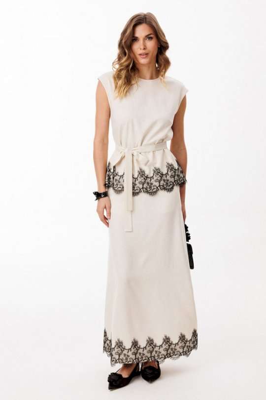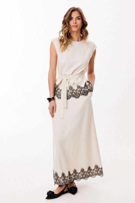 Юбка выполнена из льна. Юбка А-образного силуэта, длиной до линии щиколотки, на притачном поясе. На переднем полотнище обработаны боковые карманы с наклонным входом. На заднем полотнище обработаны талиевые вытачки и средний шов с застежкой на потайную молнию. Пояс застегивается на пуговицу. Юбка декорирована по низу настрочным кружевом. Юбка без подкладки. Длина юбки: р.44-48 - 99 см, р.50-54 - 100 см.