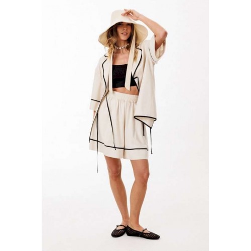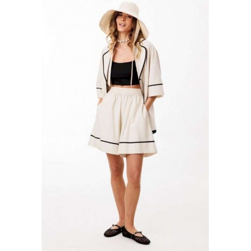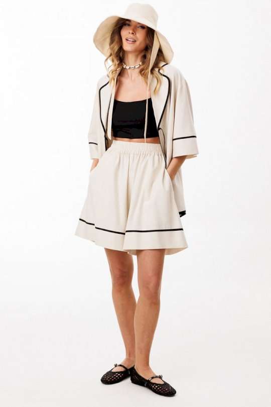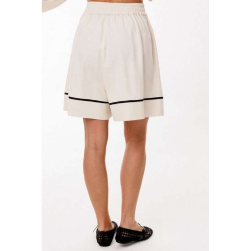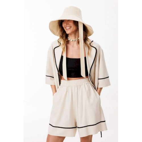 Шорты выполнены из льна. Шорты на притачном поясе с эластичной тесьмой, длиной выше линии колена. На передних и задних частях обработаны талиевые вытачки. В боковых швах обработаны карманы. Низ шорт обработан притачной манжетой с кантом из отделочной ткани. Длина шорт: р.44-48 -49 см, р.50-54 -50,5 см.
