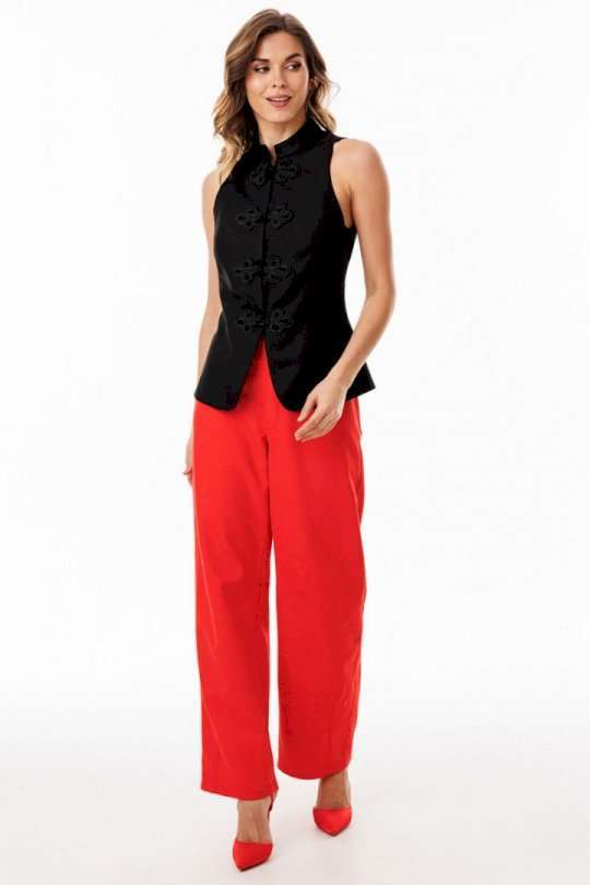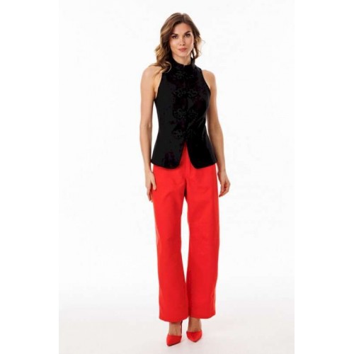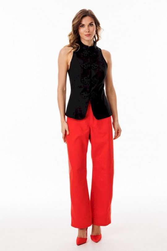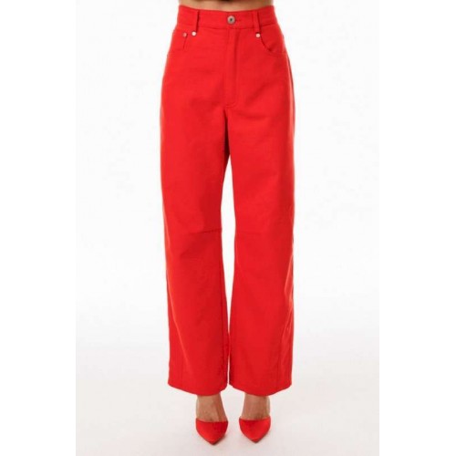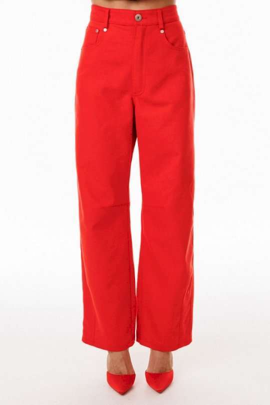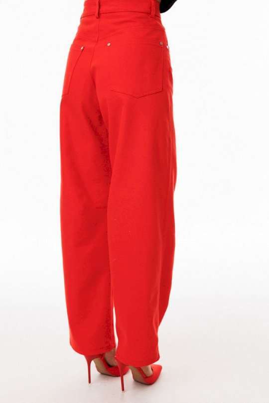 Джинсы-багги выполнены из джинса. Брюки на притачном поясе, длиной до линии щиколотки, расширенные от бедер и слегка зауженные к низу. Спереди боковые карманы с фигурным входом. Застежка на пуговицу и металлическую молнию с гульфиком. На задних частях кокетки и накладные карманы. На передней и задней части коленные вытачки. Длина брюк: р.44-48 - 102 см, р. 50-54 - 103,5 см.