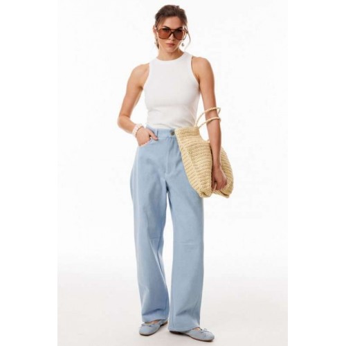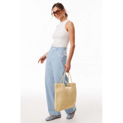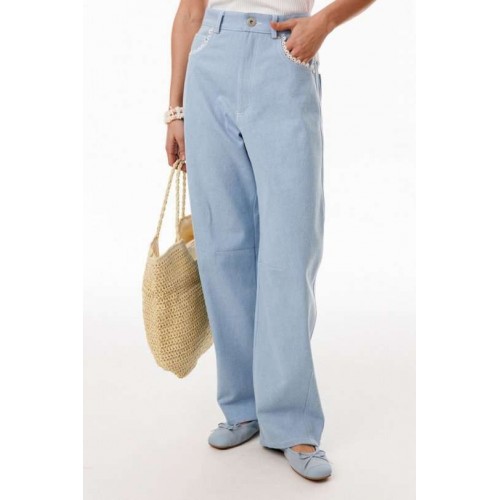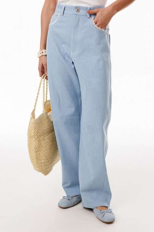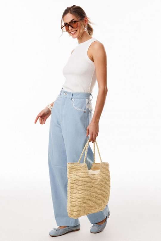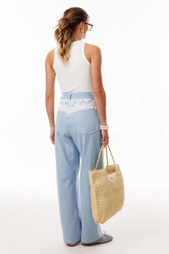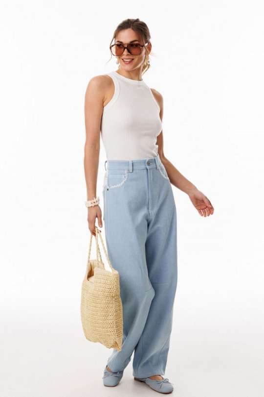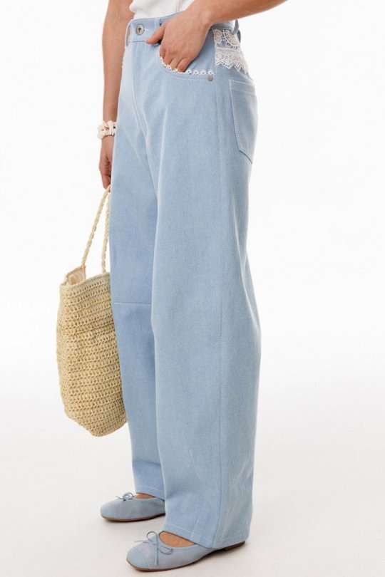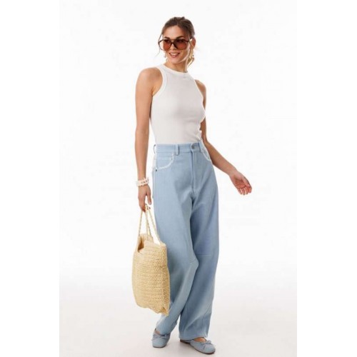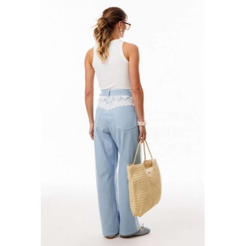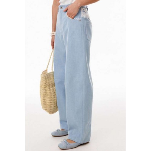 Джинсы-багги выполнены из плотного джинса. Брюки на притачном поясе, длиной до линии щиколотки, расширенные от бедер и слегка зауженные к низу. Спереди боковые карманы с фигурным входом. Застежка на пуговицу и молнию с гульфиком. На задних частях кокетки декорированы кружевом, и есть функциональные накладные карманы. На передней части брюк карманы декорированы кружевом. На передней и задней части коленные вытачки. Длина брюк: р.44-48 - 102 см, р. 50-54 - 103,5 см
