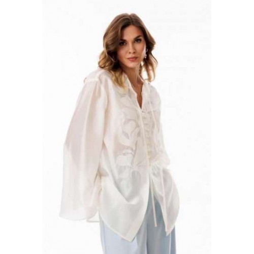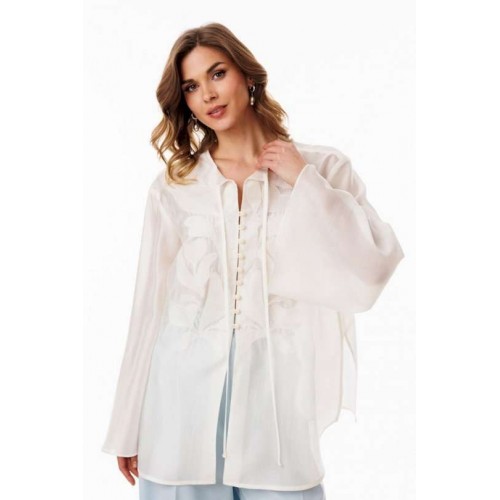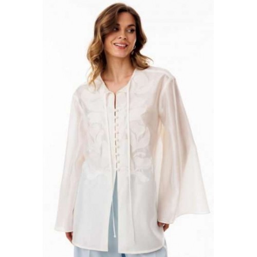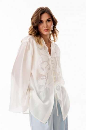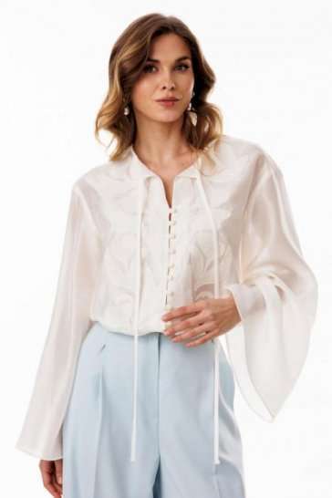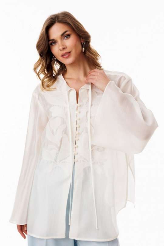Блузка выполнена из полупрозрачной плательно-блузочной ткани. Блузка А-образного силуэта, длиной ниже линии бедер. По переду обработана центральная застежка встык на навесные петли и пуговицы. Спинка цельная. Горловина округлой формы с завязками по переду. Плечевой шов удлинен. Рукав рубашечного покроя, одношовный, расширенный к низу. В боковых швах обработаны разрезы. Блузка декорирована по переду вышивкой.