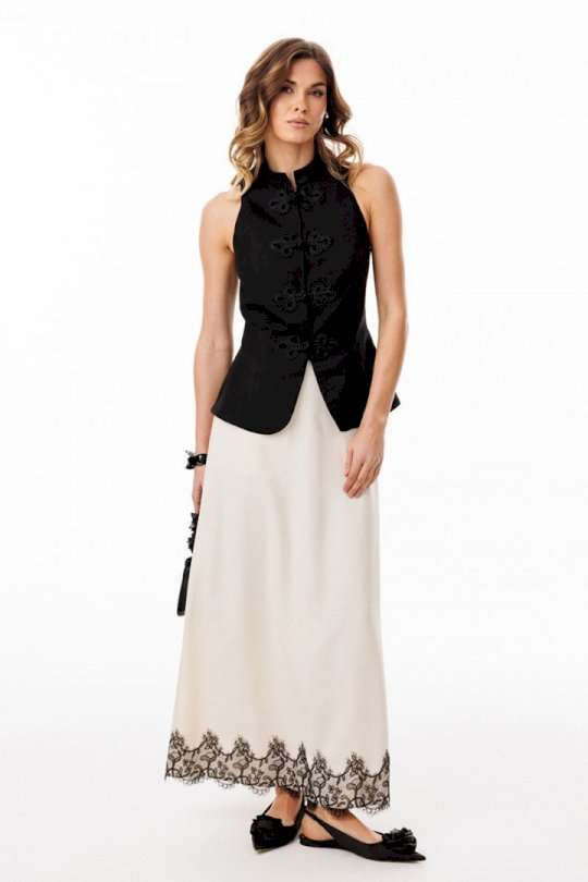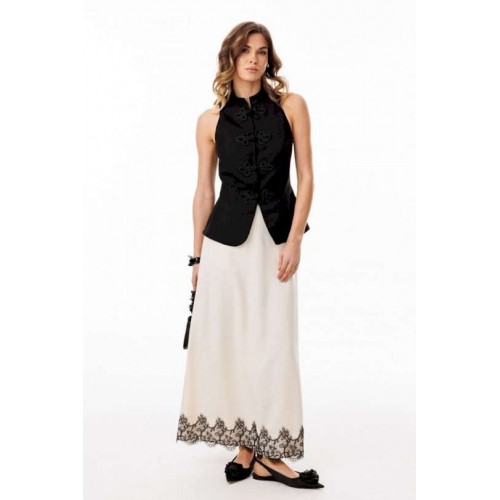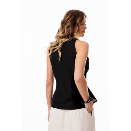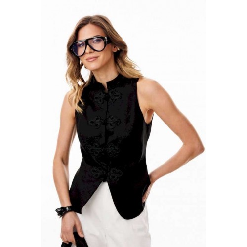 Жилет выполнен из плательно-блузочной ткани. Жилет приталенного силуэта, длиной выше линии бедер. По переду обработаны рельефы от проймы до низа, центральная застежка встык на кнопки с декоративными клевантами. Плечевой шов заужен. Горловина округлой формы, обработана воротником-стойкой. На спинке обработаны талиевые вытачки. Низ борта закругленной формы. Жилет на притачной по низу подкладке. Длина жилета по спинке: р.42-46 - 58,5 см.