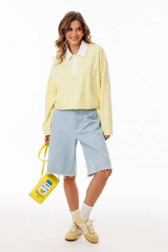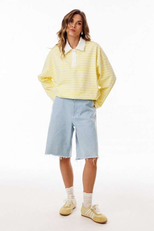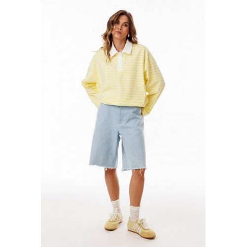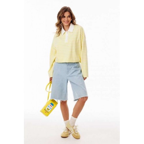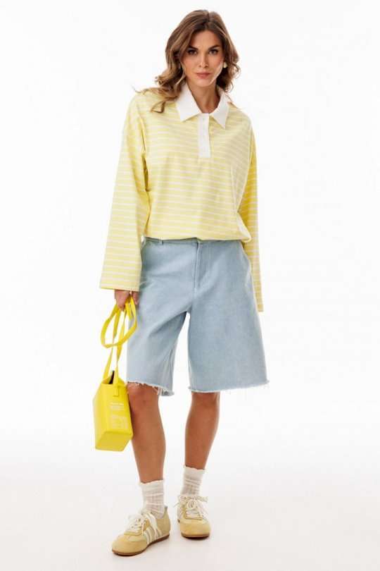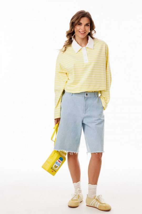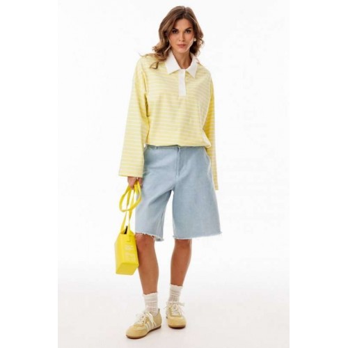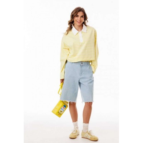 Шорты выполнены из джинса. Шорты прямого покроя, ниже линии колена, на притачном поясе. Спереди боковые карманы с наклонным входом, и застежка на молнию. На задней части кокетки и накладные карманы, и декоративная нашивка по поясу. Длина шорт: р. 42-46 - 59,5 см, р. 48-52 - 61 см.