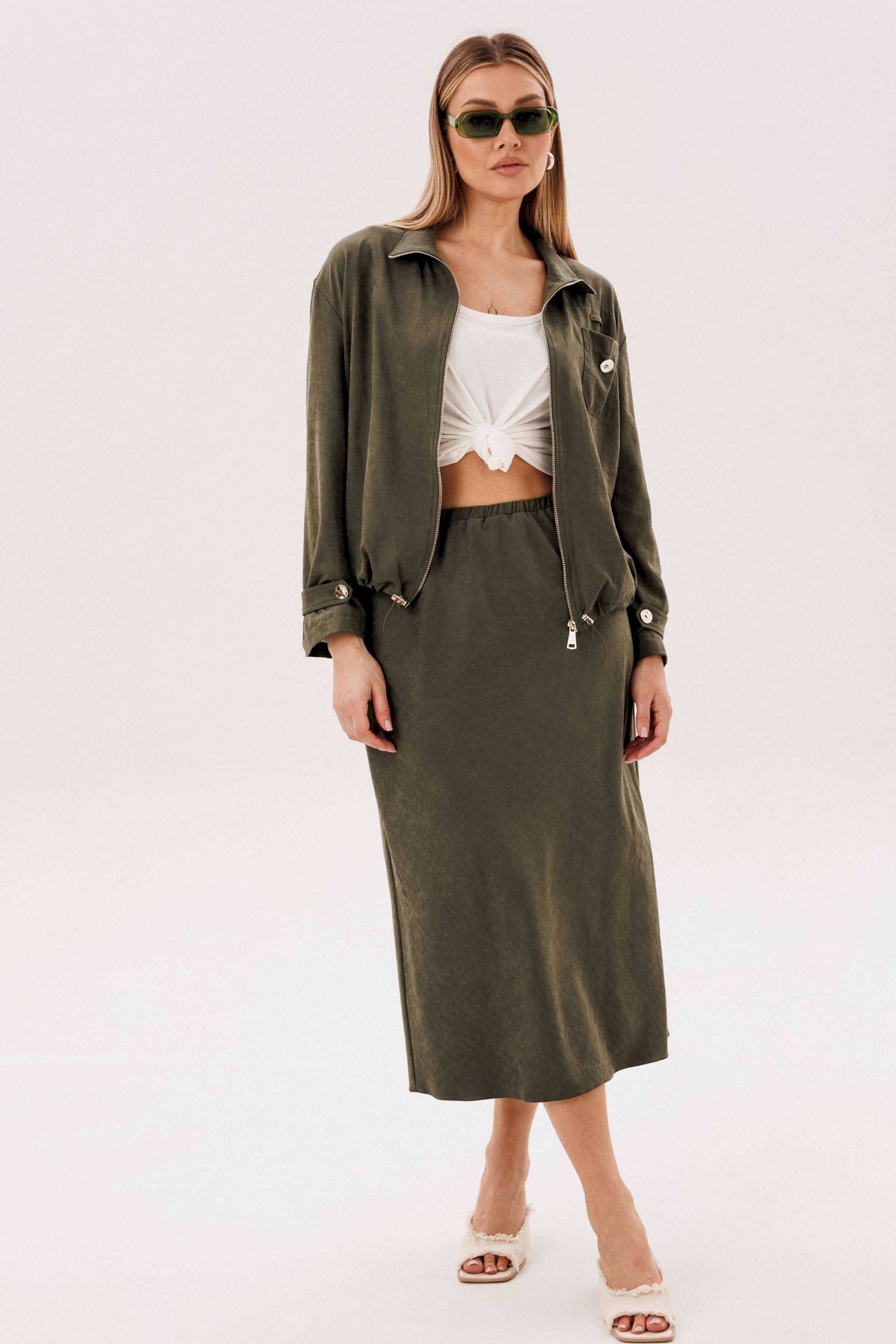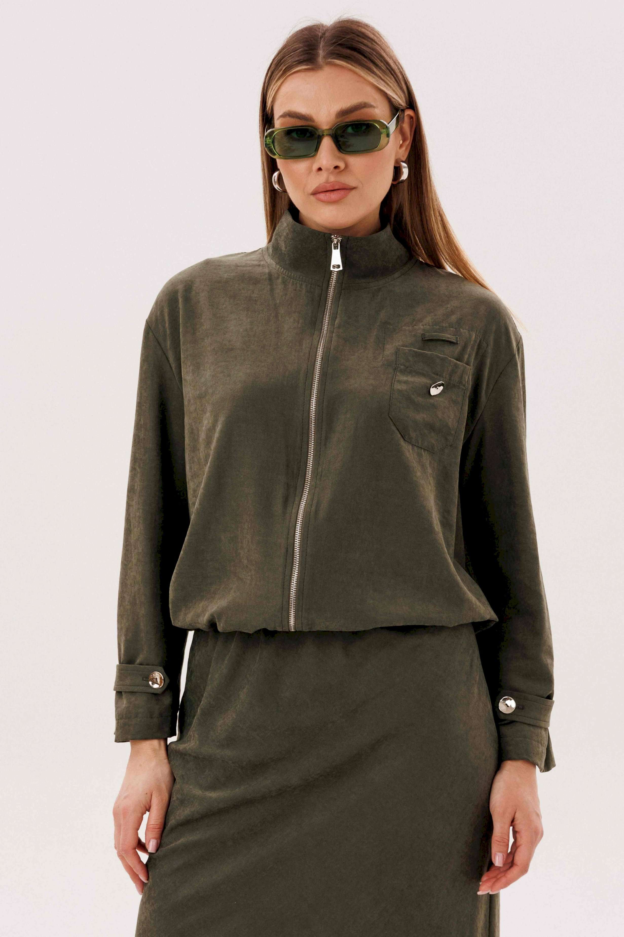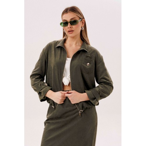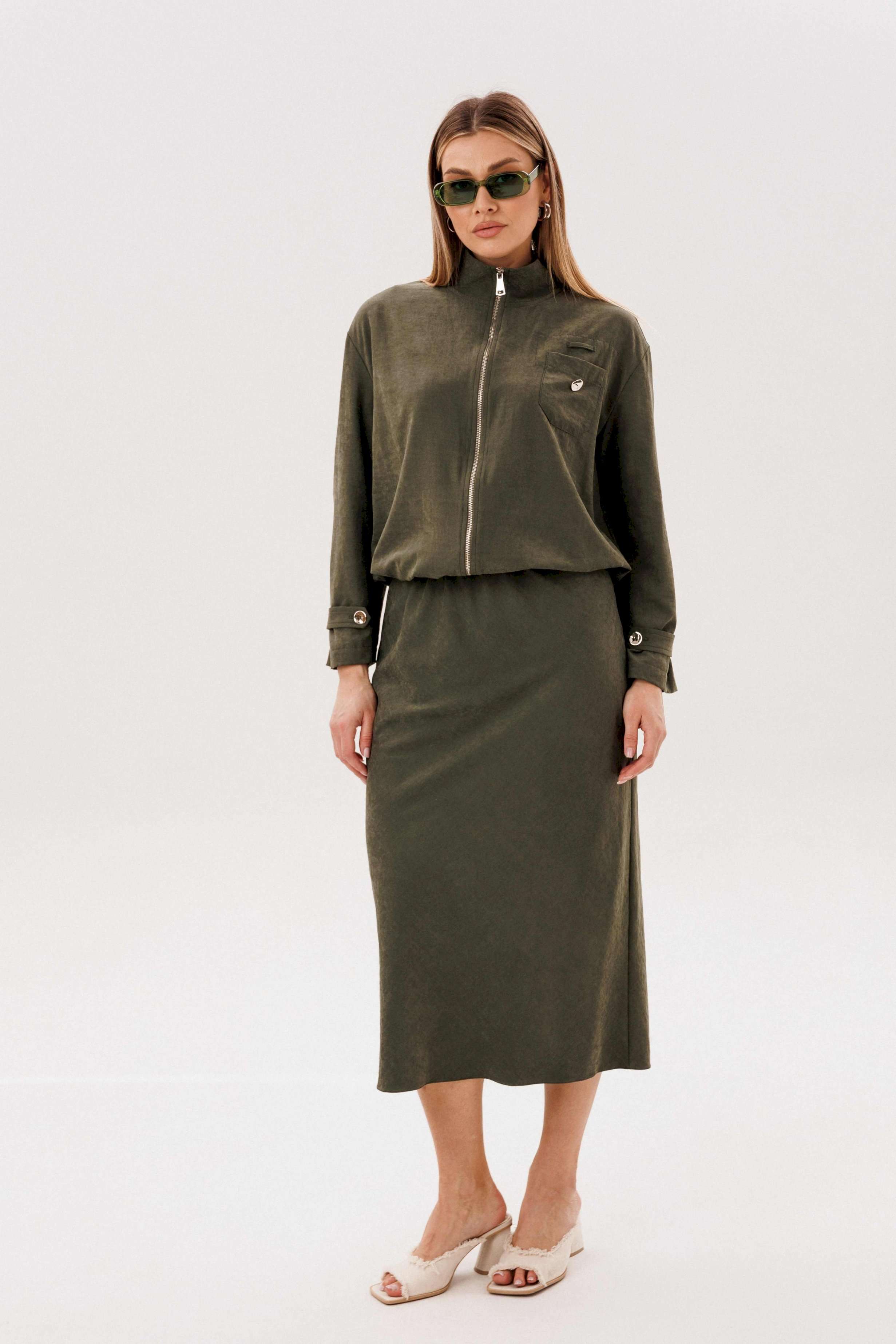 Этот вариант комплекта практически универсален, поскольку одинаково хорошо подойдет и молодым девушкам и леди элегантного возраста. Для тех, кто ищет комфортную повседневную одежду, интересную и привлекательную, модель просто идеальна. Свободная куртка на подкладке и юбка, косого кроя, из невероятного полотна с эффектом \"\"бархатистости\"\" или в народе \"\"мокрым эффектом\"\". Куртка свободного силуэта, рубашечного покроя с воротником-стойкой и центральной застежкой на тесьму-молнию. Полочка с накладным карманом в области груди. Рукав с патой на пуговице в нижней части. По низу куртки-кулиса, с эластичной тесьмой и фиксаторами. Юбка на подкладке, косого кроя, с застежкой по боковому шву на потайную молнию и пуговицу и эластичным притачным поясом. Длина куртки около 60 см. Длина рукава с плечом около 74 см. Длина юбки около 80 см.