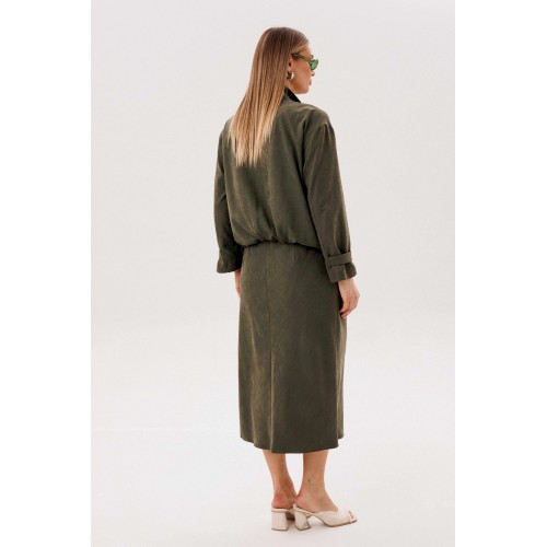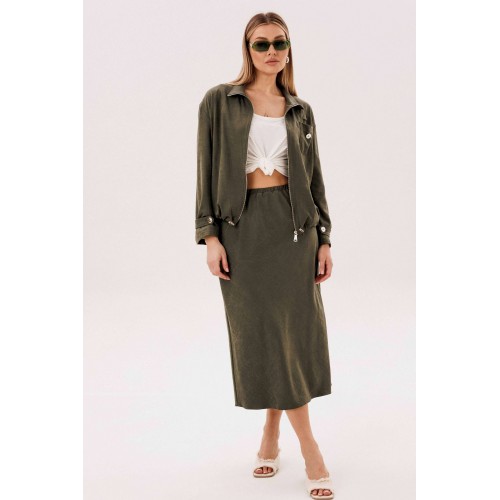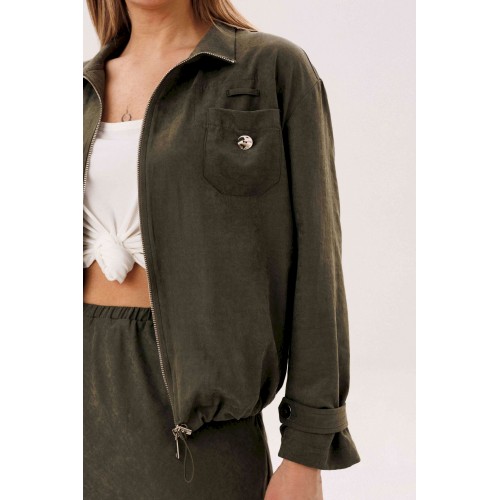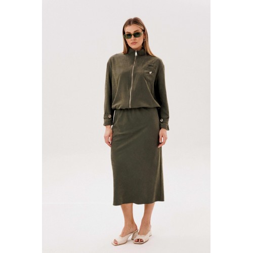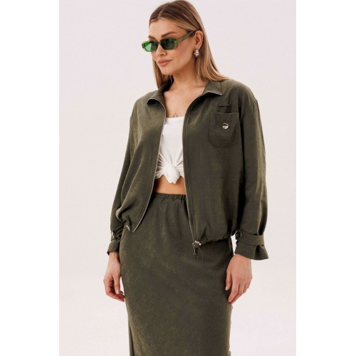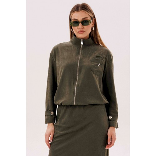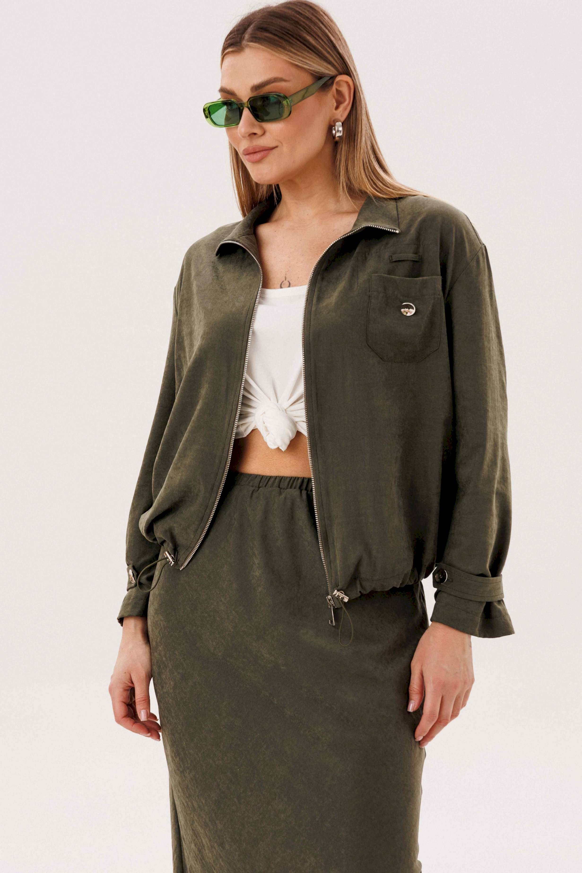 Этот вариант комплекта практически универсален, поскольку одинаково хорошо подойдет и молодым девушкам и леди элегантного возраста. Для тех, кто ищет комфортную повседневную одежду, интересную и привлекательную, модель просто идеальна. Свободная куртка на подкладке и юбка, косого кроя, из невероятного полотна с эффектом \"\"бархатистости\"\" или в народе \"\"мокрым эффектом\"\". Куртка свободного силуэта, рубашечного покроя с воротником-стойкой и центральной застежкой на тесьму-молнию. Полочка с накладным карманом в области груди. Рукав с патой на пуговице в нижней части. По низу куртки-кулиса, с эластичной тесьмой и фиксаторами. Юбка на подкладке, косого кроя, с застежкой по боковому шву на потайную молнию и пуговицу и эластичным притачным поясом. Длина куртки около 60 см. Длина рукава с плечом около 74 см. Длина юбки около 80 см.