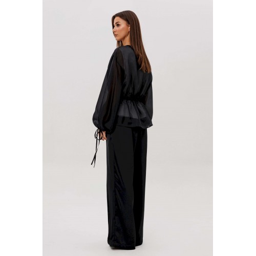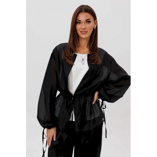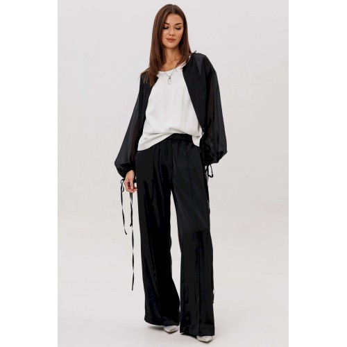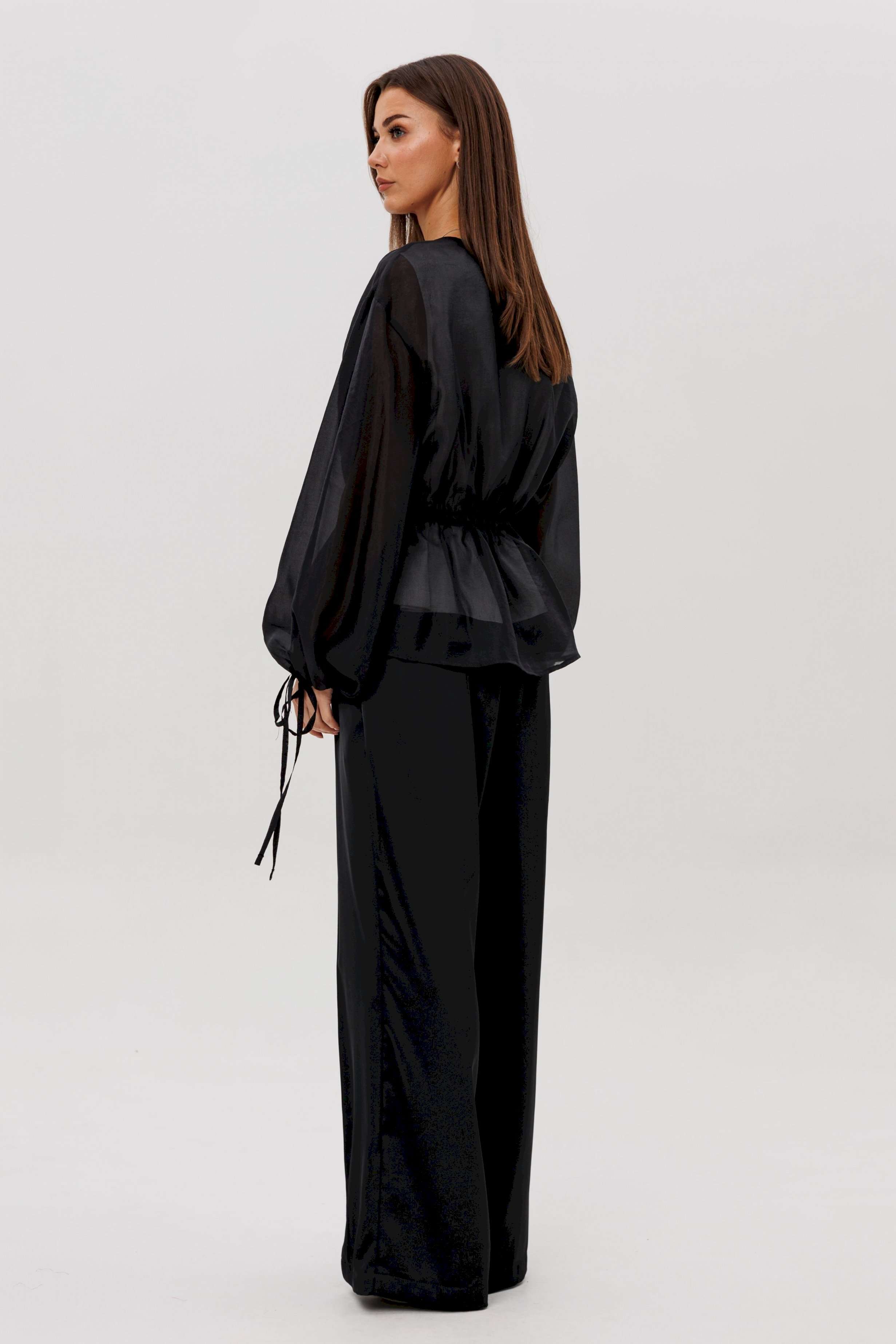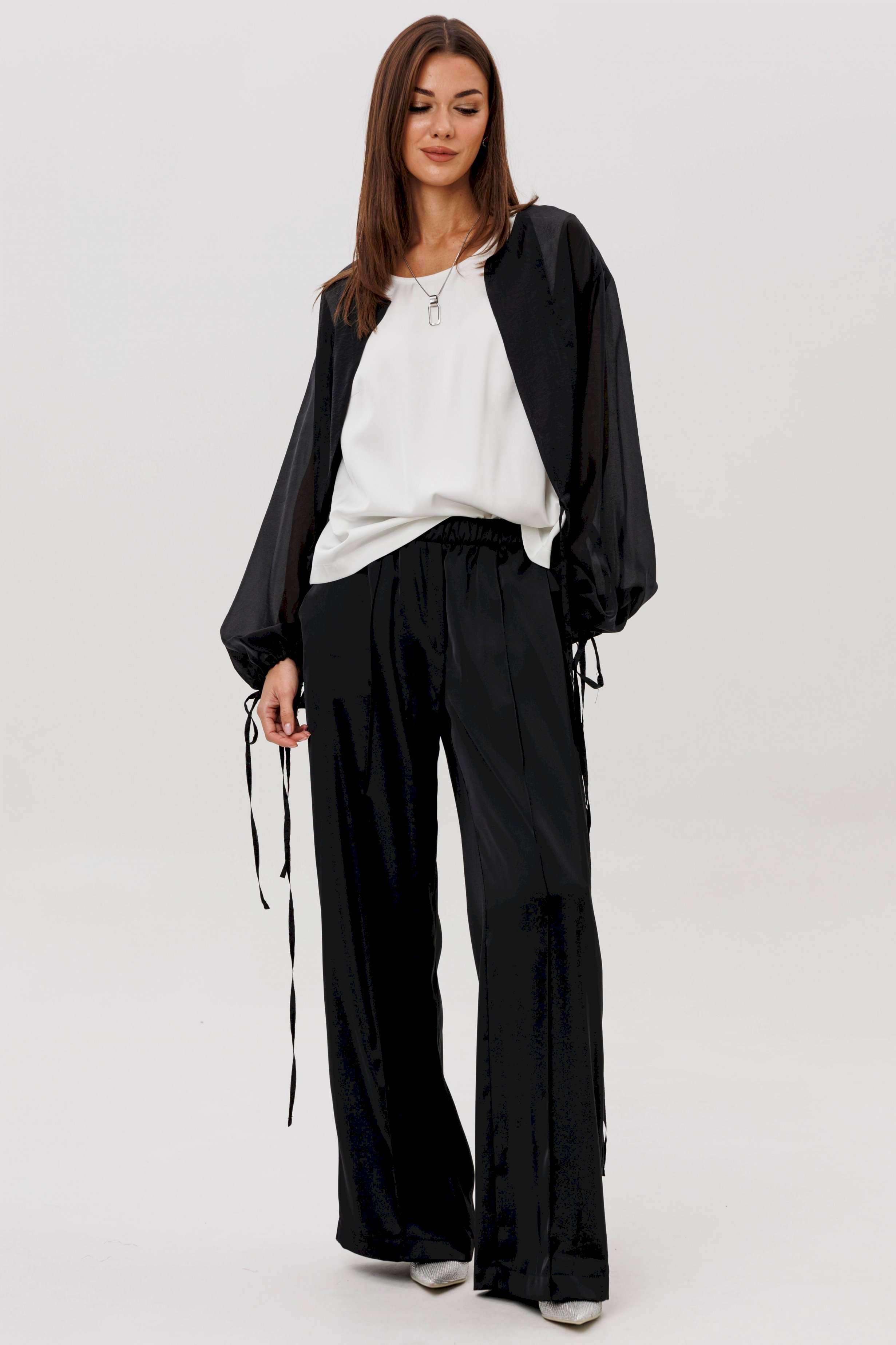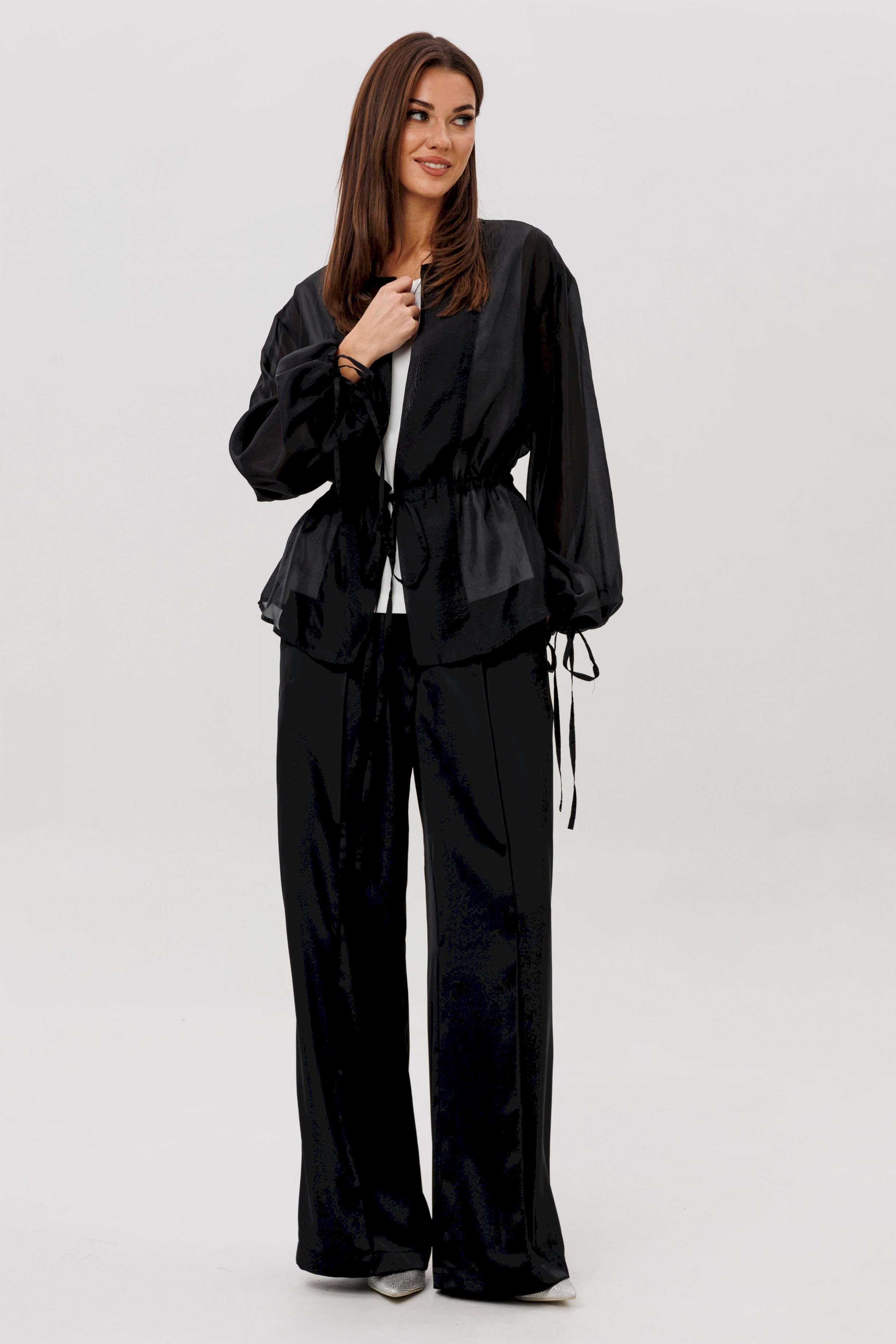 Эффектный ансамбль-тройка, в котором каждая деталь работает на утончённый и современный образ. Полупрозрачный блузон из воздушной вискозной органзы создаёт легкую дымку и добавляет образу благородной загадочности, а акцентные завязки подчёркивают талию и делают силуэт более выразительным. Контрастный атласный топ вносит нотку сияния и гармонично освежает тёмную гамму комплекта. Широкие атласные брюки со стрелкой и комфортным эластичным поясом добавляют образу сдержанной элегантности и подчёркивают его продуманную роскошность. Такой комплект смотрится нарядно, современно и effortlessly chic — идеальный выбор для тех, кто любит сочетание лёгкости, динамики и безупречного стиля.
