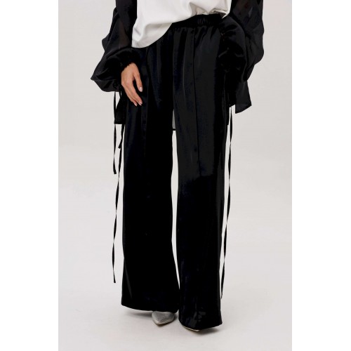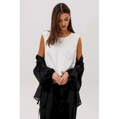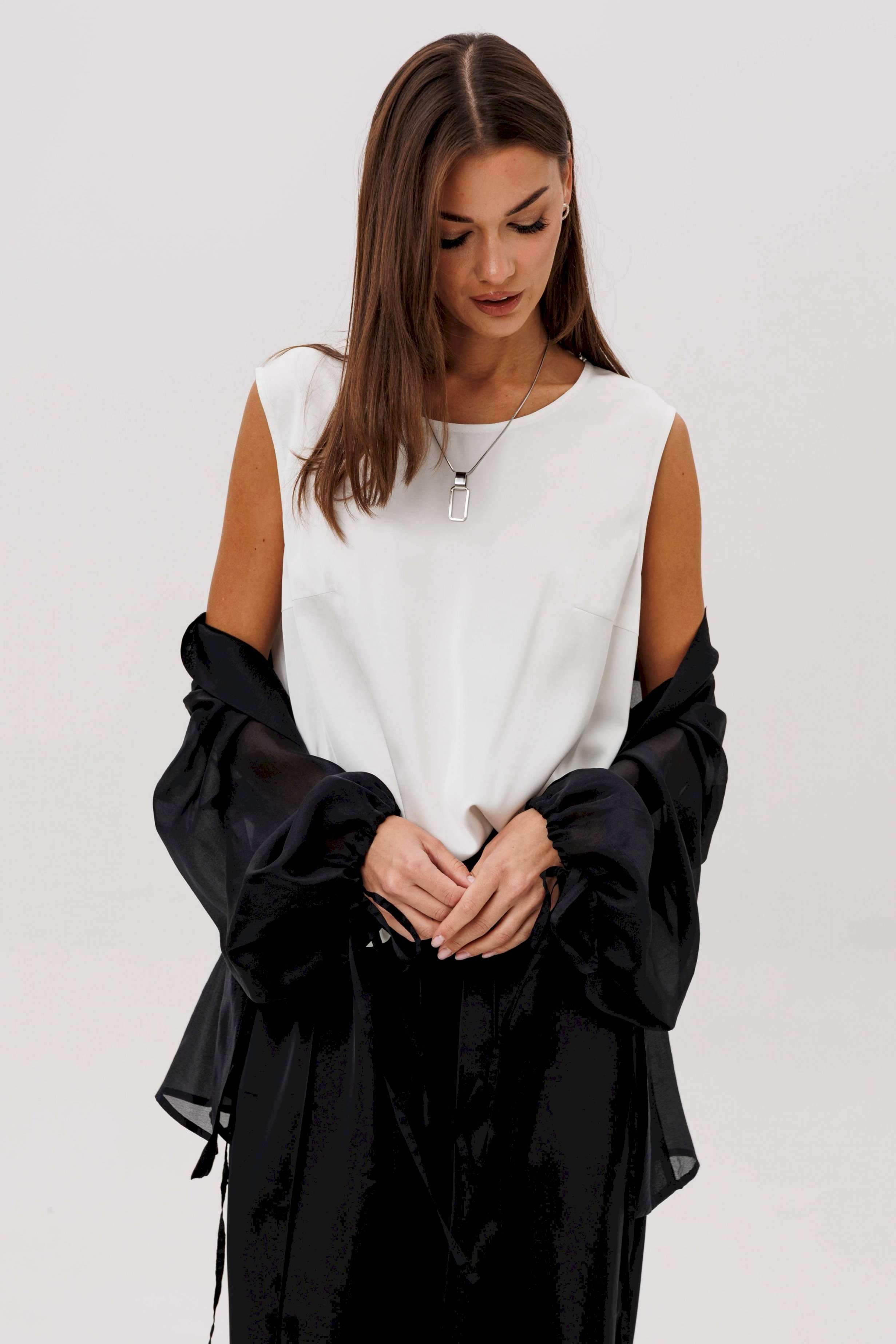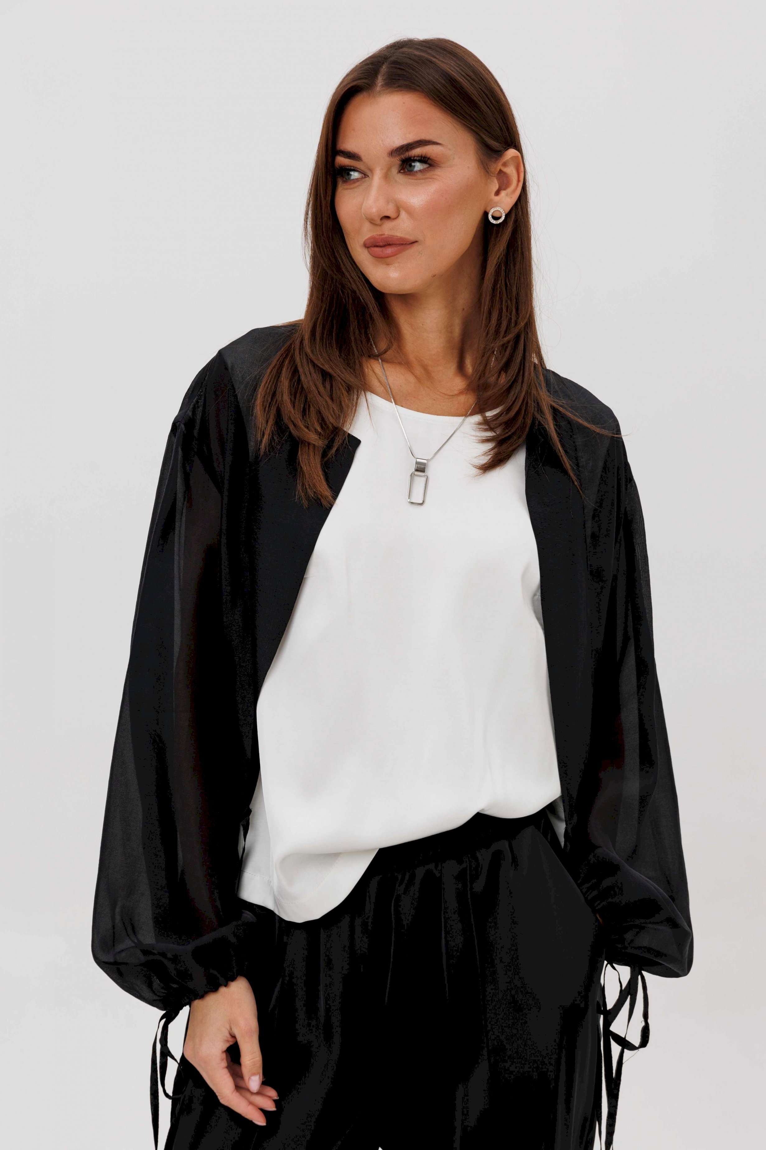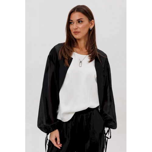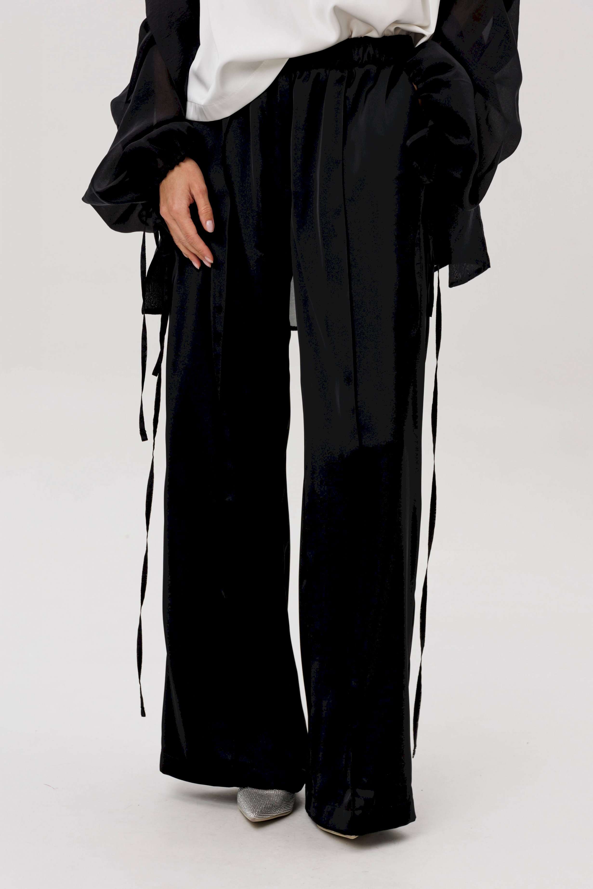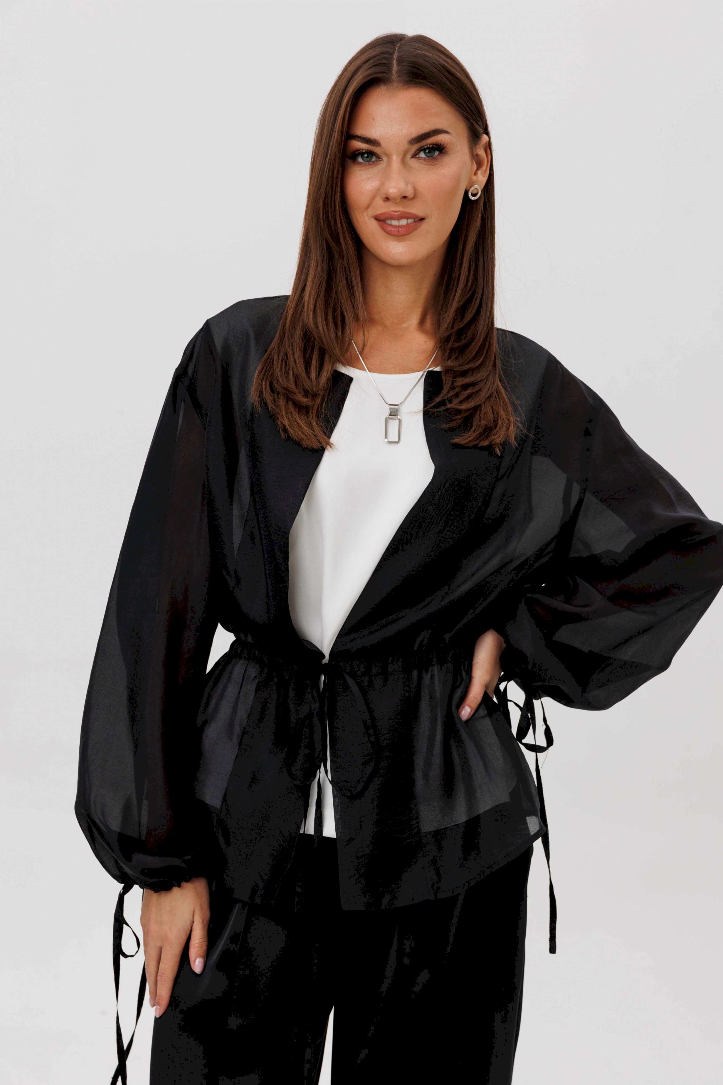 Эффектный ансамбль-тройка, в котором каждая деталь работает на утончённый и современный образ. Полупрозрачный блузон из воздушной вискозной органзы создаёт легкую дымку и добавляет образу благородной загадочности, а акцентные завязки подчёркивают талию и делают силуэт более выразительным. Контрастный атласный топ вносит нотку сияния и гармонично освежает тёмную гамму комплекта. Широкие атласные брюки со стрелкой и комфортным эластичным поясом добавляют образу сдержанной элегантности и подчёркивают его продуманную роскошность. Такой комплект смотрится нарядно, современно и effortlessly chic — идеальный выбор для тех, кто любит сочетание лёгкости, динамики и безупречного стиля.