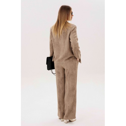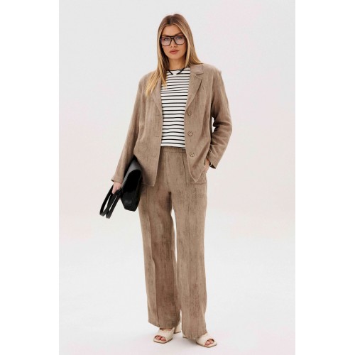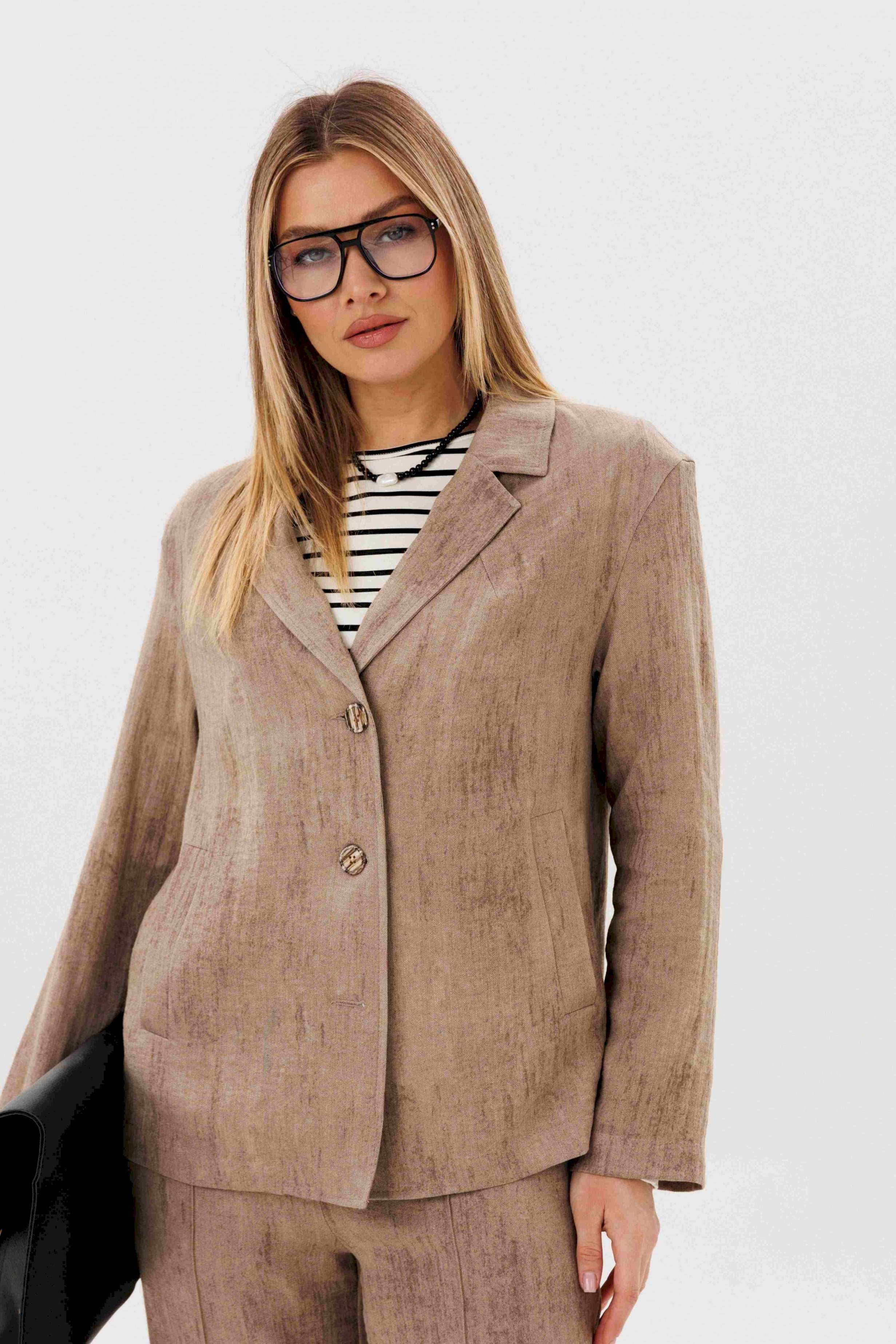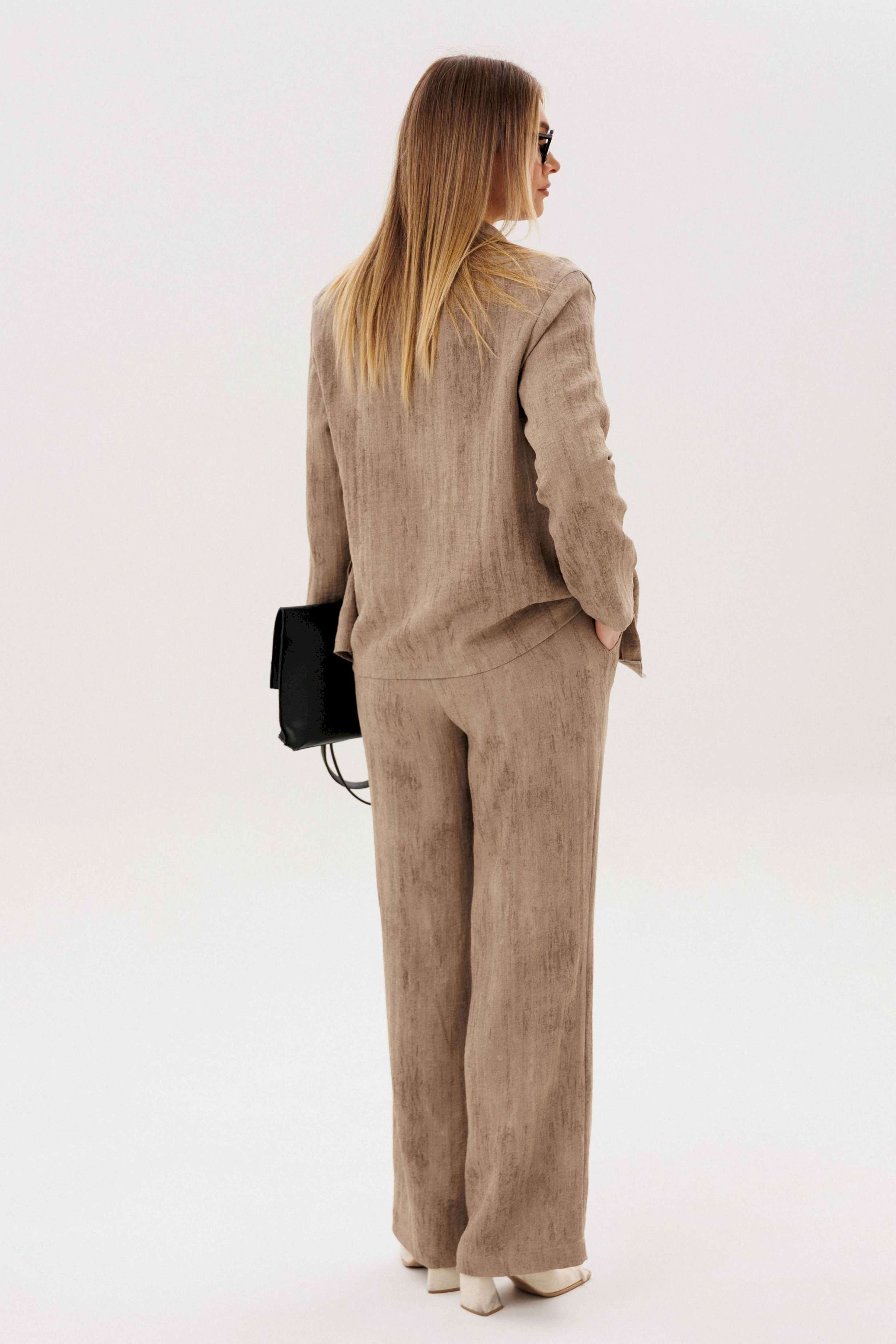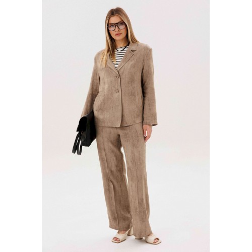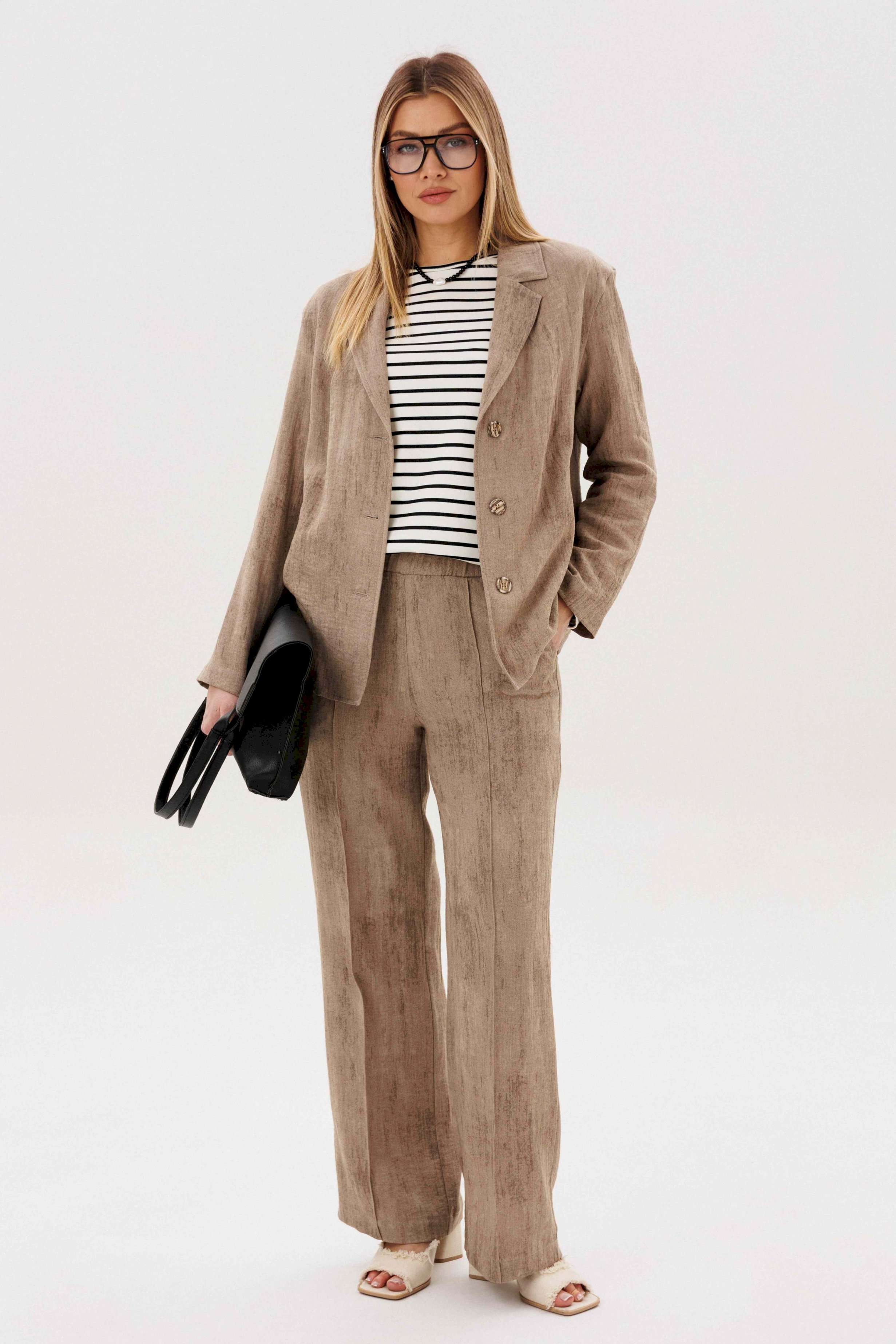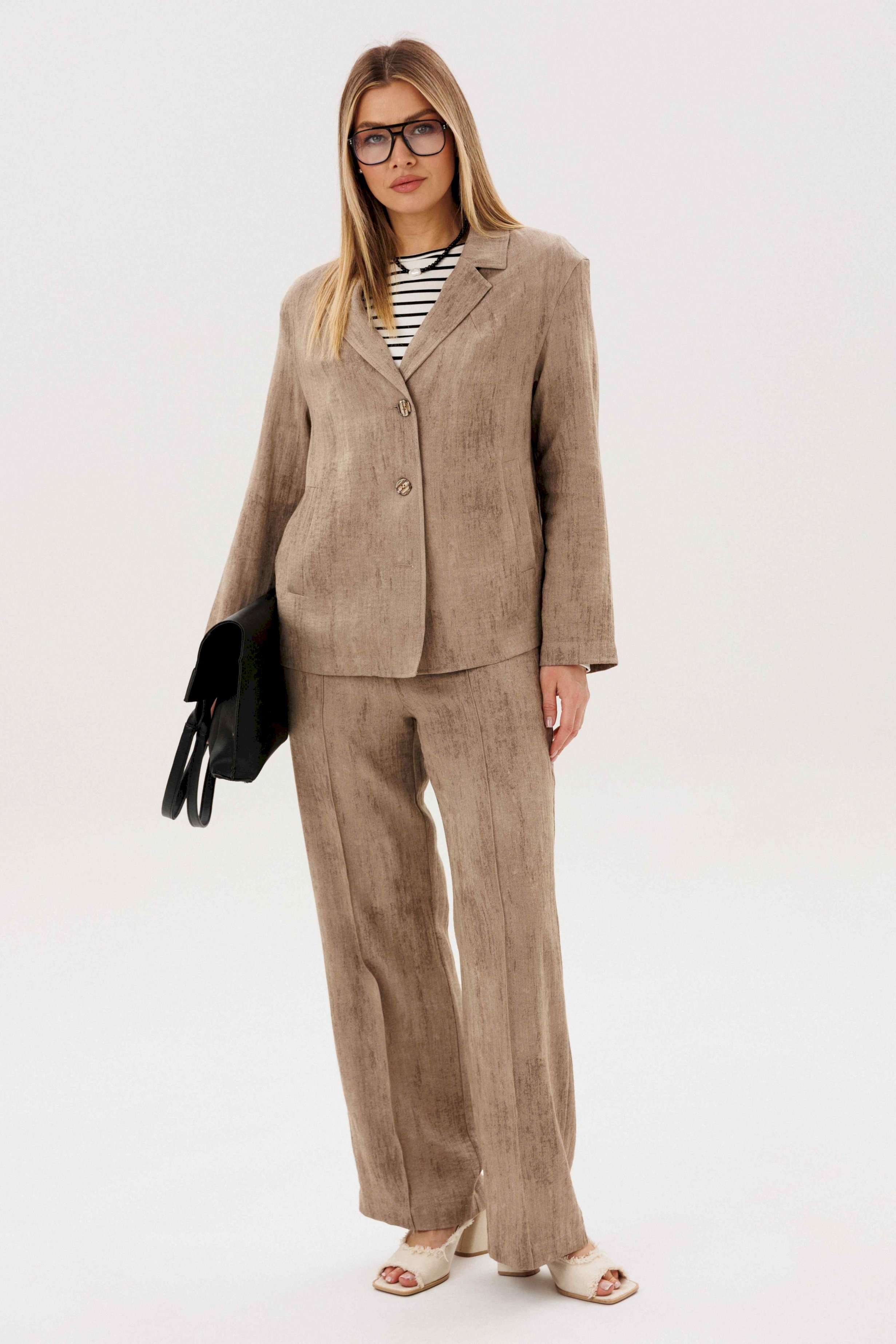 Элегантный брючный комплект — универсальная база для стильных повседневных и деловых образов. Современный крой и продуманное сочетание фактур создают сбалансированный силуэт с лёгким акцентом на актуальные тренды. В комплект входит: Свободный жакет прямого кроя с классическим лацканом и застёжкой на пуговицы Широкие брюки с комфортной посадкой и мягкой линией талии Трикотажный лонгслив в контрастную полоску Жакет и брюки формируют лаконичный, структурированный силуэт, визуально вытягивая фигуру. Широкий крой брюк добавляет образу динамики и обеспечивает свободу движений. Лонгслив из мягкого трикотажа с горизонтальной полоской освежает комплект и делает его менее формальным. Эластичная ткань приятна к телу и комфортна в течение всего дня. Преимущества комплекта: Актуальный oversize-силуэт Комфортный трикотажный верх Возможность носить элементы отдельно Комплект легко адаптируется под разные задачи: с кедами — для городского casual, с лоферами или обувью на каблуке — для более собранного и выразительного образа. Стиль, комфорт и функциональность — идеальный выбор для современного гардероба.
