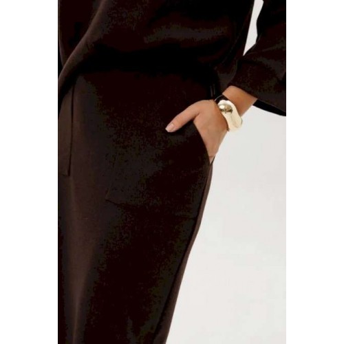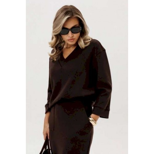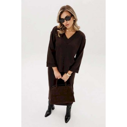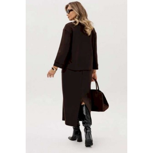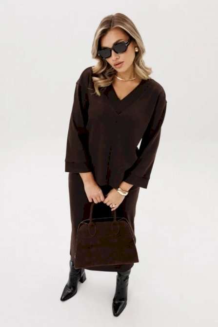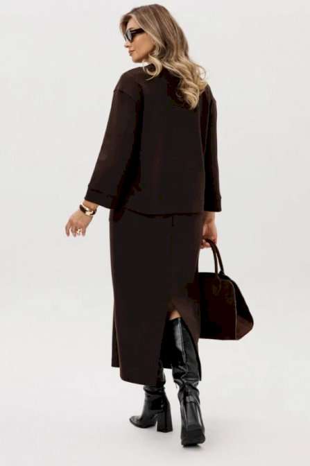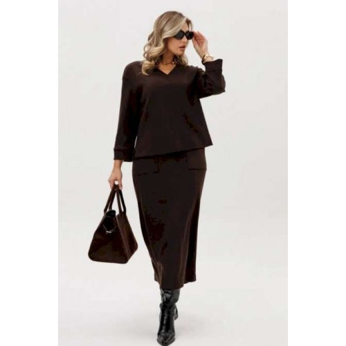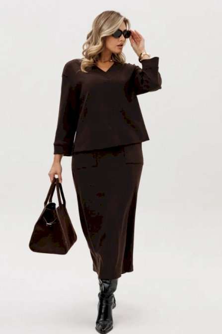 Модный \"\"must have\"\" осенне-зимнего сезона - трикотажный костюм с длинной юбкой, и эта длина - максимальна. В тандеме со слегка укороченным верхом простота и элегантность выходят на максимальный уровень. Свободный упрямлённый джемпер с заниженной линией плеча, V-образным вырезом и рукавом длиной 7/8. По горловине и низкам рукавов - отделочные полоски. Юбка макси, на притачном эластичном поясе с большими накладными карманами на переднем полотнище. Заднее полотнище с центральным швом, шлицей, талиевыми вытачками и застёжкой. Длина джемпера около 60 см, длина рукава с плечом около 68 см. Длина юбки около 90 см.