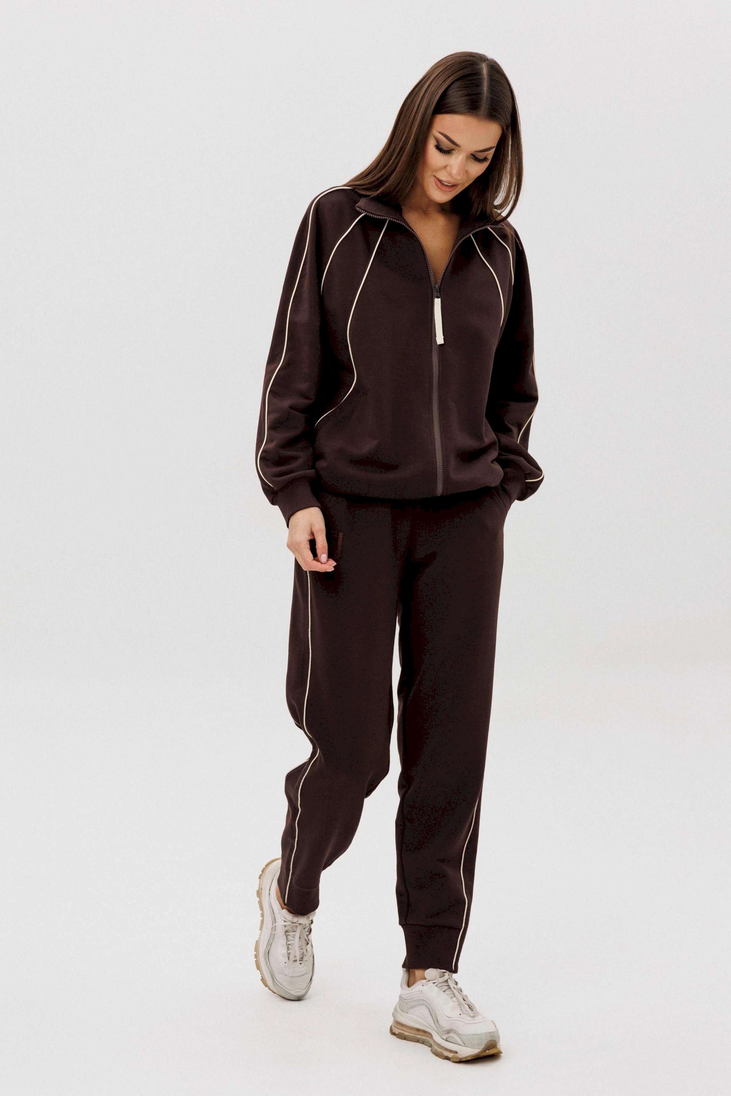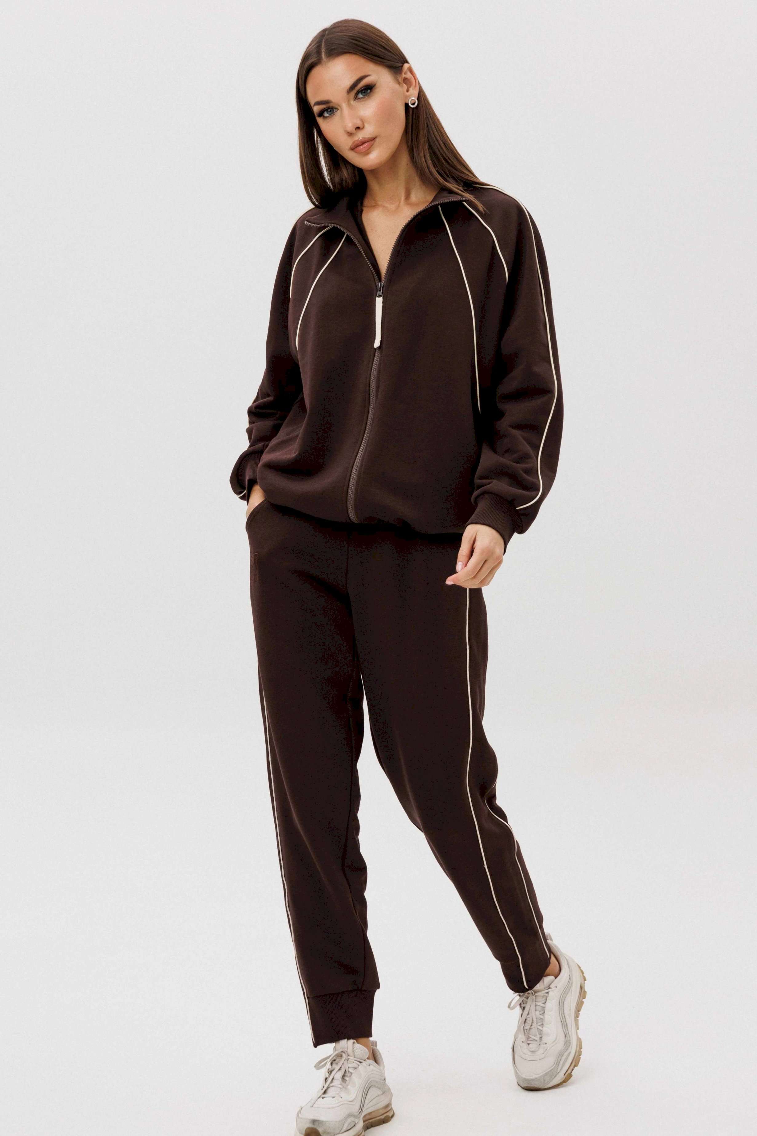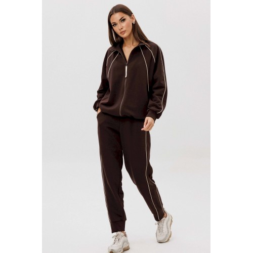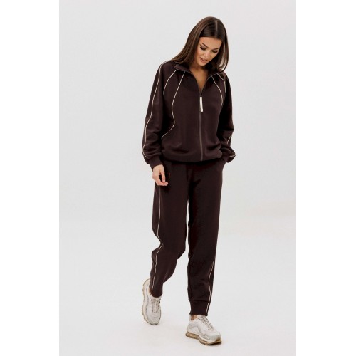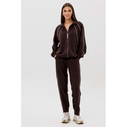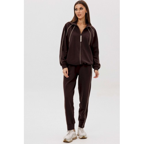 Современный костюм в стиле спорт-кэжуал — идеальный баланс комфорта и актуального дизайна. Модель выполнена из мягкого трикотажного полотна с добавлением хлопка, обеспечивающего приятные тактильные ощущения и свободу движений. Джемпер покроя реглан с аккуратной стойкой и застёжкой-молнией украшен контрастными кантами, придающими образу динамику. Брюки со слегка зауженным силуэтом и манжетами по низу дополнены эластичным поясом для удобной посадки. Костюм легко интегрируется в повседневный гардероб — от прогулок до путешествий и отдыха в городе.