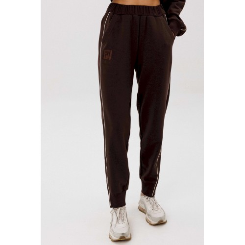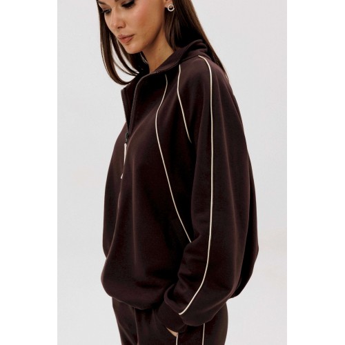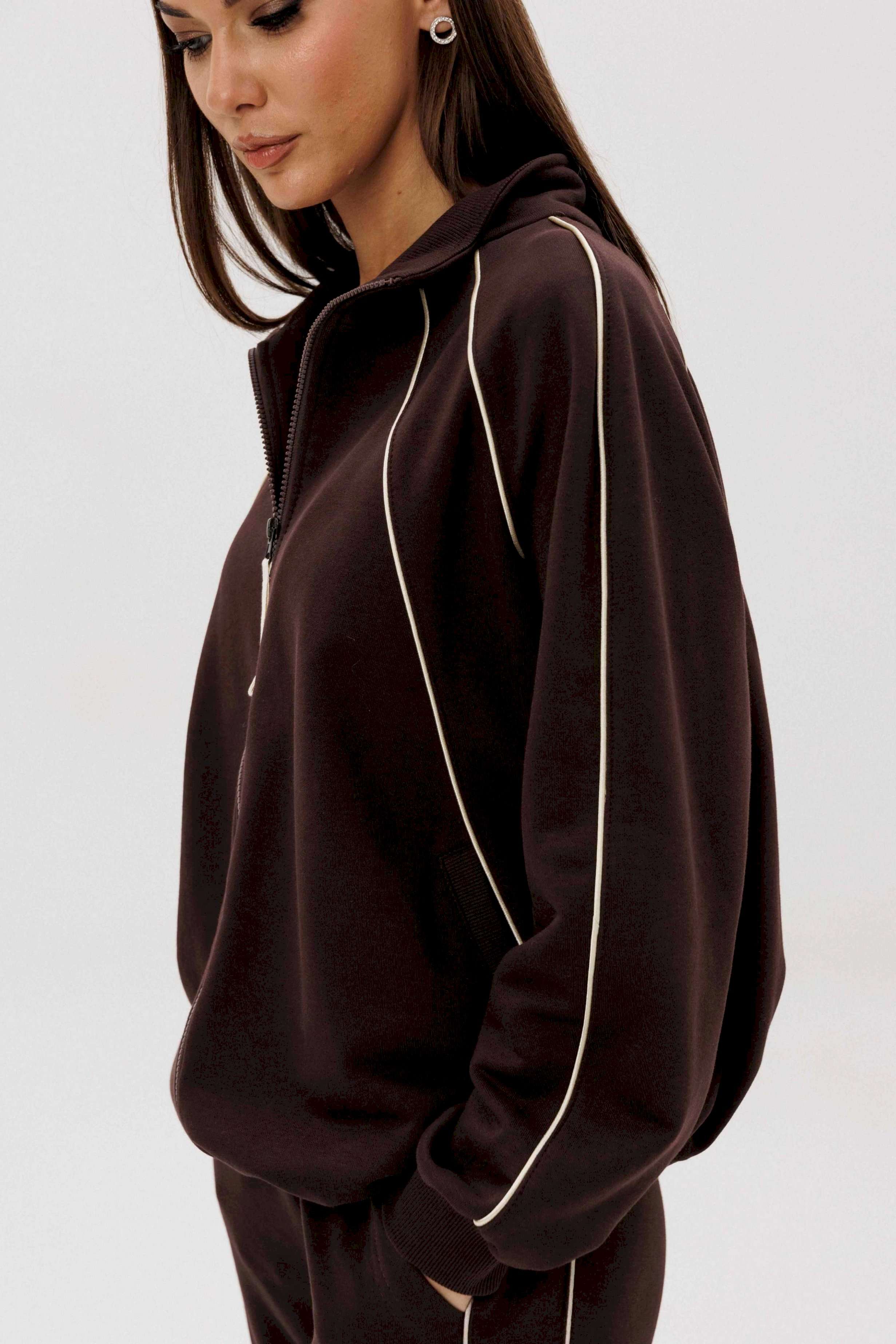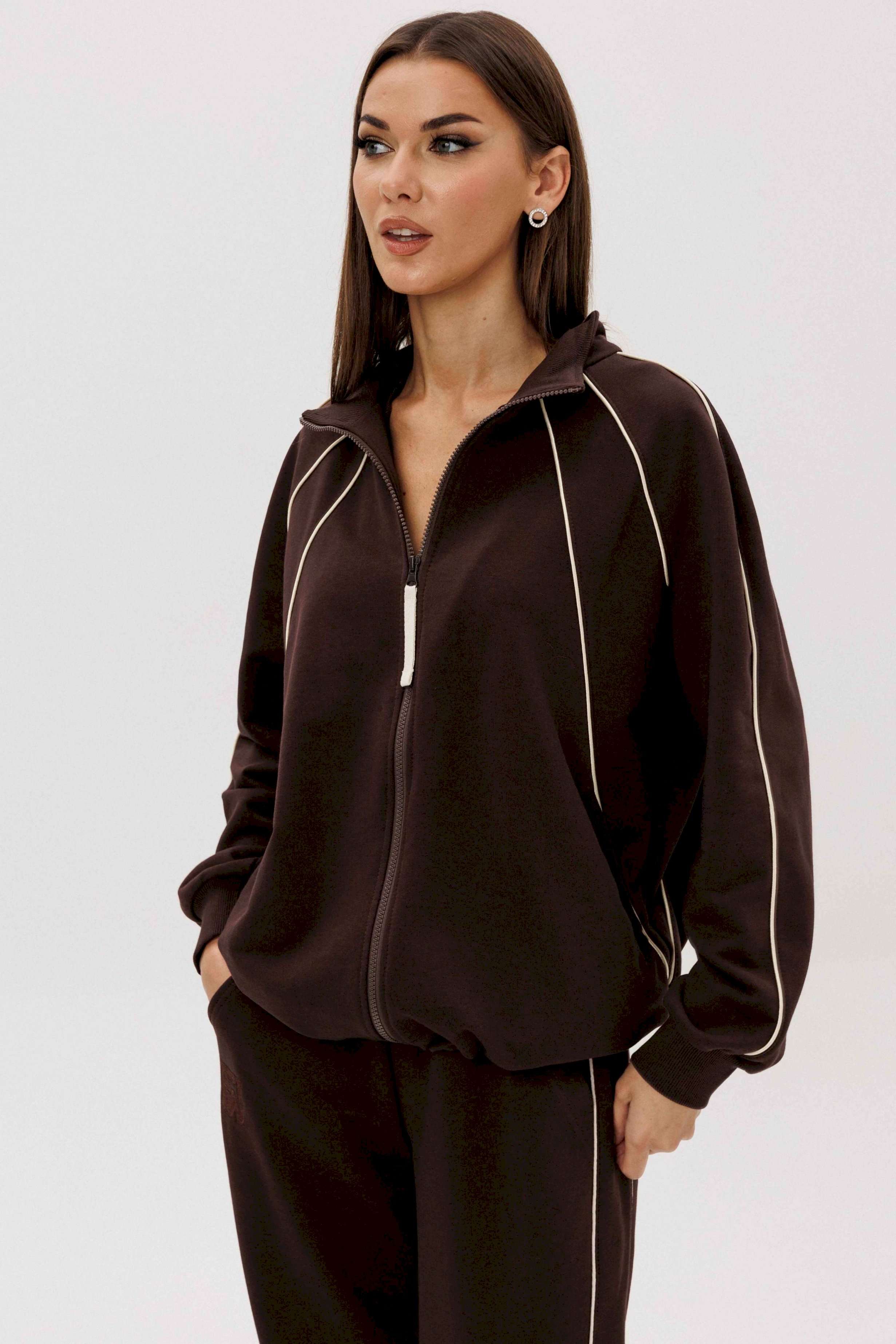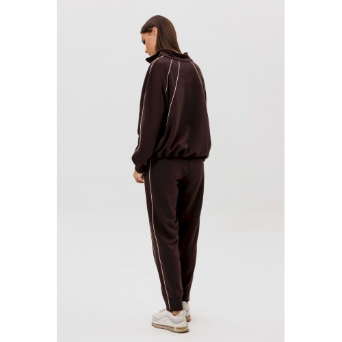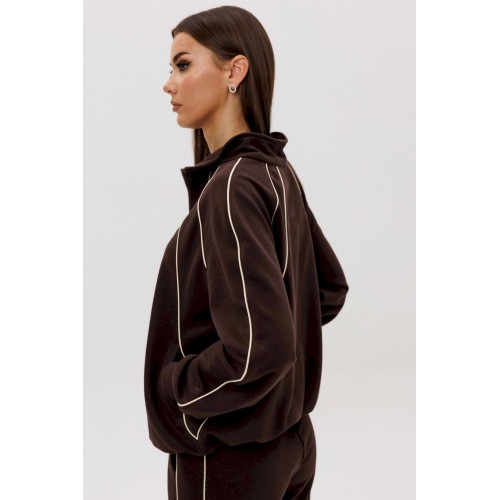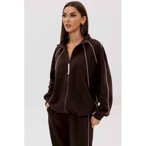 Современный костюм в стиле спорт-кэжуал — идеальный баланс комфорта и актуального дизайна. Модель выполнена из мягкого трикотажного полотна с добавлением хлопка, обеспечивающего приятные тактильные ощущения и свободу движений. Джемпер покроя реглан с аккуратной стойкой и застёжкой-молнией украшен контрастными кантами, придающими образу динамику. Брюки со слегка зауженным силуэтом и манжетами по низу дополнены эластичным поясом для удобной посадки. Костюм легко интегрируется в повседневный гардероб — от прогулок до путешествий и отдыха в городе.