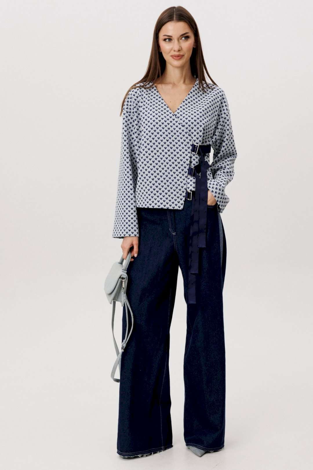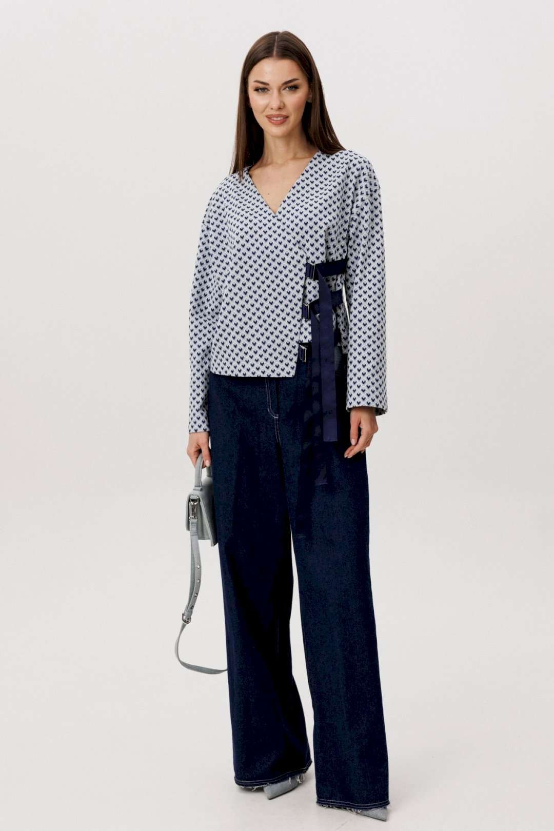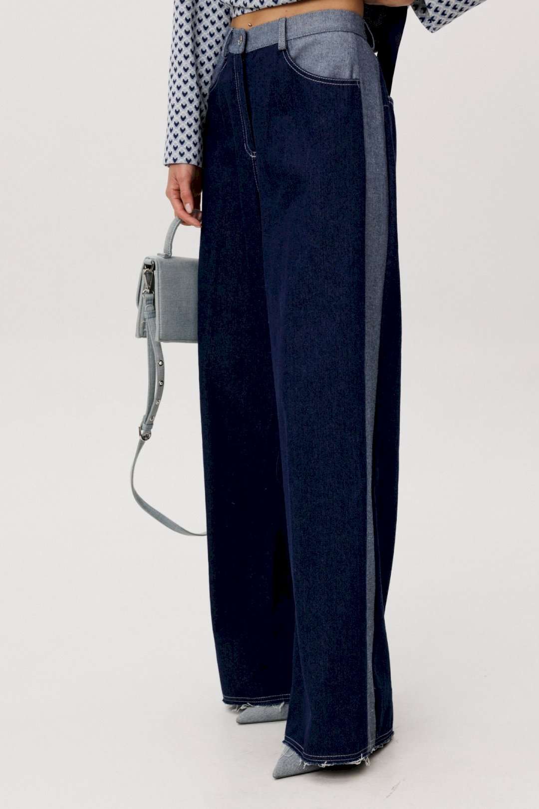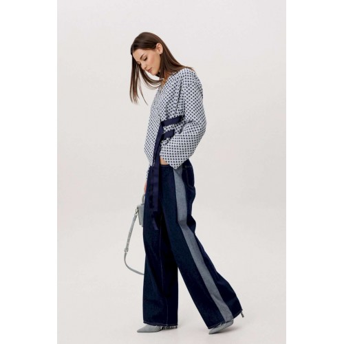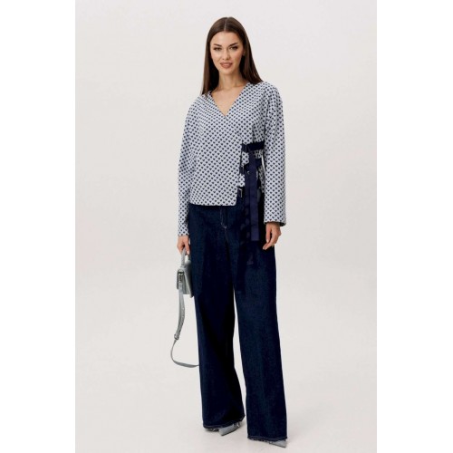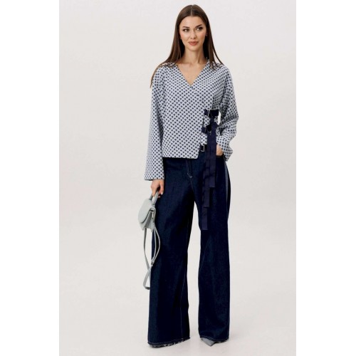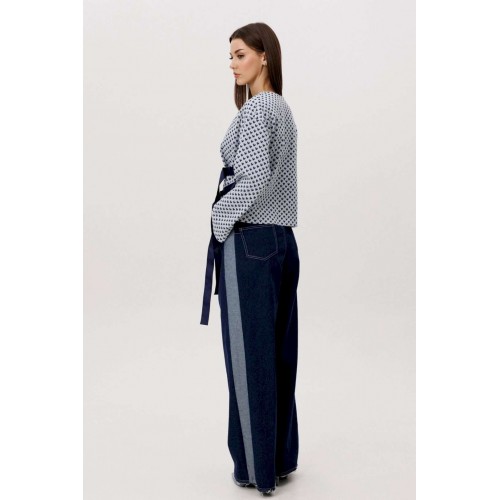 Современный брючный комплект, в котором гармонично сочетаются комфорт трикотажа и выразительность денима. Идеальное решение для повседневного гардероба в стиле smart casual. Джемпер выполнен из мягкого трикотажного полотна. Лёгкая фактура и свободный крой обеспечивают комфортную посадку и свободу движений. V-образный вырез визуально вытягивает силуэт, а лаконичный геометричный принт добавляет образу динамики и актуальности. Брюки — широкие джинсовые с высокой посадкой. Плотный деним хорошо держит форму, формируя выразительный силуэт. Расширенный крой от бедра создаёт эффект удлинённых ног и придаёт образу современный характер. Преимущества комплекта: Комфортный трикотаж, приятный к телу Актуальный широкий крой брюк Универсальное сочетание принта и классического денима Возможность носить элементы комплекта отдельно Комплект легко адаптируется под разные стилистические задачи: сочетайте его с кроссовками для повседневных образов или добавьте обувь на каблуке для более собранного и выразительного аутфита. Практичность, комфорт и актуальный силуэт — идеальный баланс для современног.