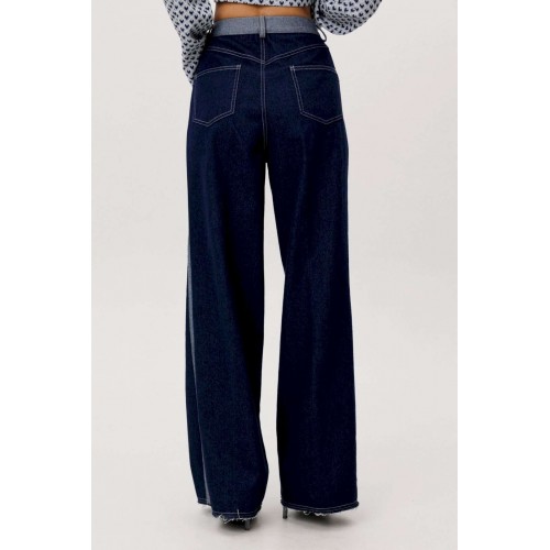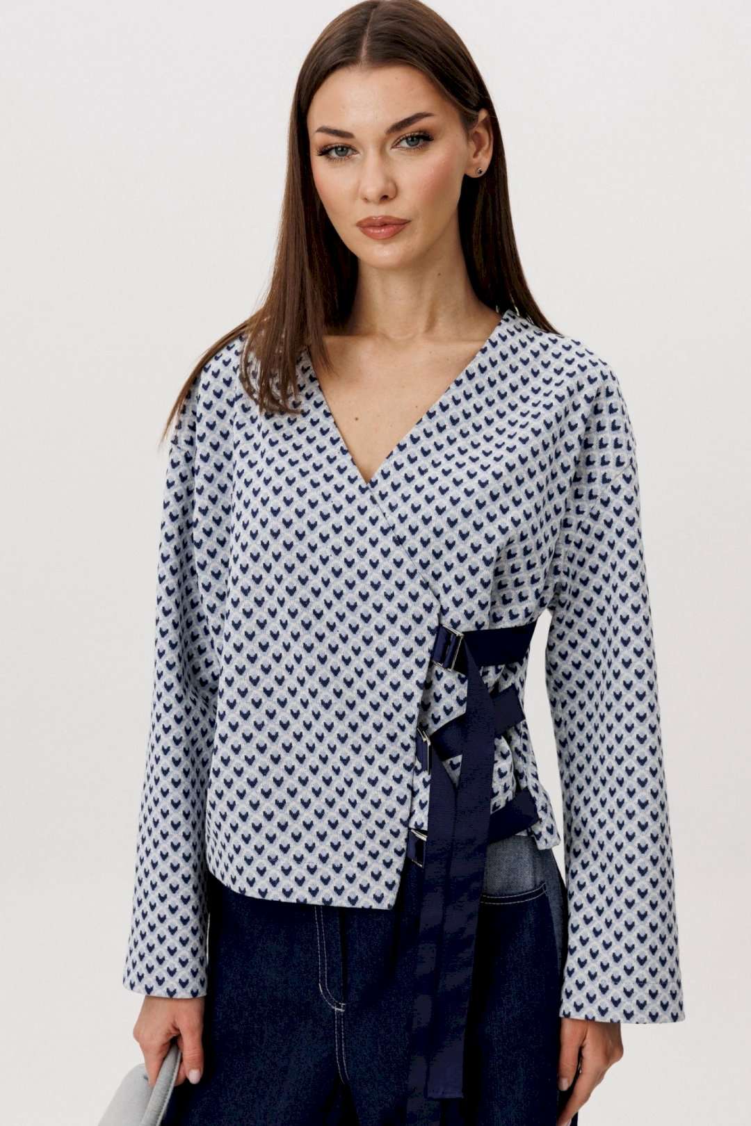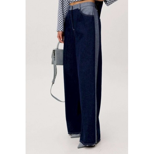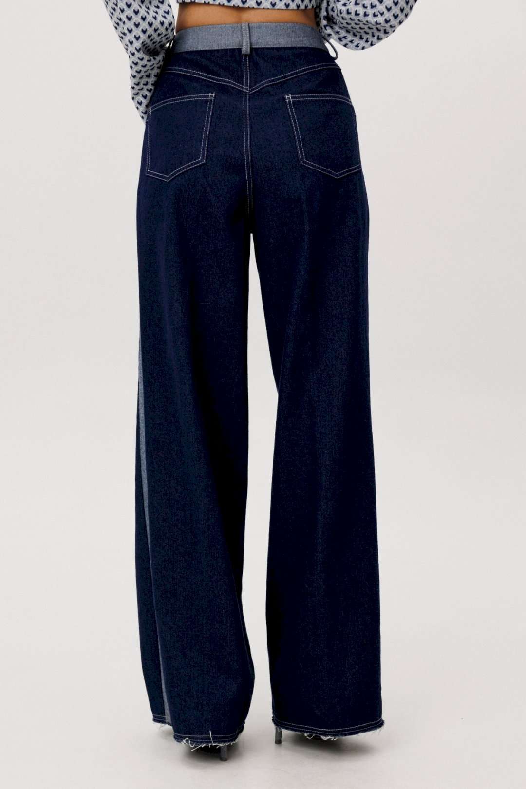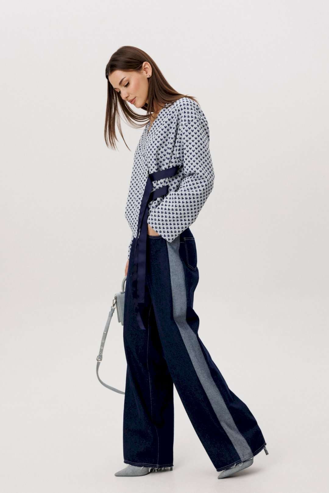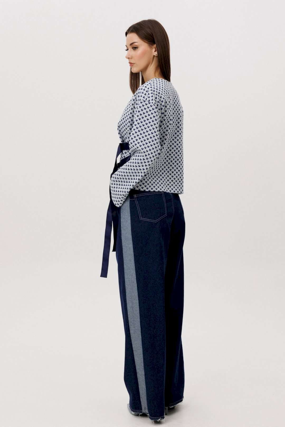 Современный брючный комплект, в котором гармонично сочетаются комфорт трикотажа и выразительность денима. Идеальное решение для повседневного гардероба в стиле smart casual. Джемпер выполнен из мягкого трикотажного полотна. Лёгкая фактура и свободный крой обеспечивают комфортную посадку и свободу движений. V-образный вырез визуально вытягивает силуэт, а лаконичный геометричный принт добавляет образу динамики и актуальности. Брюки — широкие джинсовые с высокой посадкой. Плотный деним хорошо держит форму, формируя выразительный силуэт. Расширенный крой от бедра создаёт эффект удлинённых ног и придаёт образу современный характер. Преимущества комплекта: Комфортный трикотаж, приятный к телу Актуальный широкий крой брюк Универсальное сочетание принта и классического денима Возможность носить элементы комплекта отдельно Комплект легко адаптируется под разные стилистические задачи: сочетайте его с кроссовками для повседневных образов или добавьте обувь на каблуке для более собранного и выразительного аутфита. Практичность, комфорт и актуальный силуэт — идеальный баланс для современног.