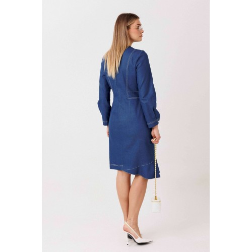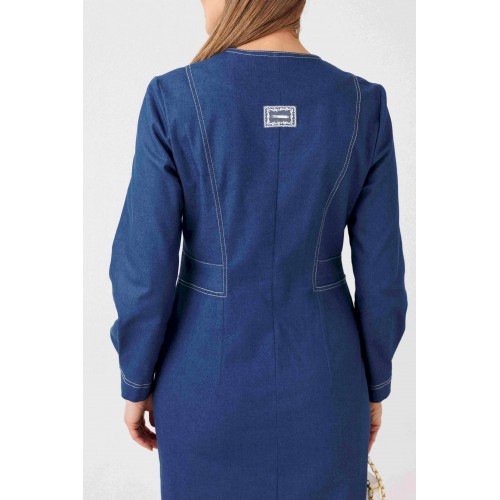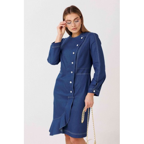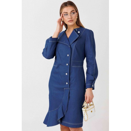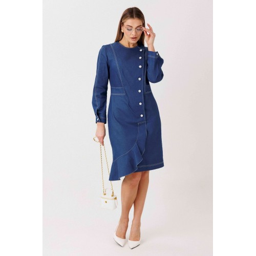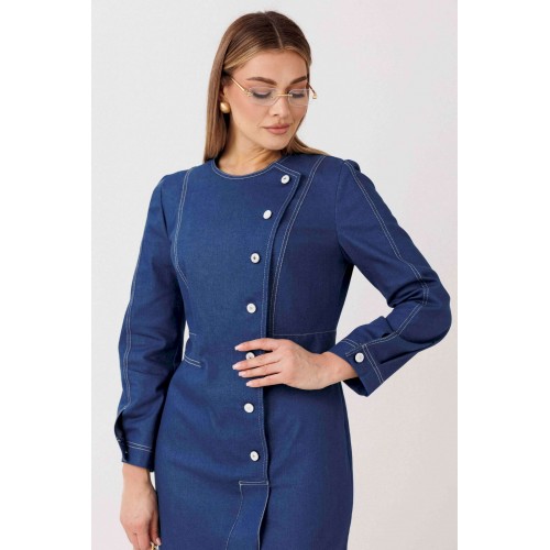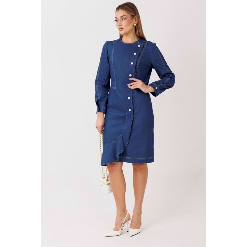 Эффектное платье полуприлегающего силуэта подчёркивает женственные линии фигуры и создаёт утончённый, собранный образ. Модель выполнена из качественного денима с чёткой формой и аккуратной отделкой контрастной строчкой. Особенности модели: смещённая застёжка на пуговицы — современный акцент и визуальное удлинение силуэта; акцентированная линия талии, формирующая изящный силуэт «песочные часы»; продуманный крой с рельефными линиями для идеальной посадки; асимметричный нижний край с мягкой волановой деталью, добавляющей динамику образу; лаконичная круглая горловина и длинный рукав для баланса строгости и женственности. Платье легко адаптируется под разные сценарии: с лодочками — для деловых и торжественных выходов, с более расслабленной обувью — для стильного городского образа. Идеальный выбор для тех, кто ценит архитектурный крой, акцентные детали и современную классику.