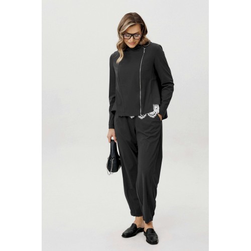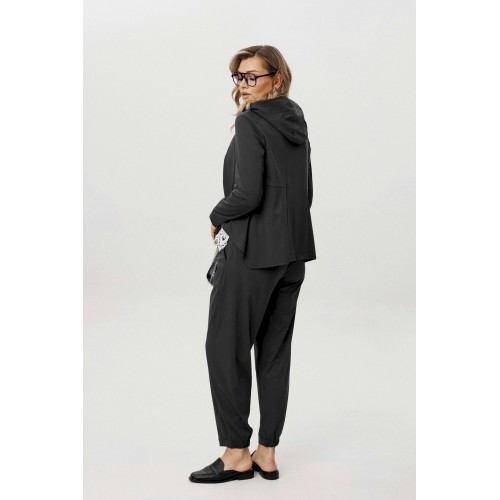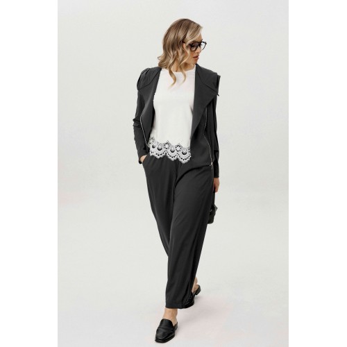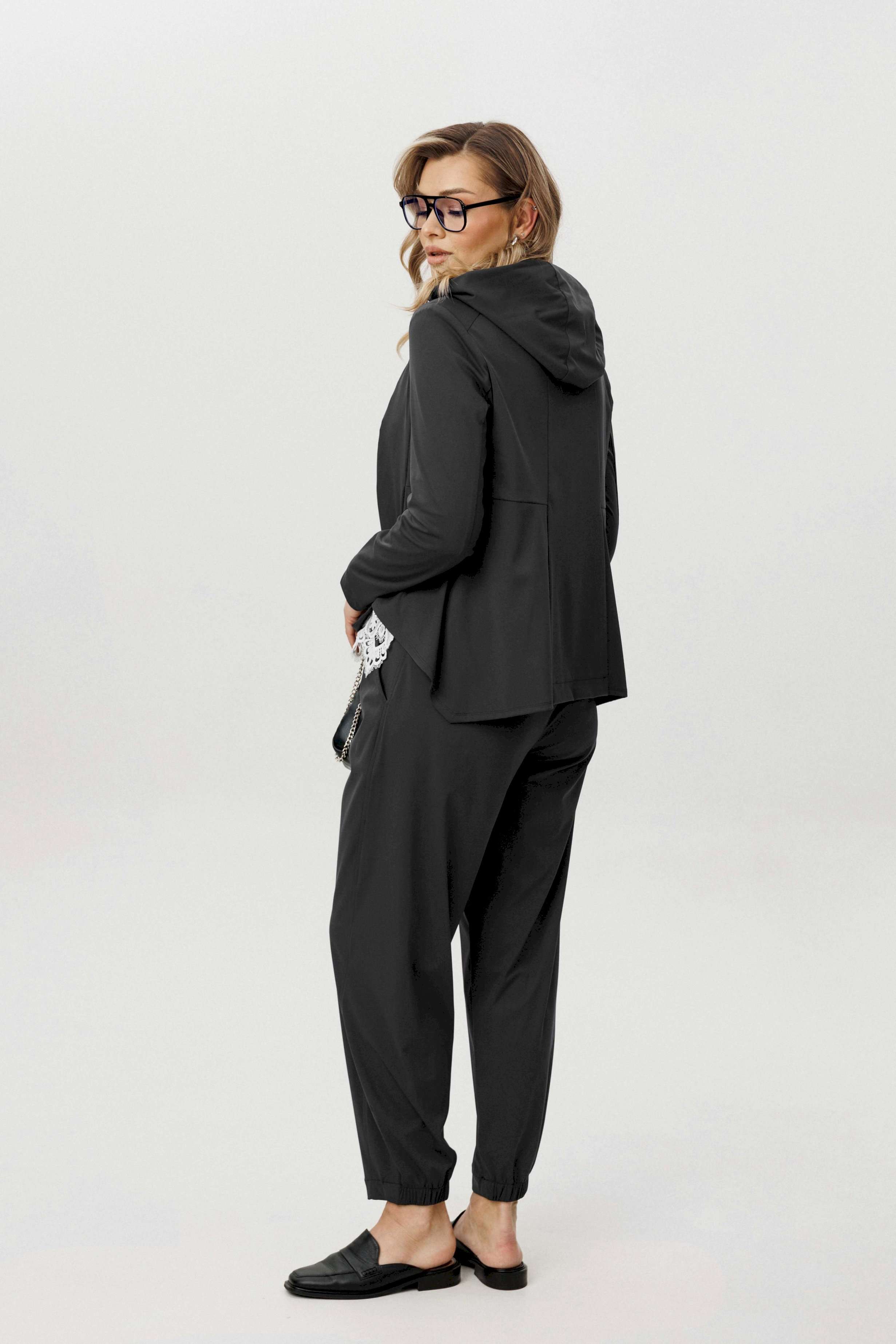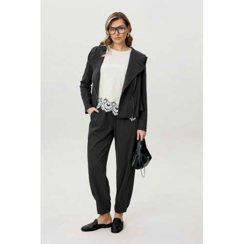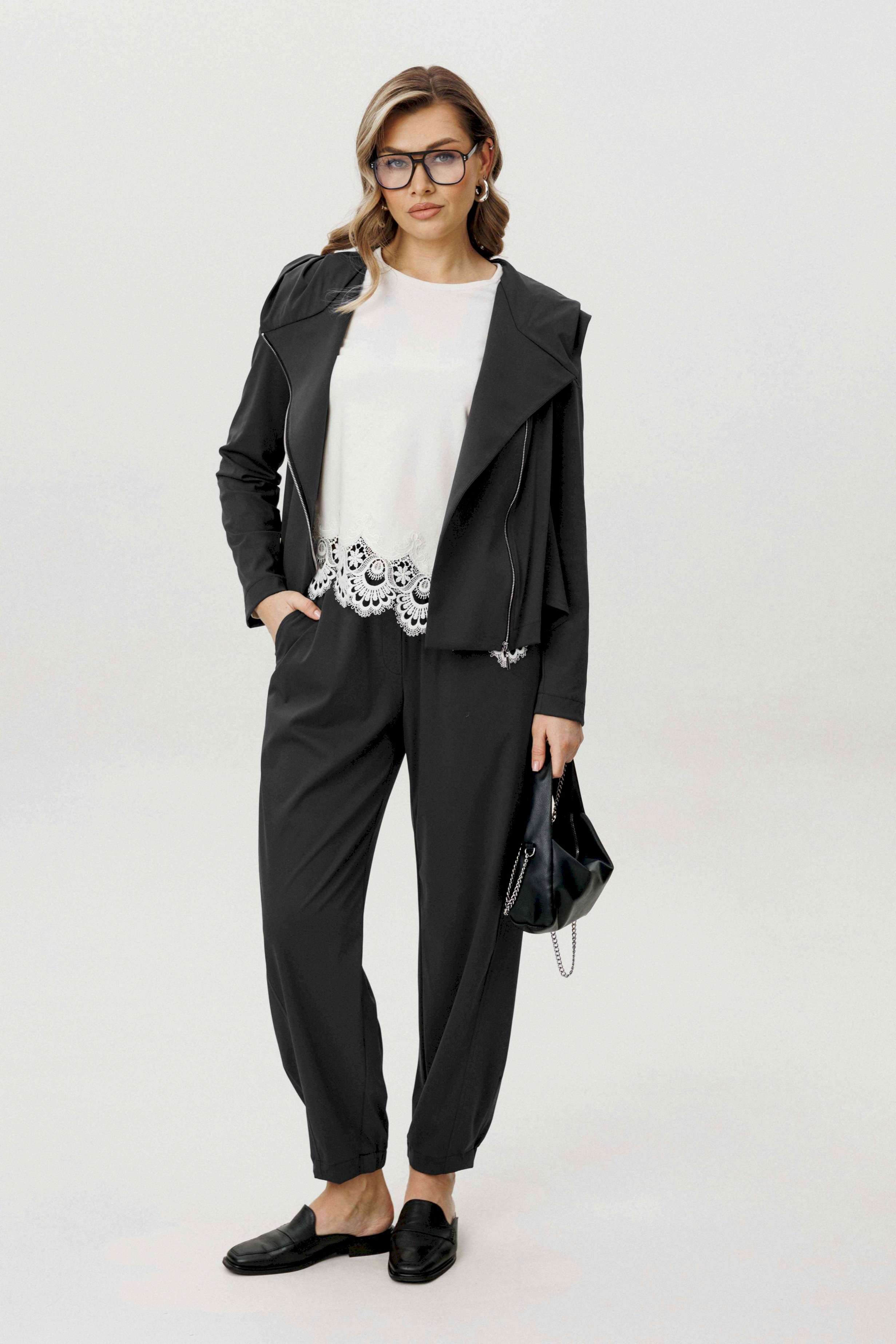 Современный комплект-тройка, построенный на сочетании архитектурного кроя и тактильного комфорта. Трикотажное полотно с добавлением эластана отличается мягкостью, пластичностью и благородной матовой поверхностью, благодаря чему образ выглядит расслабленно, но собранно. Куртка с капюшоном выполнена в минималистичной эстетике и дополнена асимметричной застёжкой на тесьму-молнию, которая создаёт динамику и подчёркивает дизайнерский характер модели. Продуманные линии кроя формируют выразительный силуэт без излишней жёсткости. Хлопчатобумажный топ, декорированный изящным кружевом по нижнему краю, добавляет образу контрастную женственность и завершённость. Брюки в расслабленном стиле с эластичным поясом обеспечивают комфортную посадку и свободу движений. Эффектные подрезы добавляют объём и архитектурность, делая модель визуально интересной и актуальной. Комплект идеально вписывается в городской casual-гардероб и подойдёт для тех, кто ценит функциональность, дизайн и современные материалы.