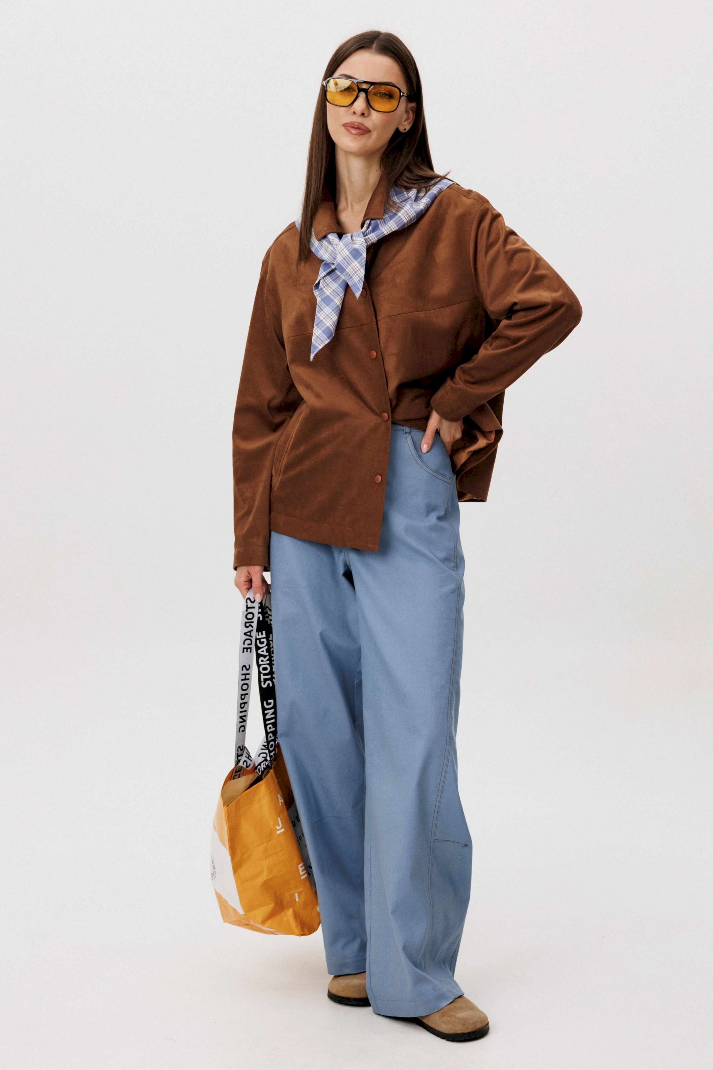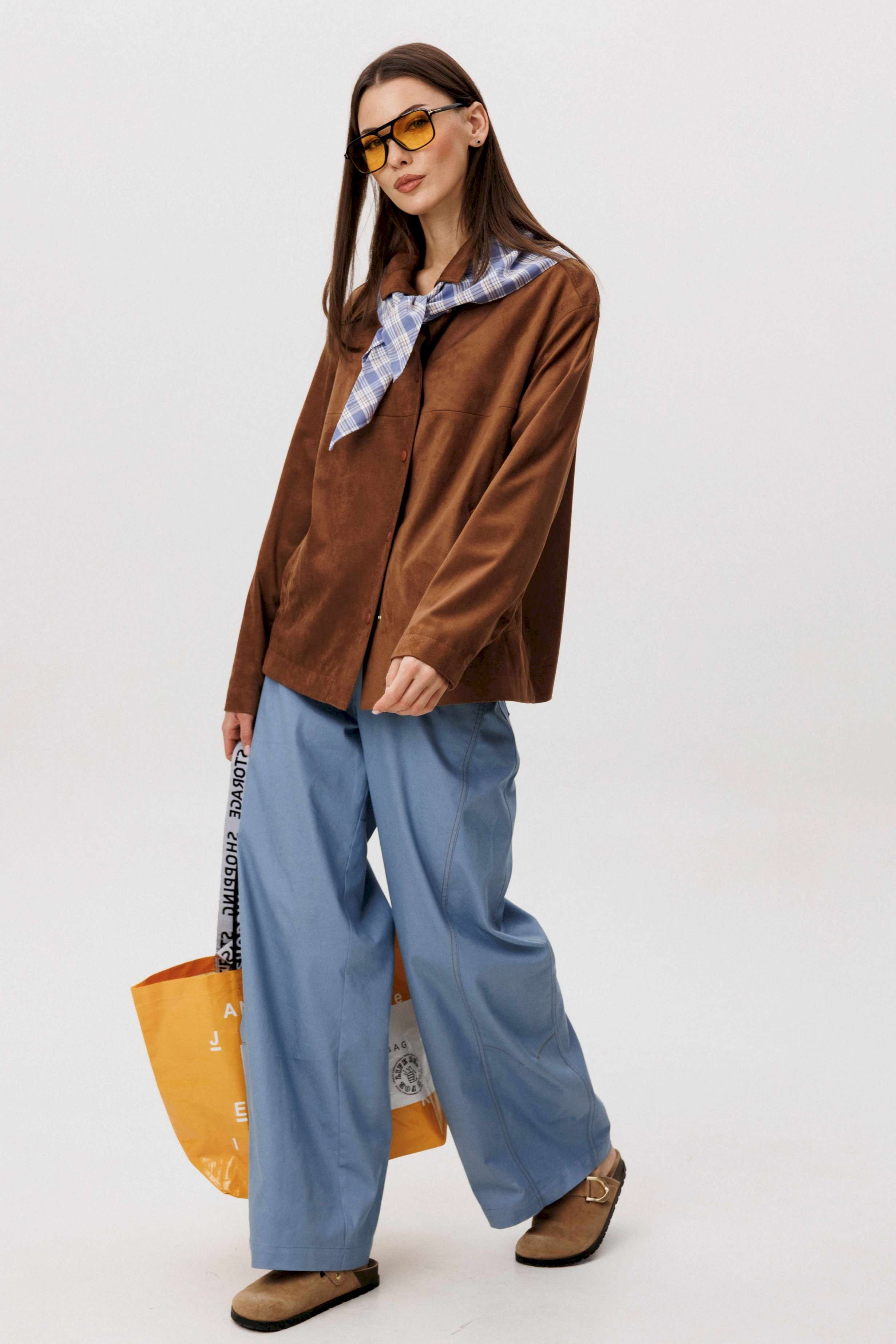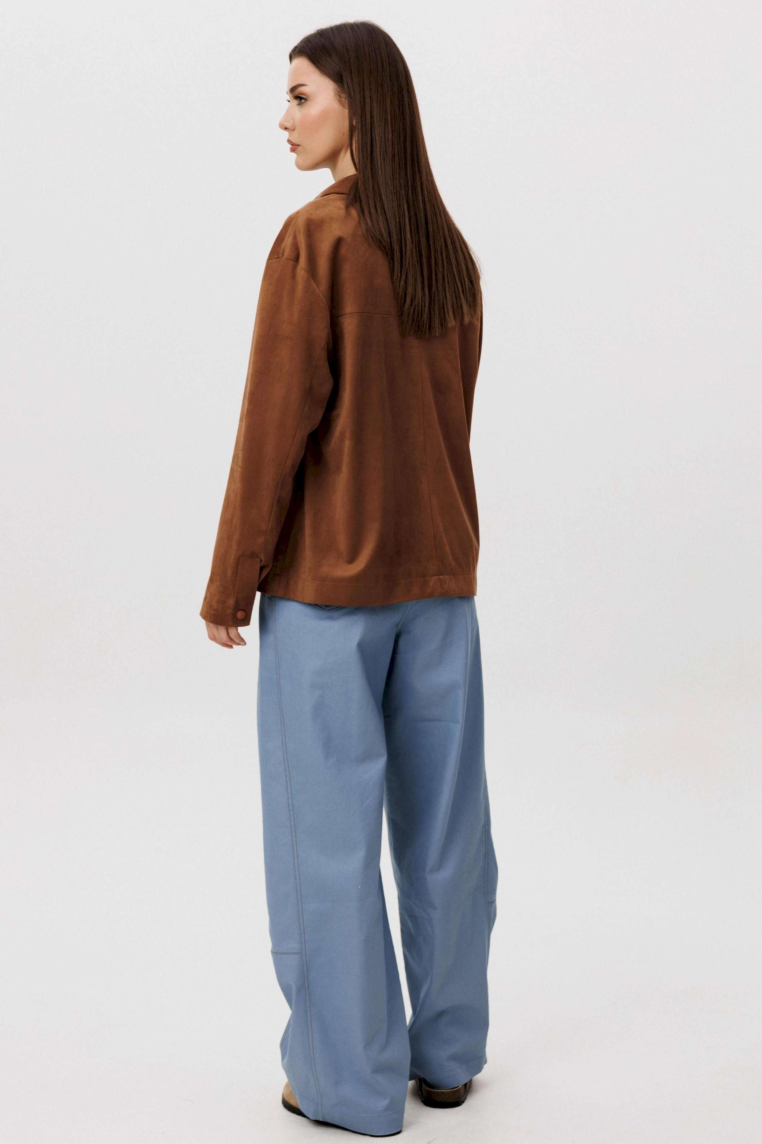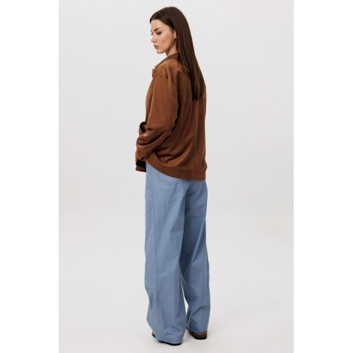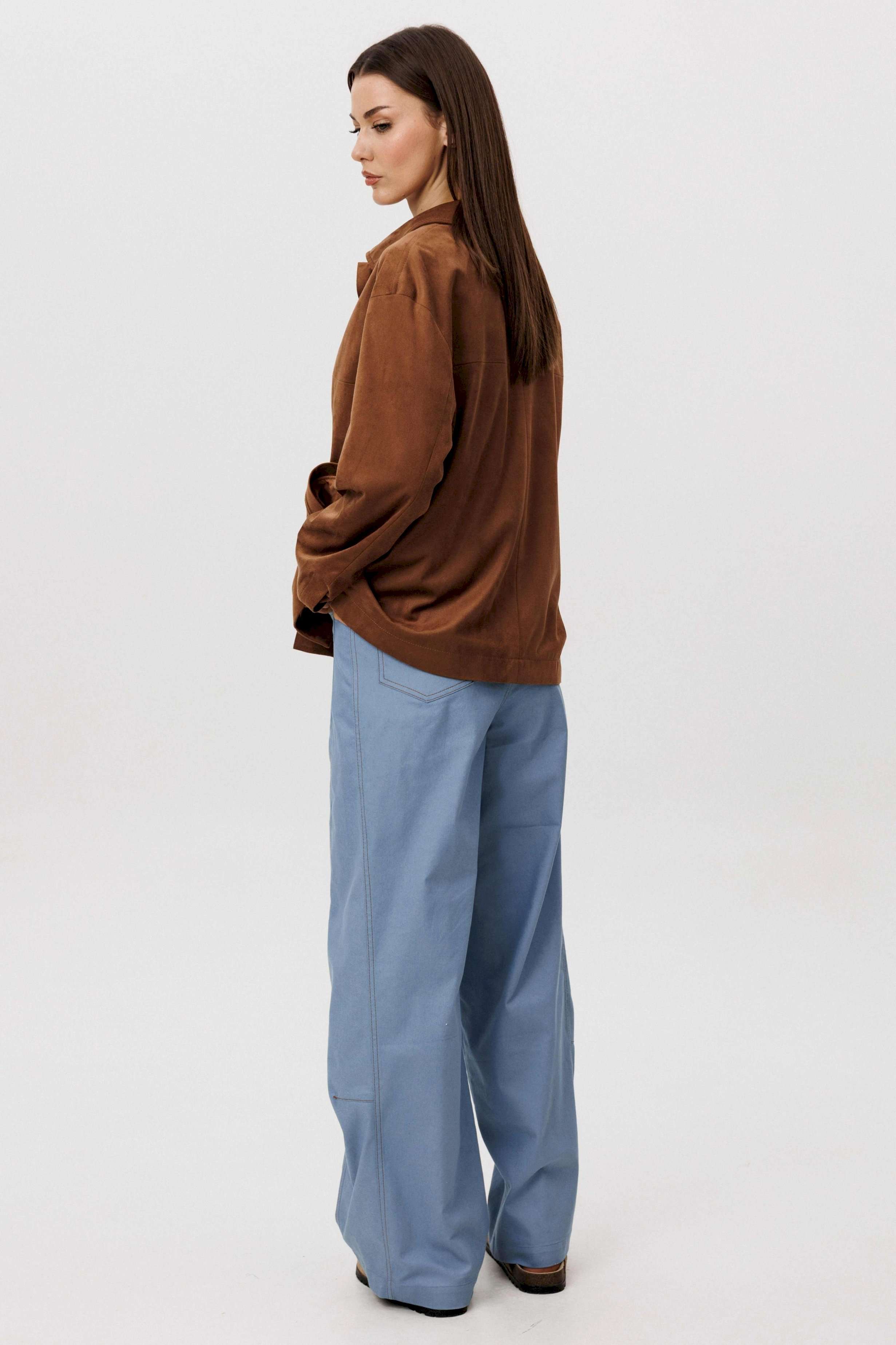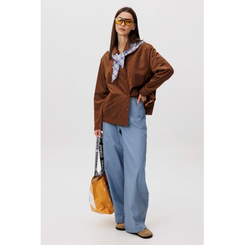 Стильный женский брючный костюм в стиле смарт-кэжуал сочетает комфорт и элегантность. Рубашка выполнена из замшевой ткани, брюки из джинсовой ткани тиффани. Идеальный выбор для повседневных образов. Рубашка: Свободный прямой силуэт, комфортная посадка. Материал под замшу в насыщенном коричневом оттенке. Классический отложной воротник. Застежка на кнопки. Практичные боковые карманы. Брюки \"\"baggy\"\" из денима, с интересным худящим эффектом, достигаемым за счет отрезной боковой части, смещенной на передних и задних половинках. Джинсы на отрезном поясе со шлевками, с фигурными карманами по передним половинкам. Задние половинки брюк с отрезной кокеткой и накладными карманами. Боковая часть брюк с отделочными вытачками, придающими легкий объем в области голени. Длина брюк около 106см.