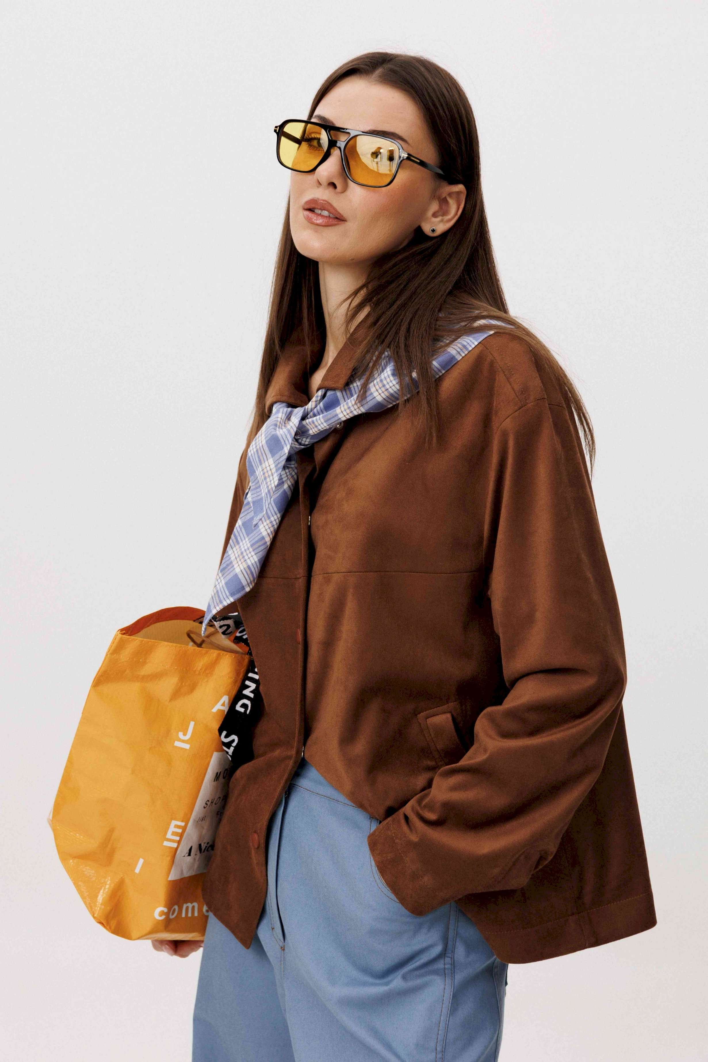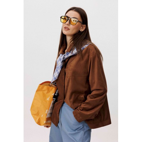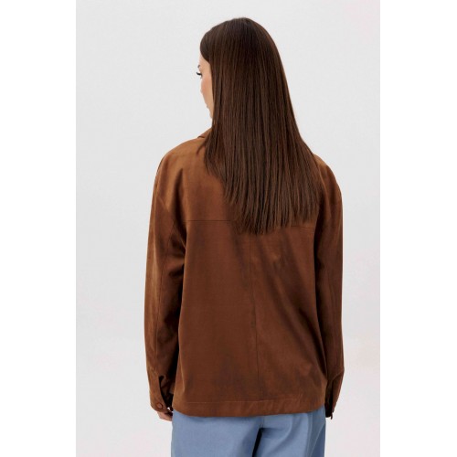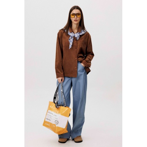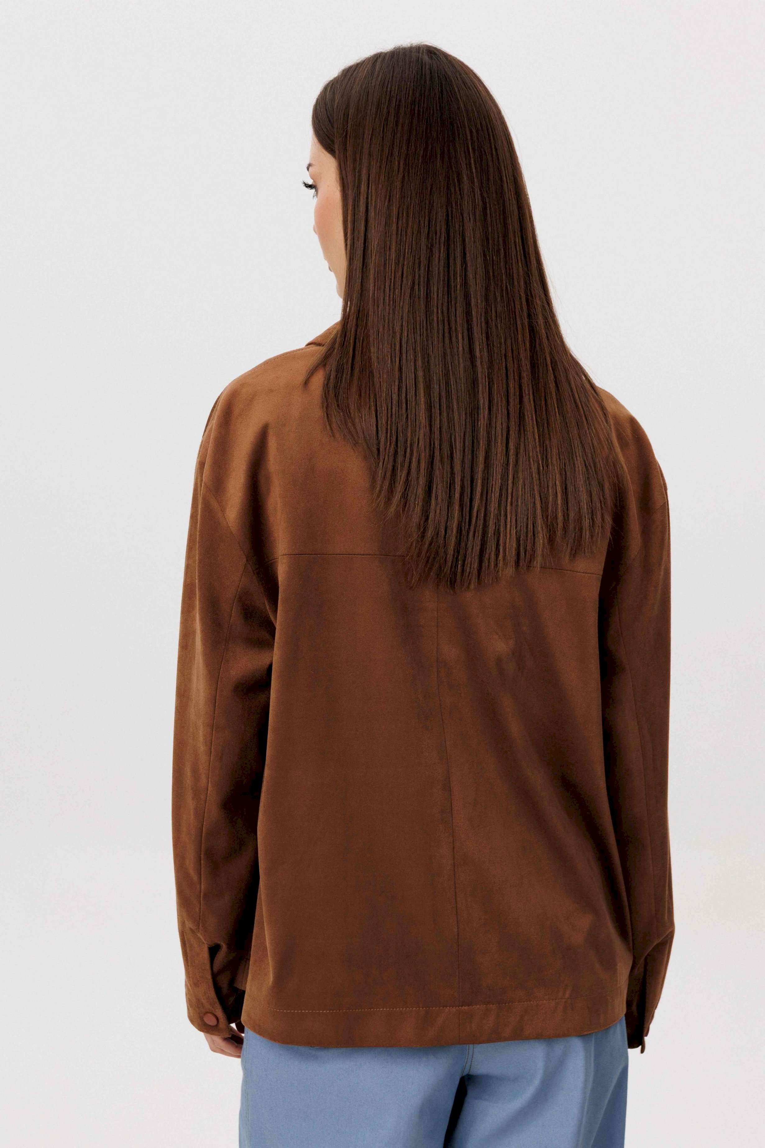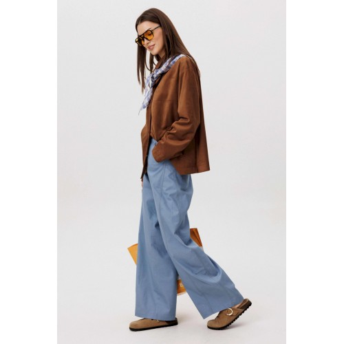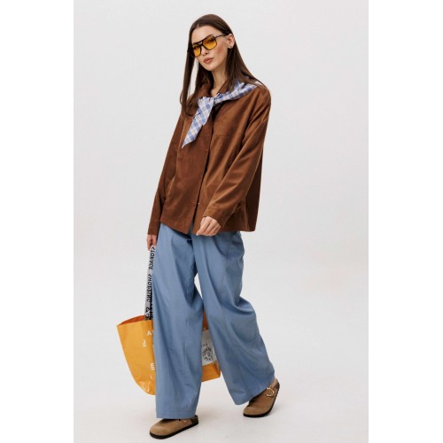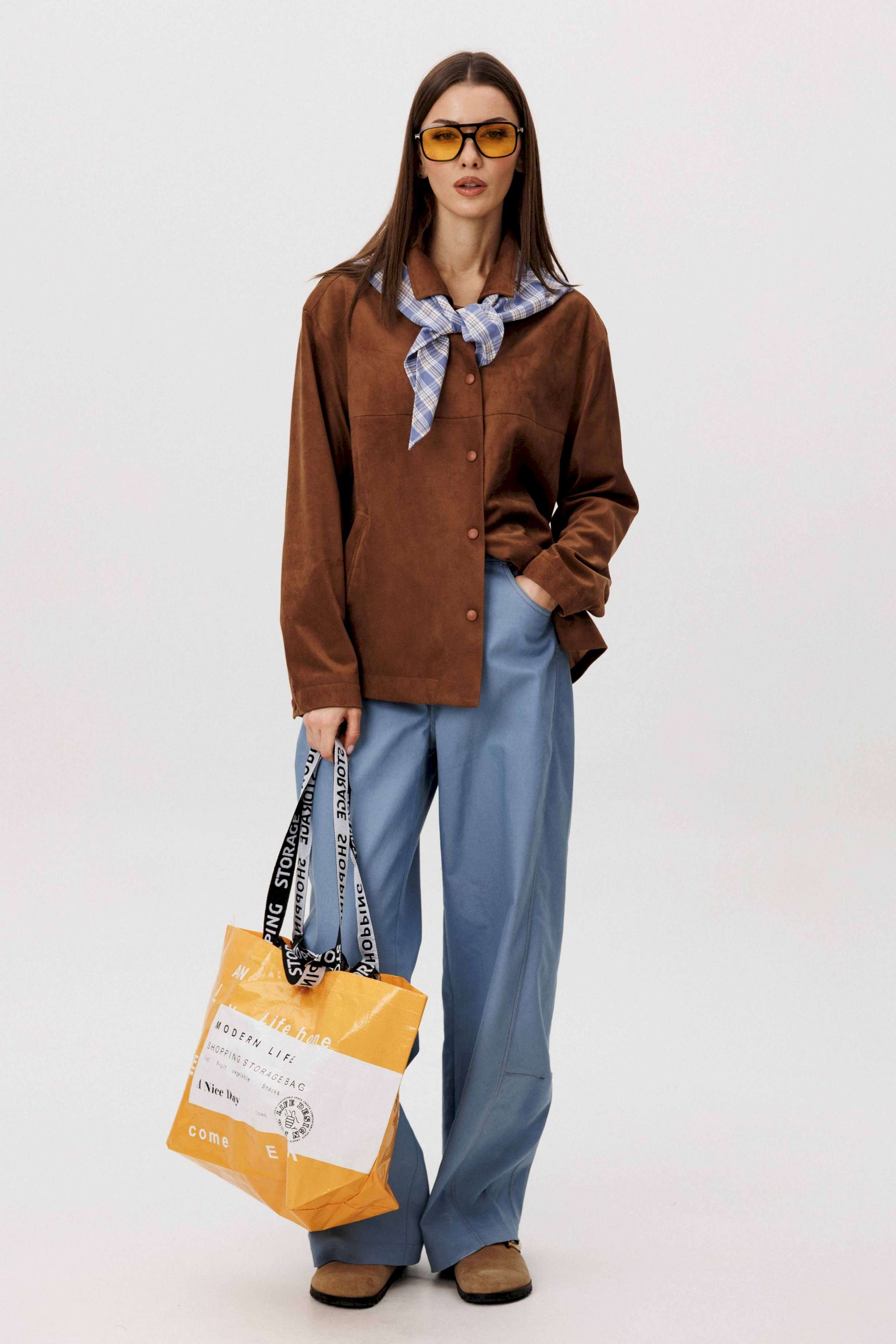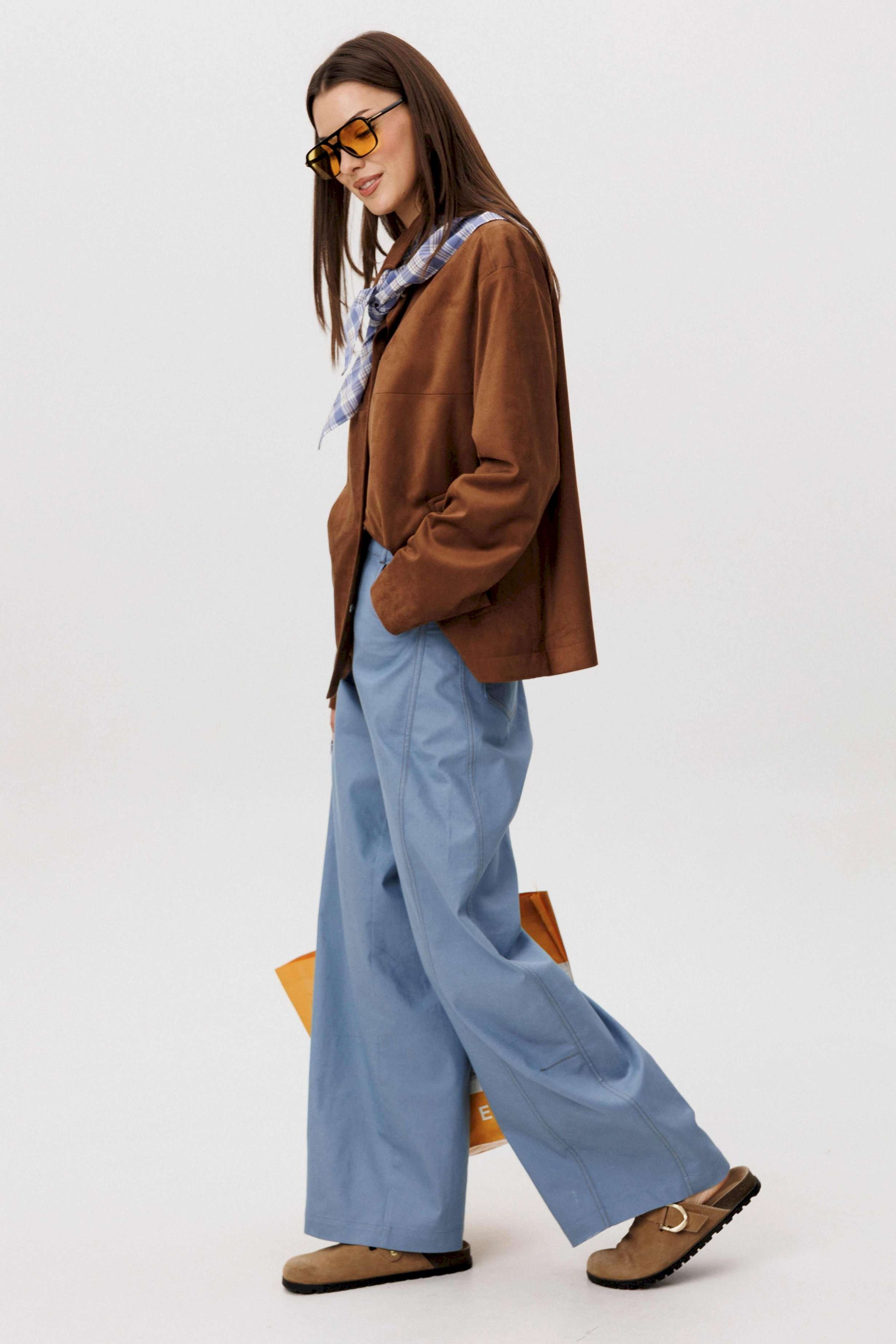Стильный женский брючный костюм в стиле смарт-кэжуал сочетает комфорт и элегантность. Рубашка выполнена из замшевой ткани, брюки из джинсовой ткани тиффани. Идеальный выбор для повседневных образов. Рубашка: Свободный прямой силуэт, комфортная посадка. Материал под замшу в насыщенном коричневом оттенке. Классический отложной воротник. Застежка на кнопки. Практичные боковые карманы. Брюки \"\"baggy\"\" из денима, с интересным худящим эффектом, достигаемым за счет отрезной боковой части, смещенной на передних и задних половинках. Джинсы на отрезном поясе со шлевками, с фигурными карманами по передним половинкам. Задние половинки брюк с отрезной кокеткой и накладными карманами. Боковая часть брюк с отделочными вытачками, придающими легкий объем в области голени. Длина брюк около 106см.