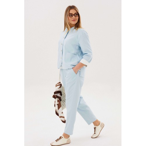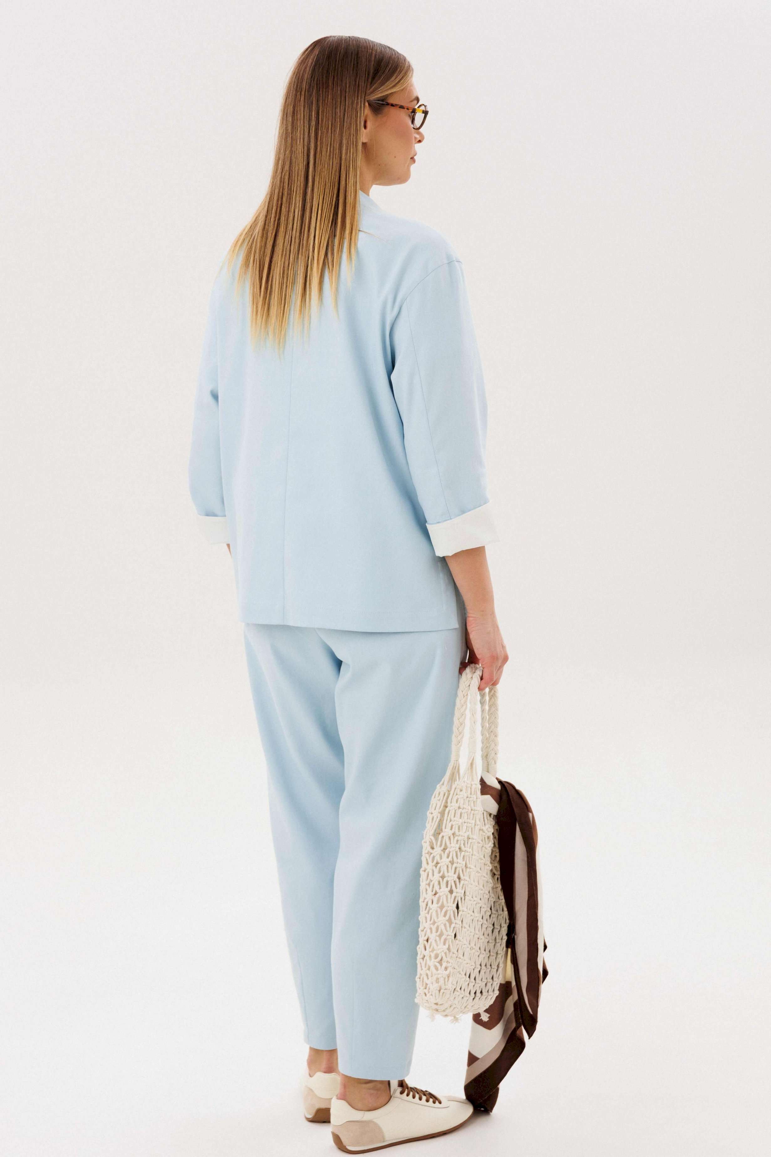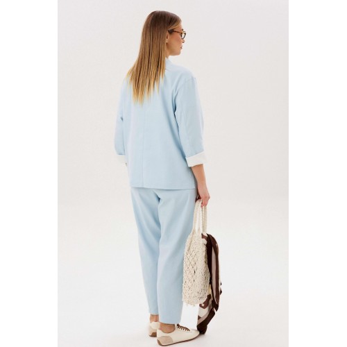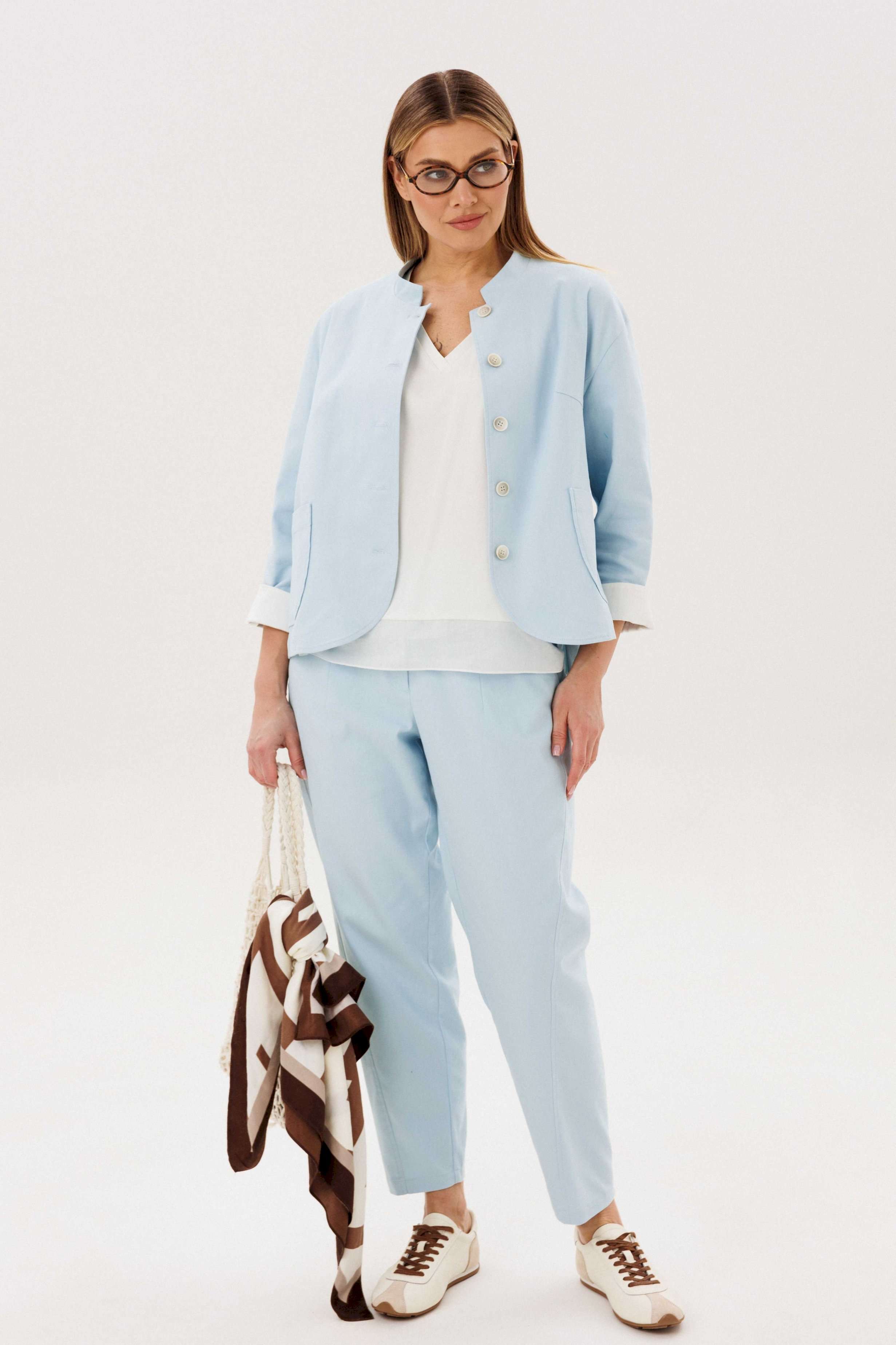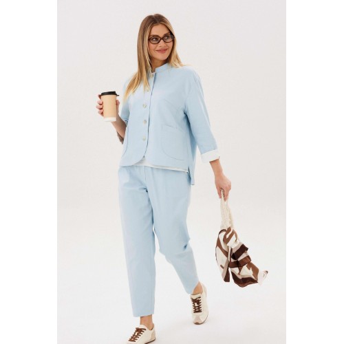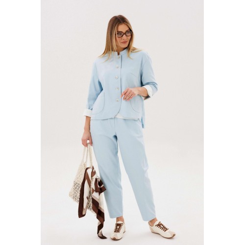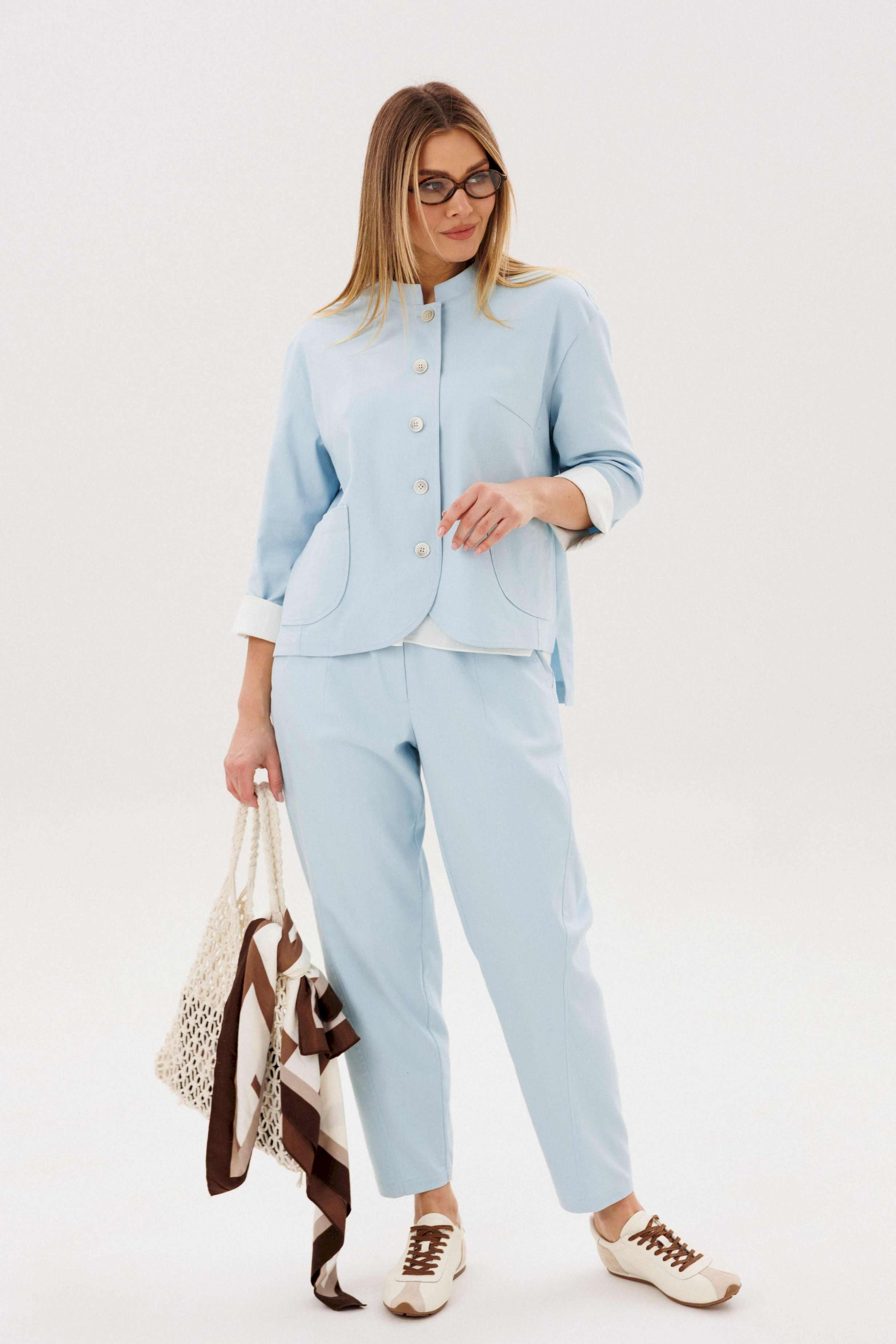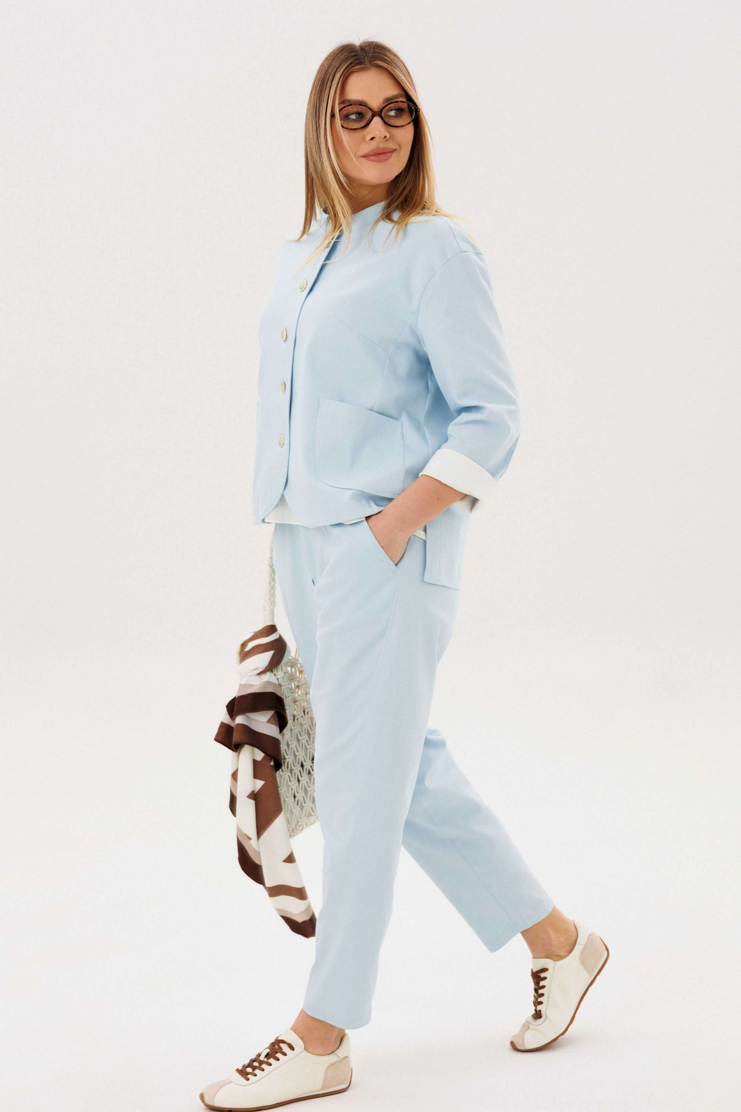 Стильный брючный комплект — идеальное сочетание комфорта и утончённой элегантности. Модель выполнена в нежном голубом оттенке и дополнена трендовой атласной блузой, создавая актуальный и гармоничный образ на каждый день. В комплект входит: Лаконичный жакет из хлопкового полотна Брюки прямого кроя с комфортной посадкой Атласная блуза с мягким блеском Жакет из натурального хлопка обеспечивает комфорт и отлично держит форму, подчёркивая аккуратный силуэт. Минималистичный дизайн с аккуратной линией горловины и пуговицами делает модель универсальной и современной. Брюки прямого кроя визуально вытягивают силуэт и создают элегантный, сбалансированный образ. Комфортная посадка позволяет чувствовать себя уверенно в течение всего дня. Атласная блуза добавляет комплекту изысканности: лёгкий блеск ткани освежает образ и делает его более выразительным, сохраняя при этом сдержанность. Преимущества комплекта: натуральное хлопковое полотно трендовое сочетание фактур (хлопок + атлас) универсальный и женственный силуэт готовый образ без необходимости подбора Комплект легко адаптируется под разные случаи: с кроссовками — для стильного casual, с обувью на каблуке — для более элегантного выхода. Идеальный выбор для тех, кто ценит комфорт, актуальные тренды и продуманный стиль.