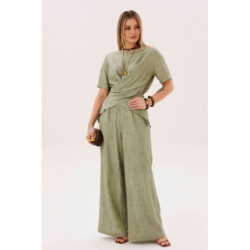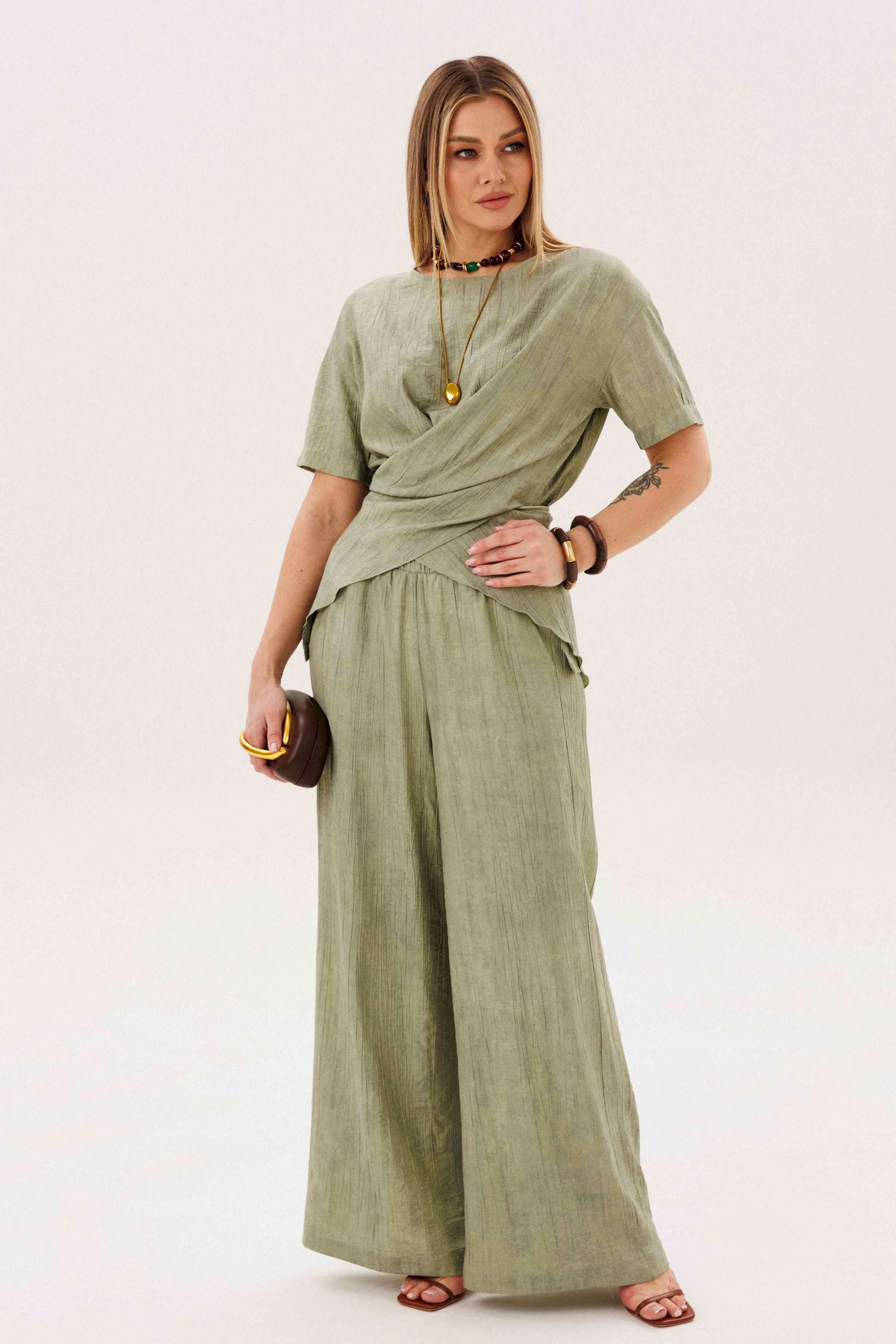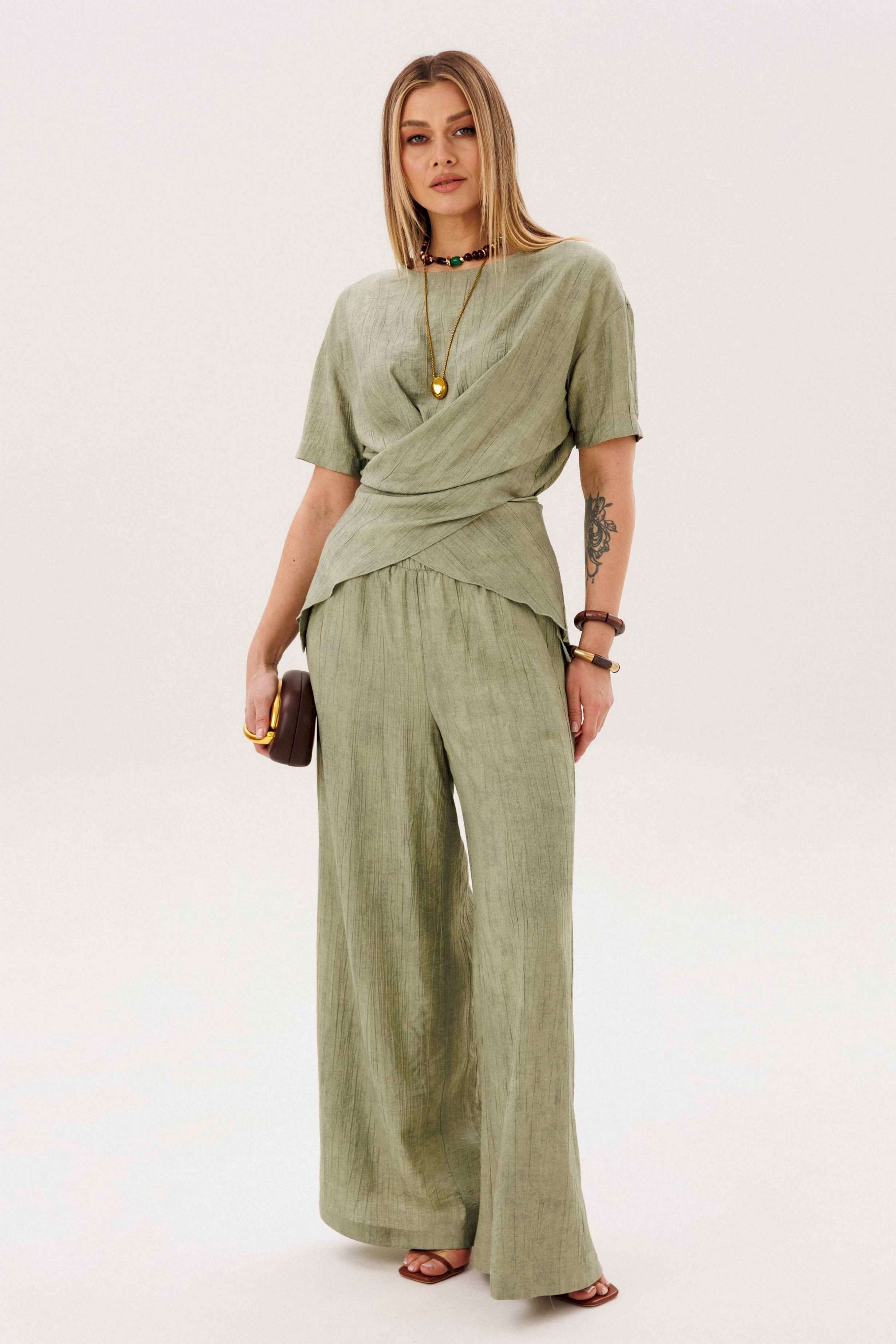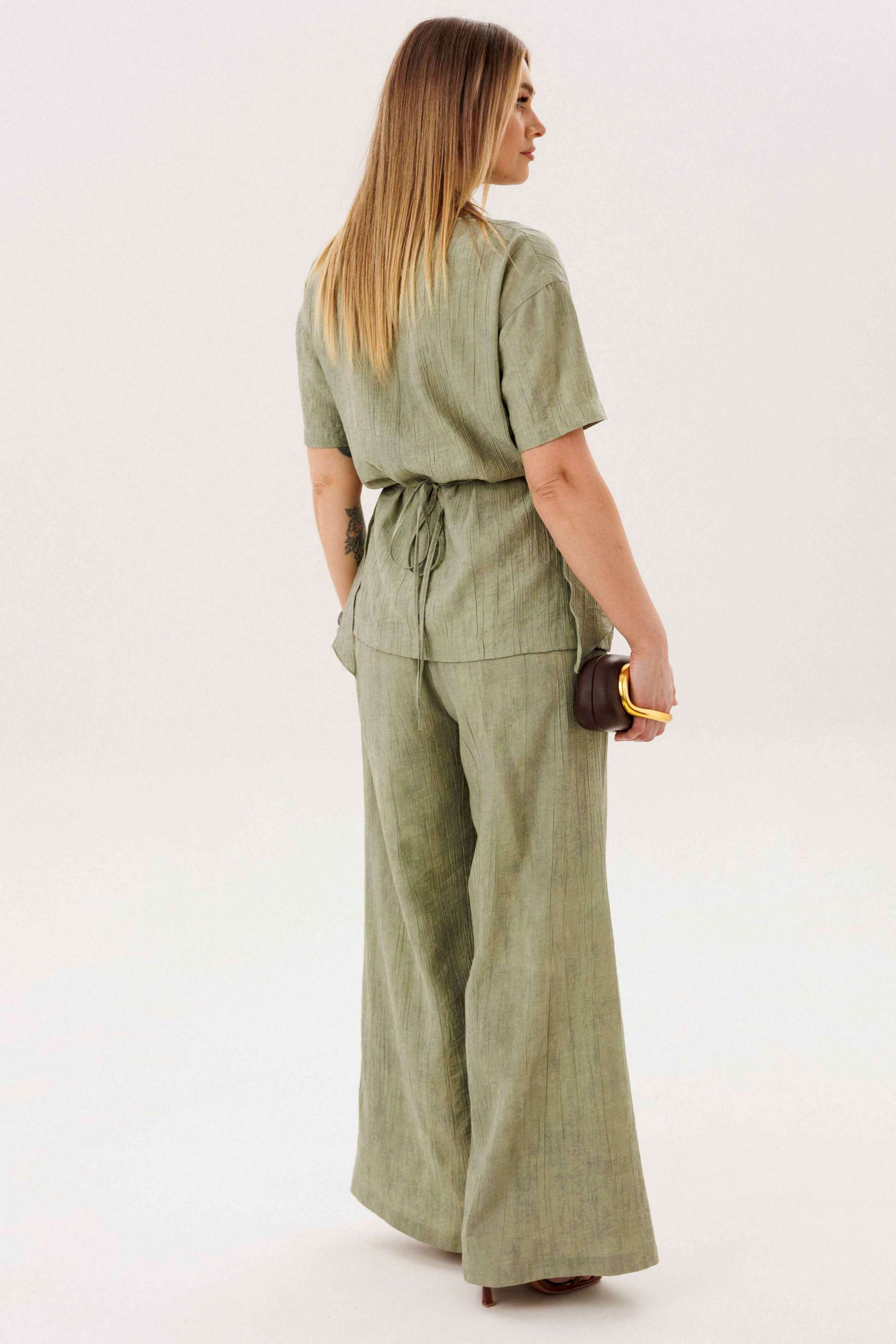 Этот стильный костюм — воплощение летней элегантности и комфорта. Модель выполнена из вискозной ткани с эффектом жатки, что не только актуально в этом сезоне, но и крайне практично: одежда меньше мнется и сохраняет безупречный вид в течение всего дня. Широкие, длинные, струящиеся брюки-палаццо - одна из самых актуальных моделей брюк. Они обладают свойством добавлять нотку расслабленного шика любому образу, и, несомненно, они особенно эффектно выглядят в нарядных комплектах. Брюки свободные, на притачном эластичном поясе. Длина брюк около 108 см. Оригинальная блуза с драпировкой мягко подчеркивает талию, создавая женственный и притягательный силуэт. Свободный силуэт, рубашечный покрой, рукав короткий, эффектная драпировка по переду и кокетливый пояс-завязка по спинке. Длина блузы около 80 см.