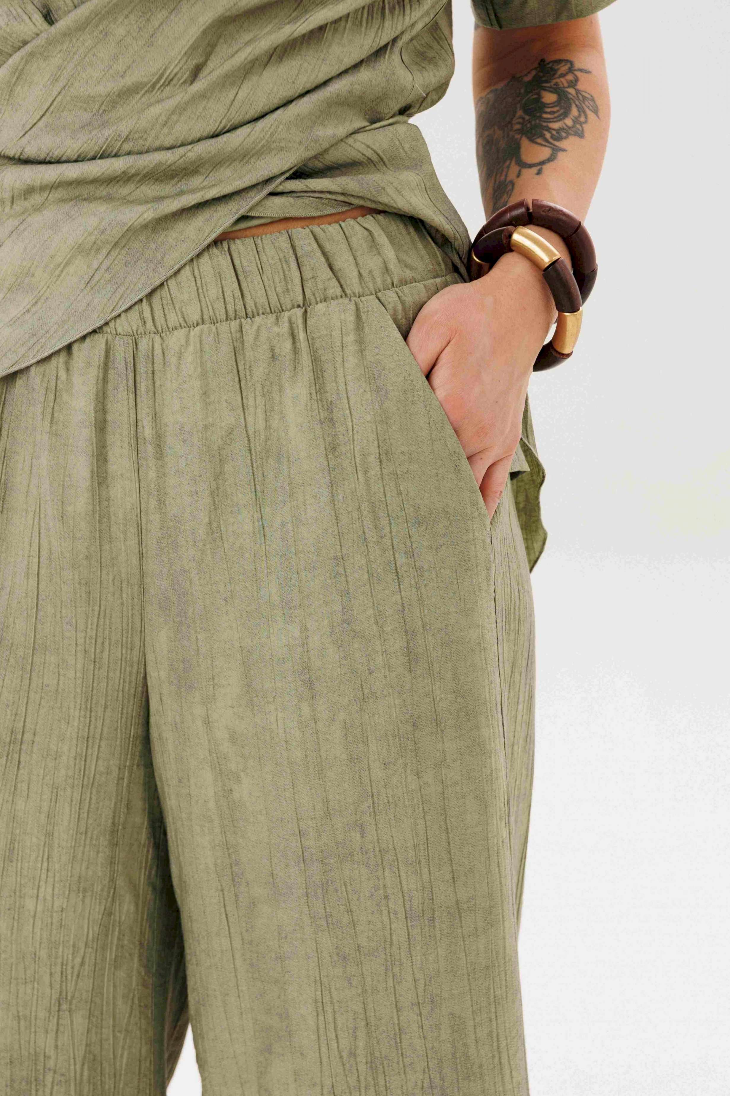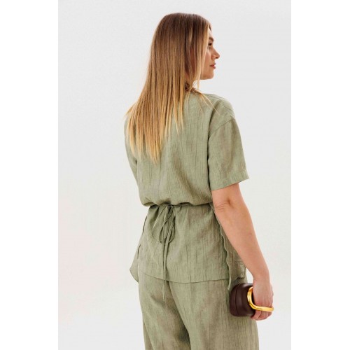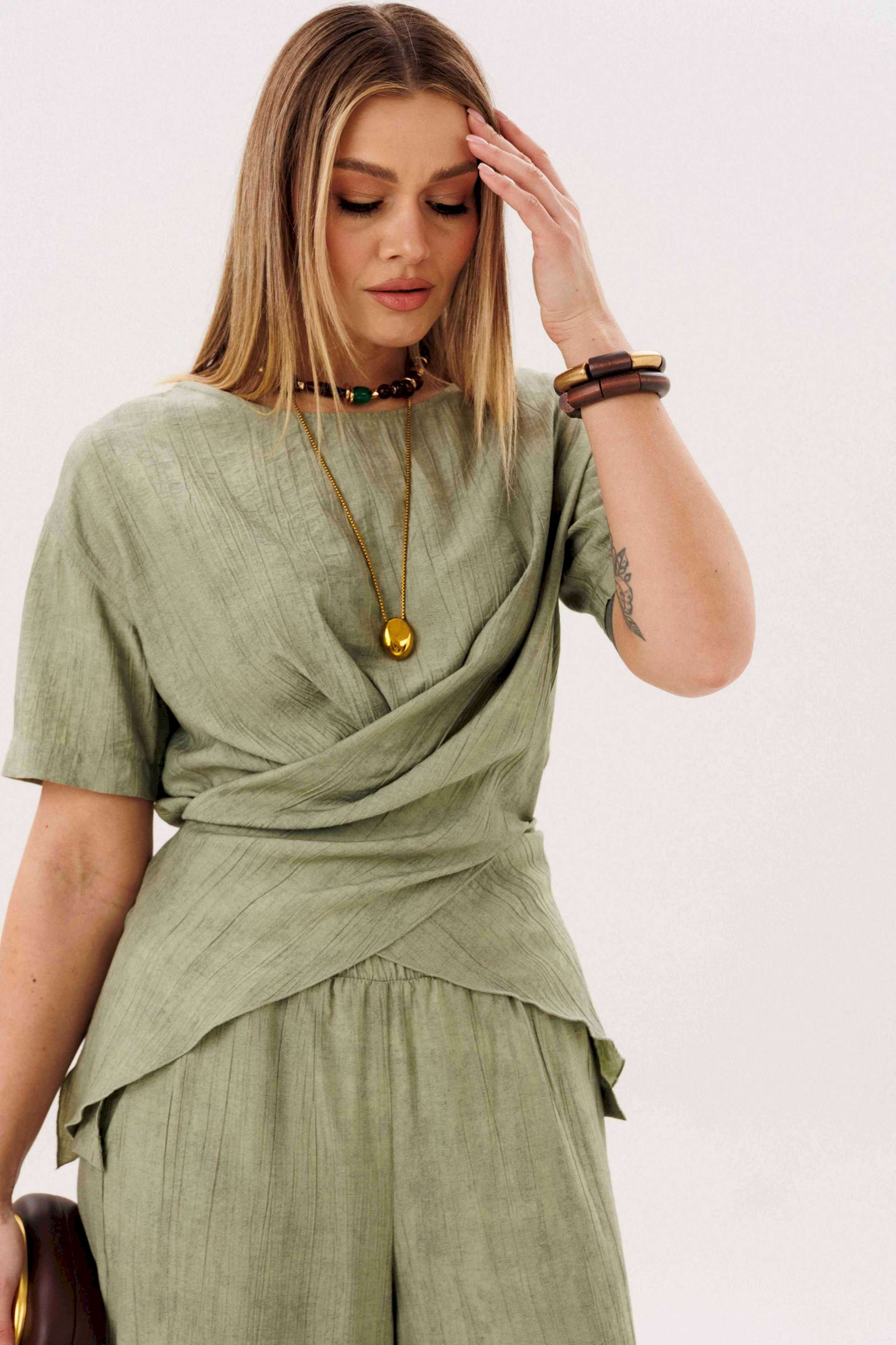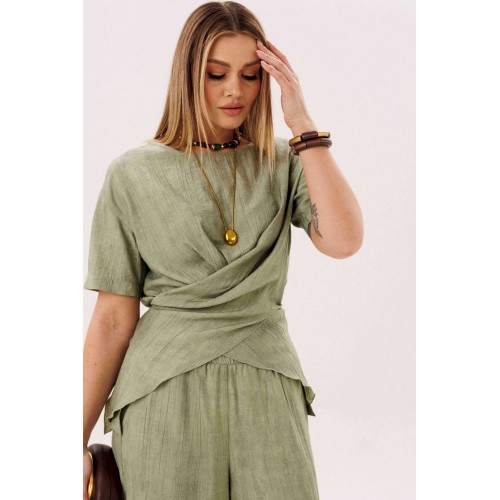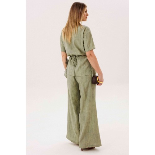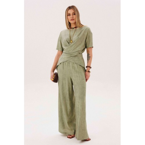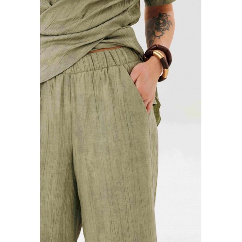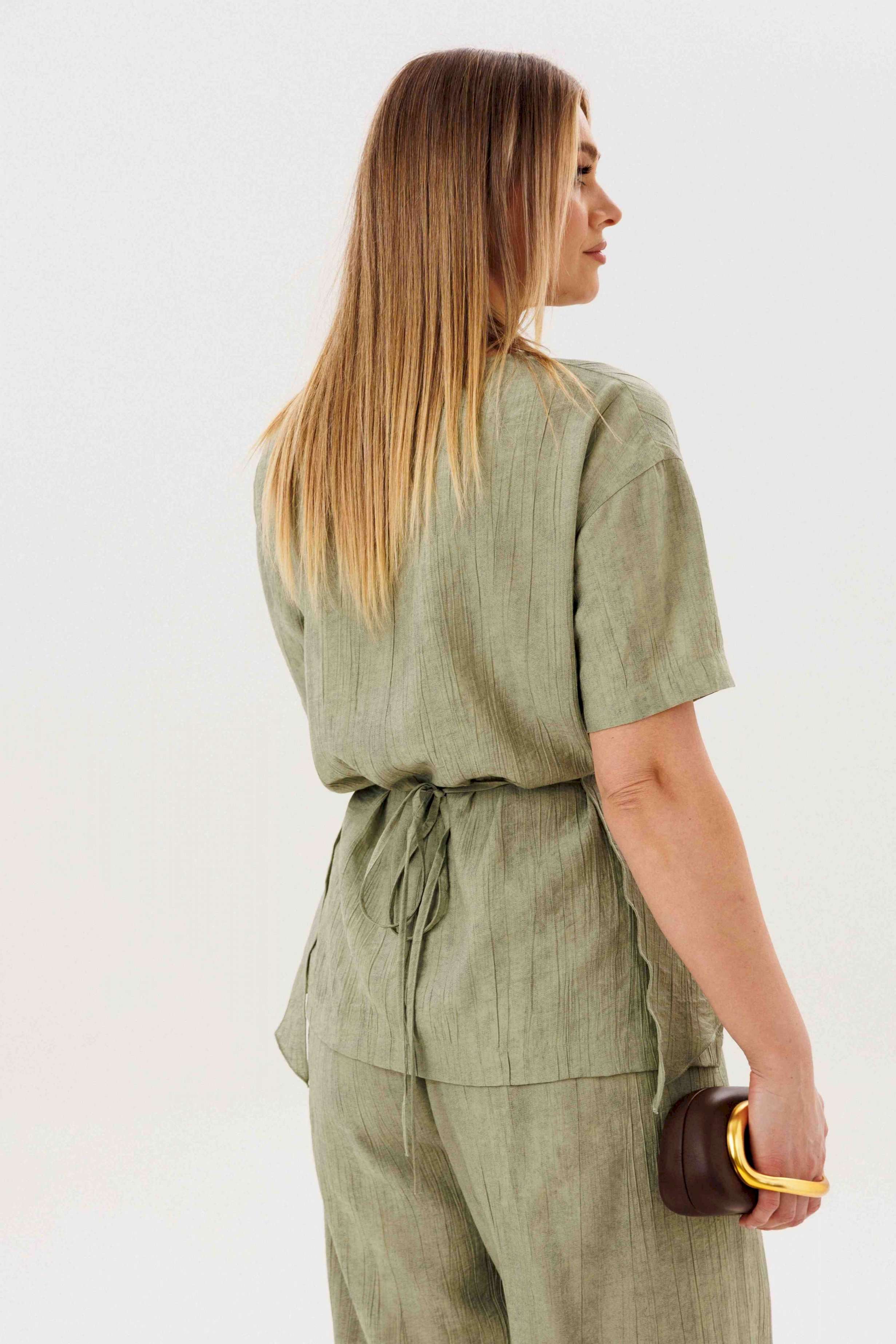 Этот стильный костюм — воплощение летней элегантности и комфорта. Модель выполнена из вискозной ткани с эффектом жатки, что не только актуально в этом сезоне, но и крайне практично: одежда меньше мнется и сохраняет безупречный вид в течение всего дня. Широкие, длинные, струящиеся брюки-палаццо - одна из самых актуальных моделей брюк. Они обладают свойством добавлять нотку расслабленного шика любому образу, и, несомненно, они особенно эффектно выглядят в нарядных комплектах. Брюки свободные, на притачном эластичном поясе. Длина брюк около 108 см. Оригинальная блуза с драпировкой мягко подчеркивает талию, создавая женственный и притягательный силуэт. Свободный силуэт, рубашечный покрой, рукав короткий, эффектная драпировка по переду и кокетливый пояс-завязка по спинке. Длина блузы около 80 см.