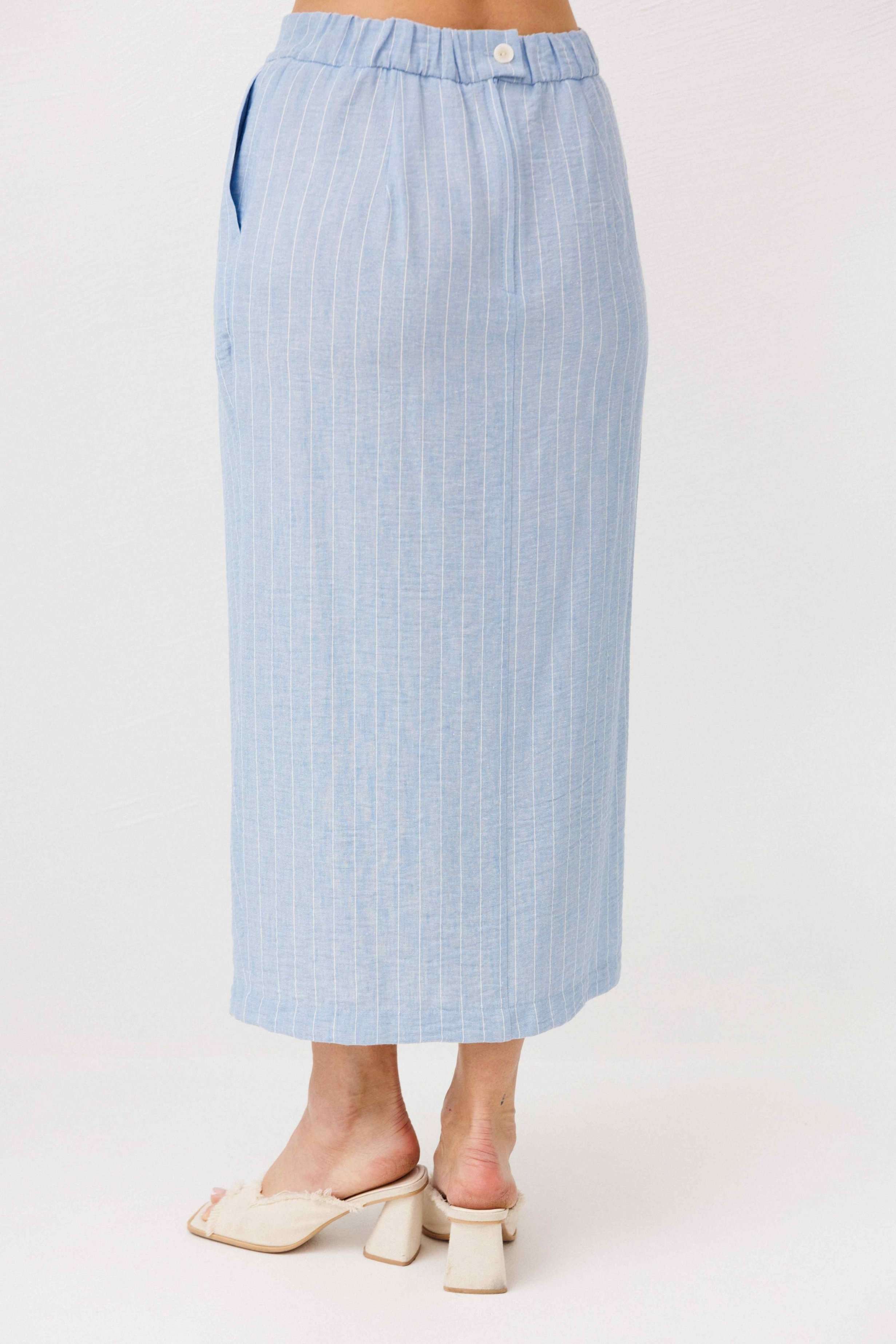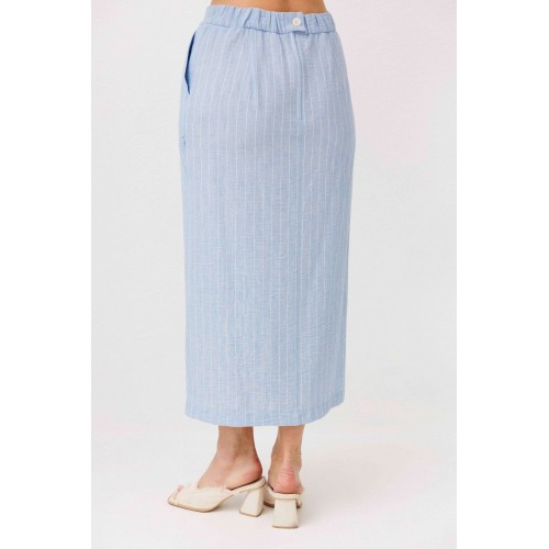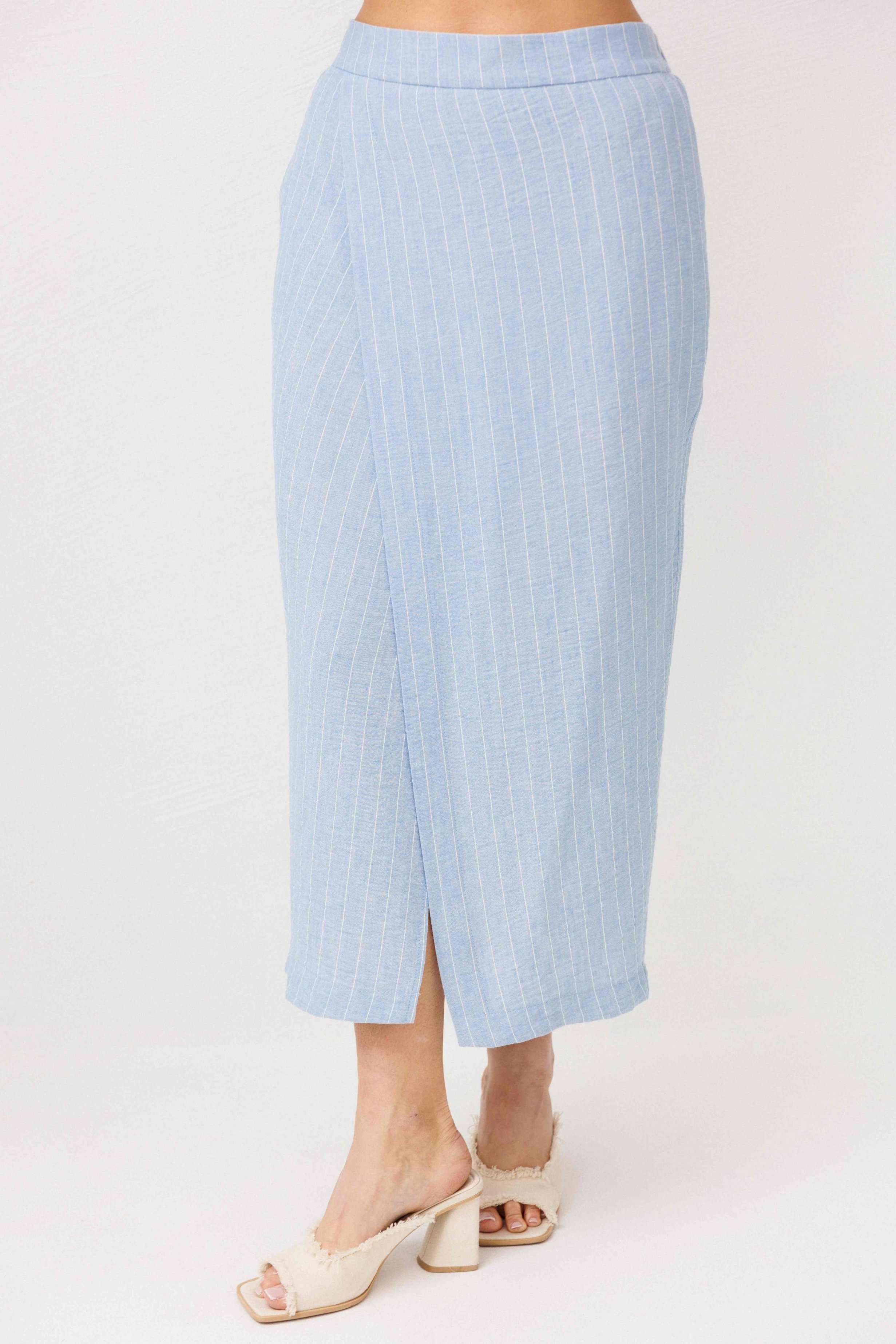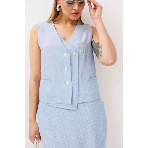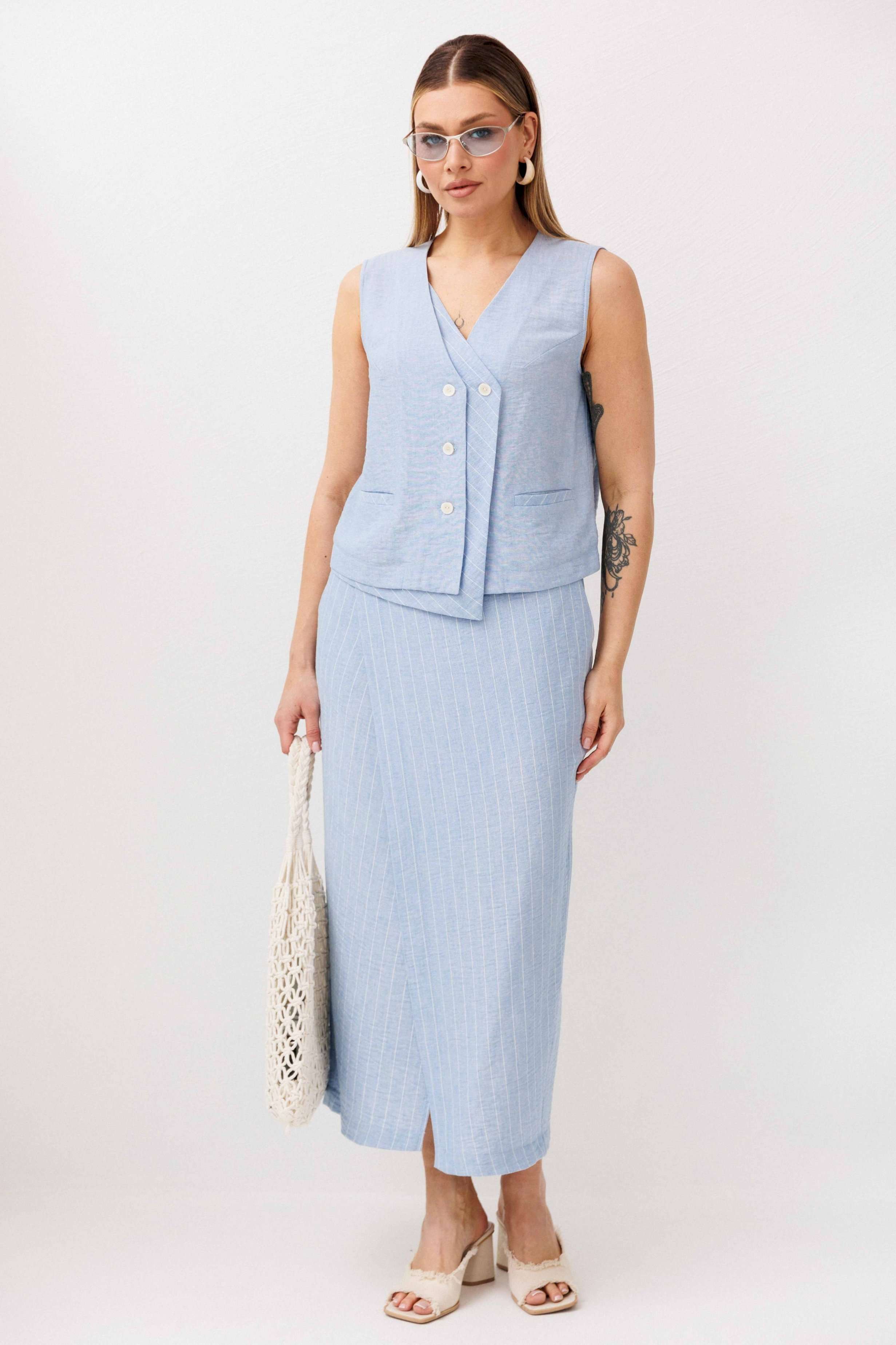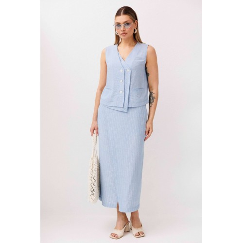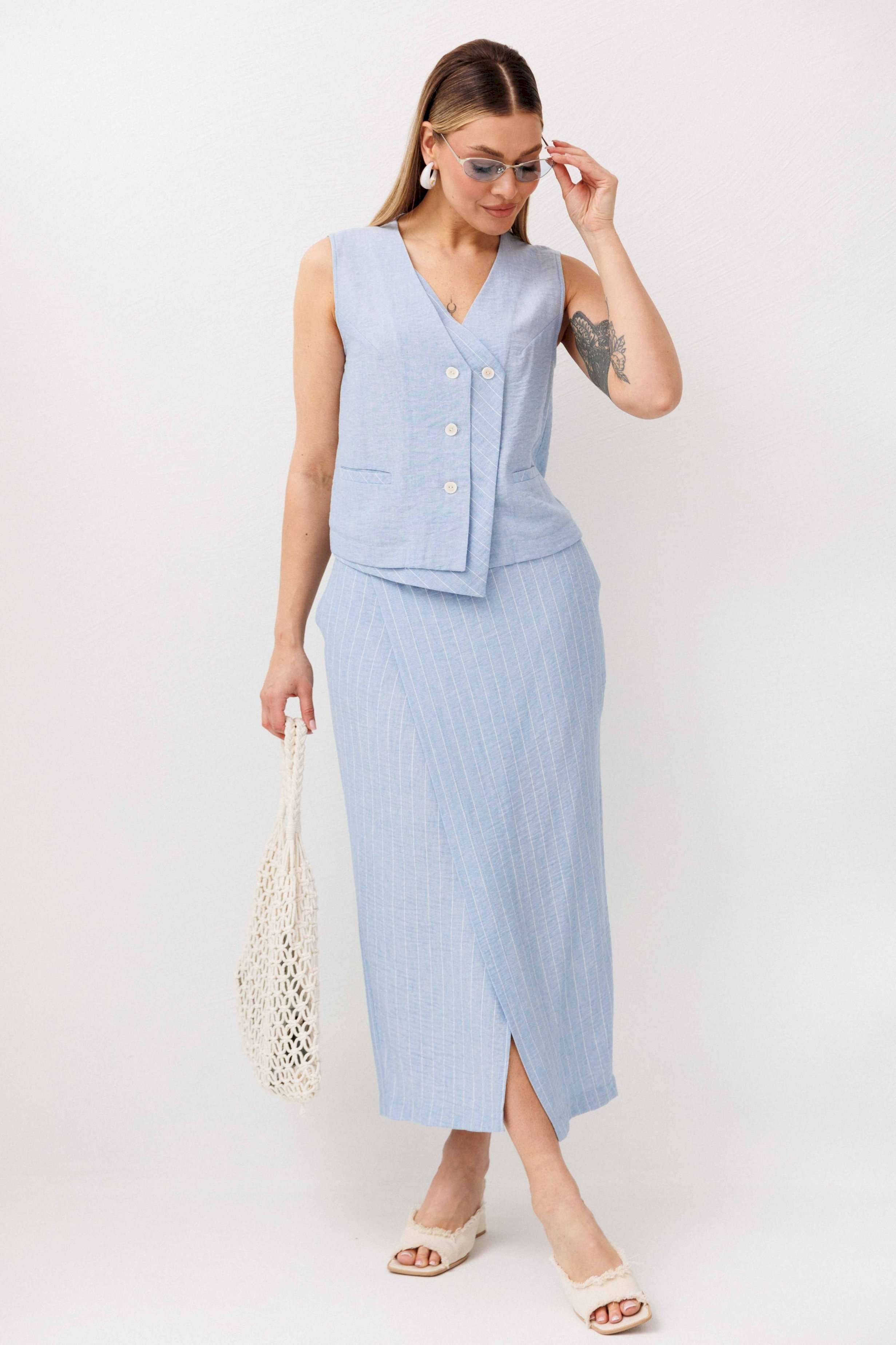 Легкий, стильный и невероятно комфортный комплект из льняного смесового полотна — идеальный выбор для теплого сезона. Он сочетает в себе натуральность, воздухопроницаемость и современный лаконичный дизайн, который легко впишется в повседневный гардероб. Жилет на пуговицах создает аккуратный, собранный силуэт, а юбка миди с запахом добавляет женственности и комфорта при движении. Мягкий голубой оттенок и деликатная вертикальная полоска делают образ свежим, женственным и визуально вытягивают фигуру. Комплект отлично подойдет для прогулок, работы, встреч и отпускных образов. Носите его вместе или по отдельности — каждый элемент легко комбинируется с базовыми вещами и помогает создавать стильные сочетания на каждый день.