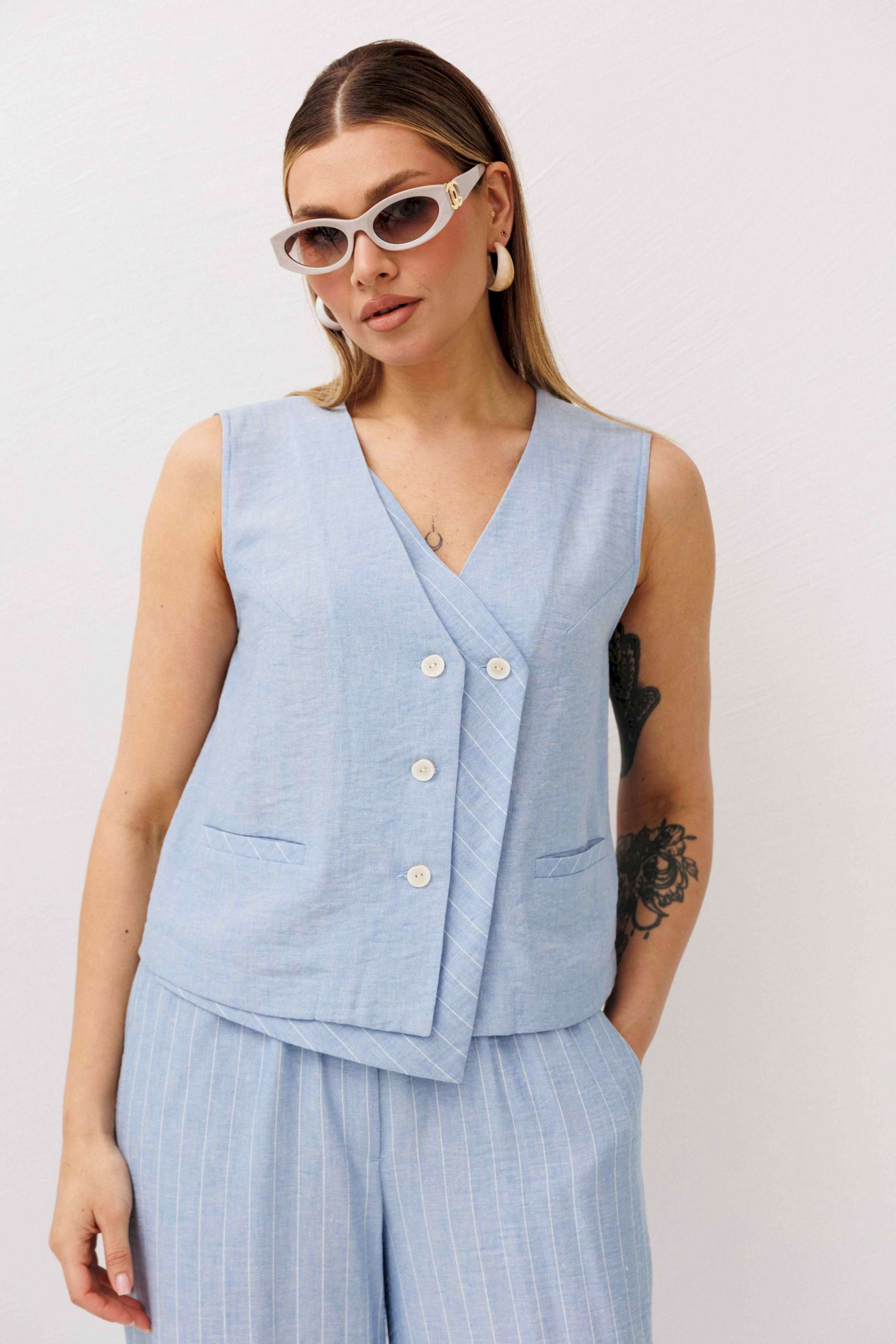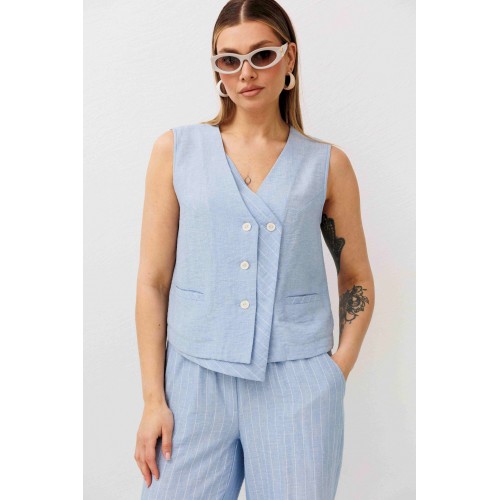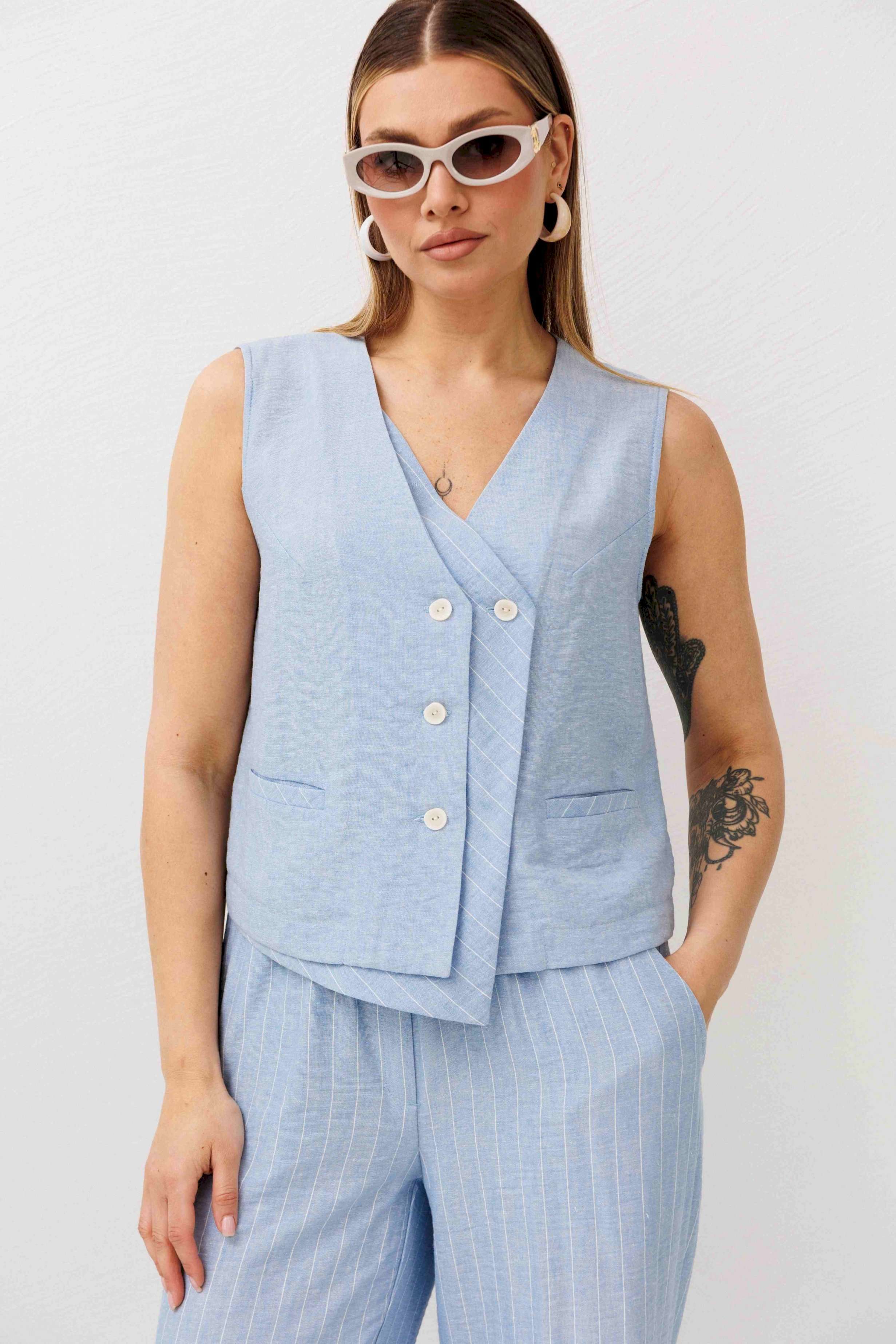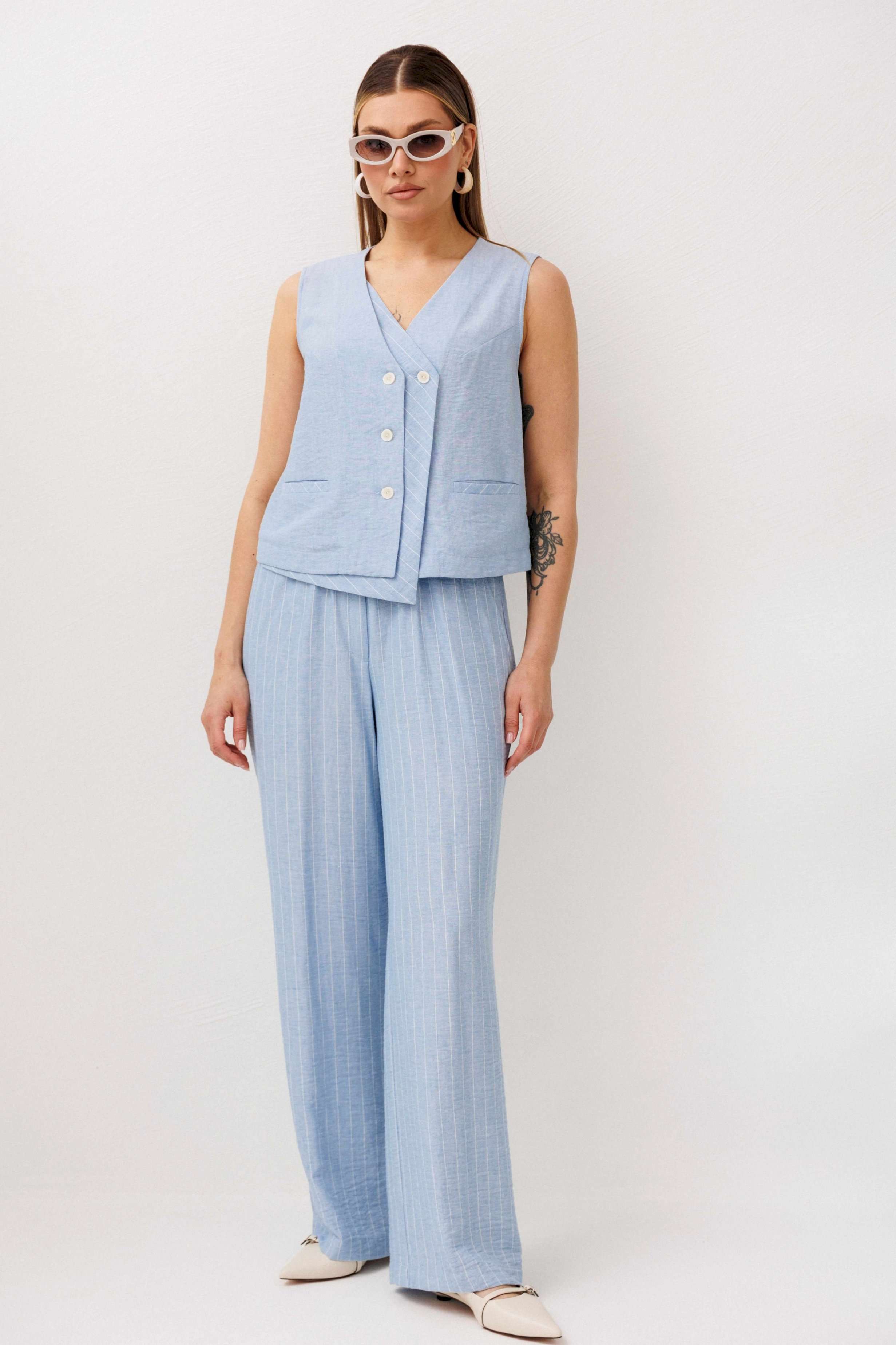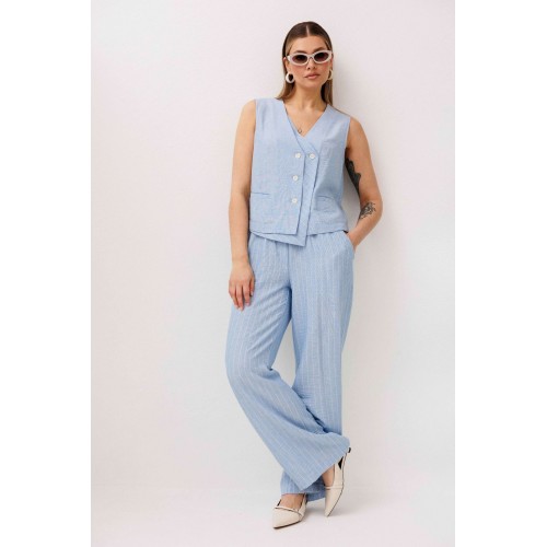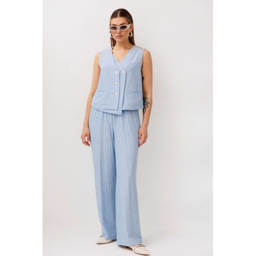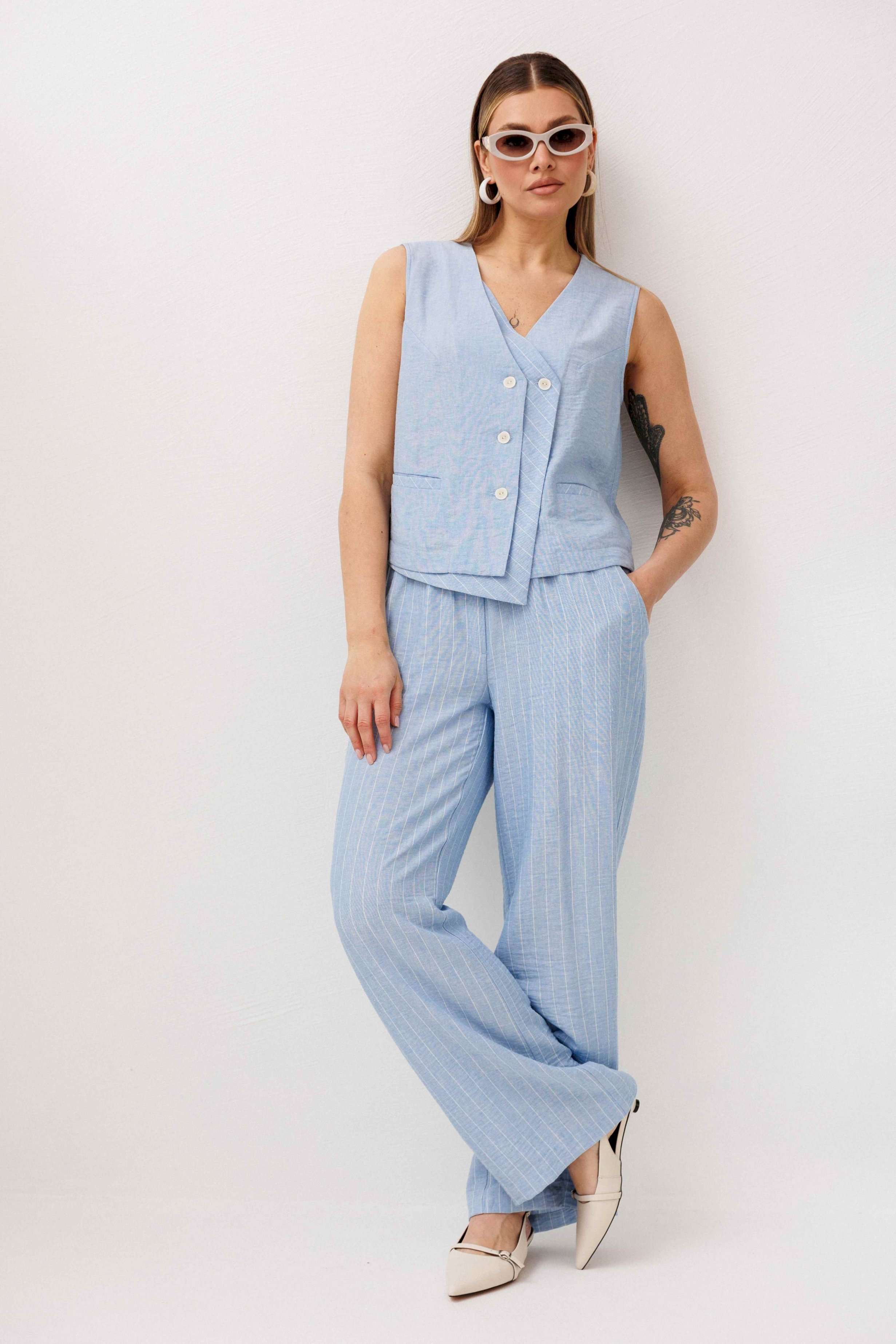 Легкий, стильный и невероятно комфортный комплект из льняного смесового полотна — идеальный выбор для теплого сезона. Он сочетает в себе натуральность, воздухопроницаемость и современный лаконичный дизайн, который легко впишется в повседневный гардероб. Жилет на пуговицах создает аккуратный, собранный силуэт, а свободные широкие брюки дарят ощущение легкости и свободы движений. Мягкий голубой оттенок и деликатная вертикальная полоска делают образ свежим, женственным и визуально вытягивают фигуру. Комплект отлично подойдет для прогулок, работы, встреч и отпускных образов. Носите его вместе или по отдельности — каждый элемент легко комбинируется с базовыми вещами и помогает создавать стильные сочетания на каждый день.
