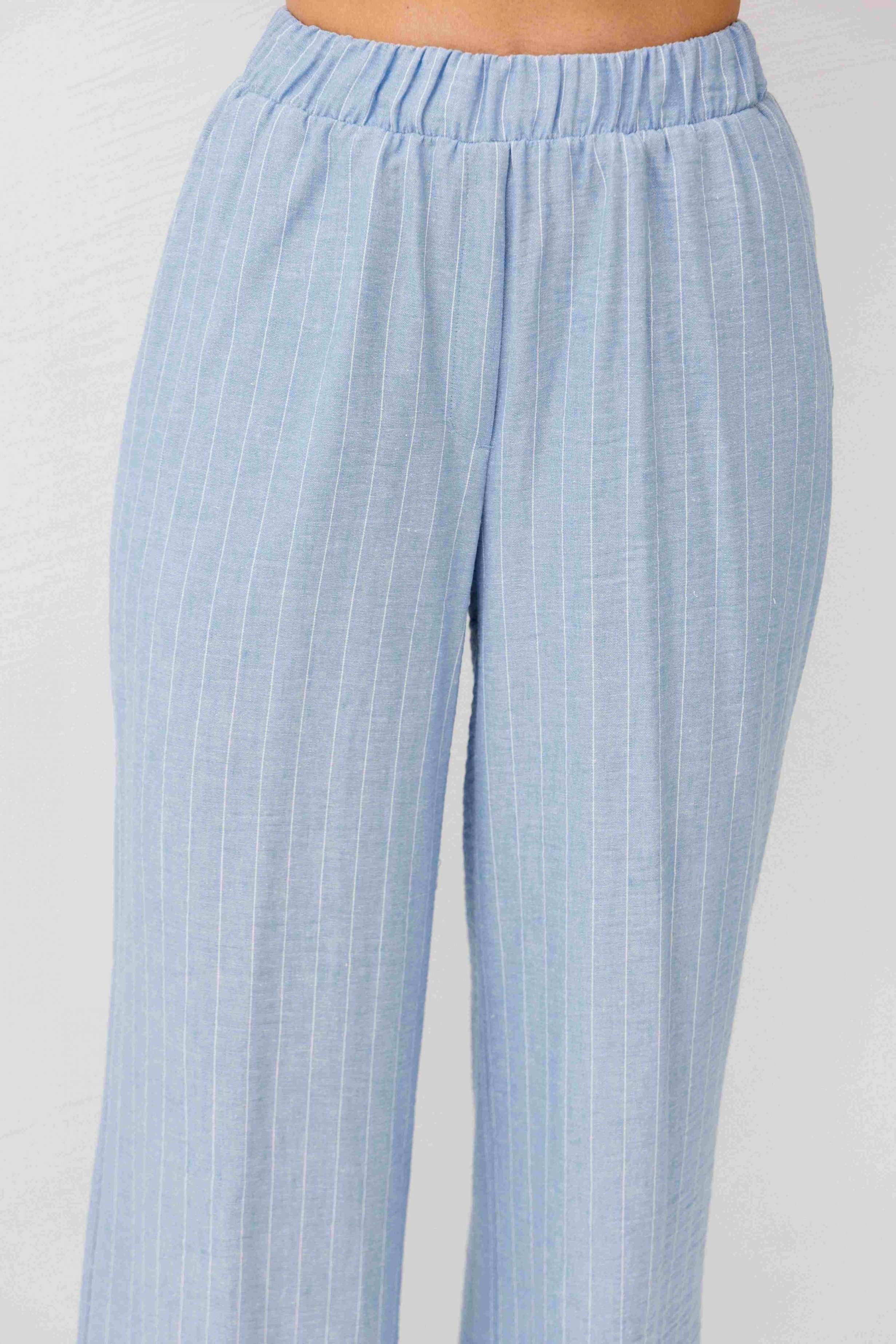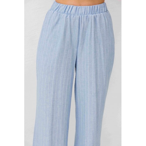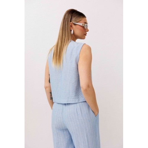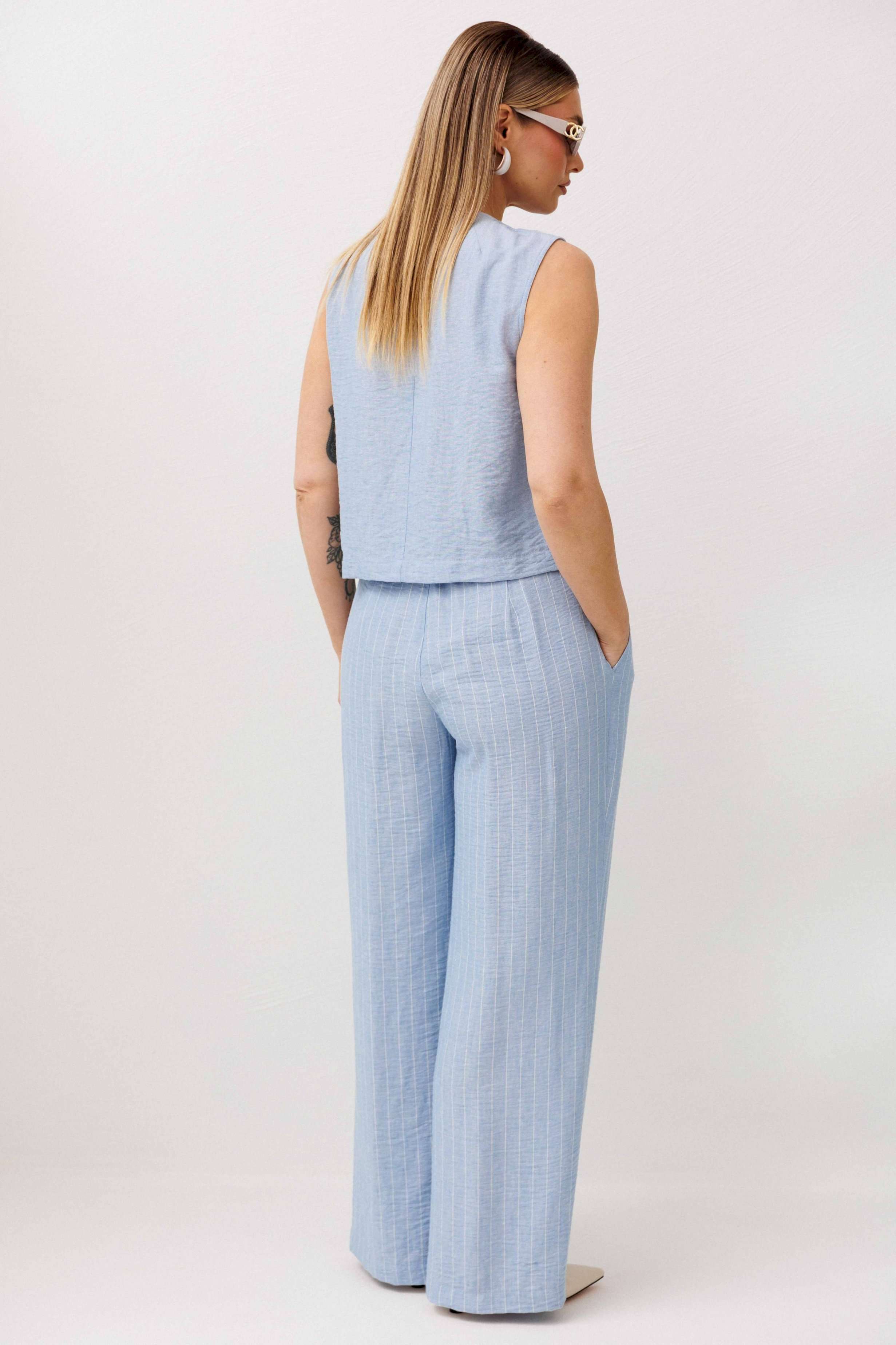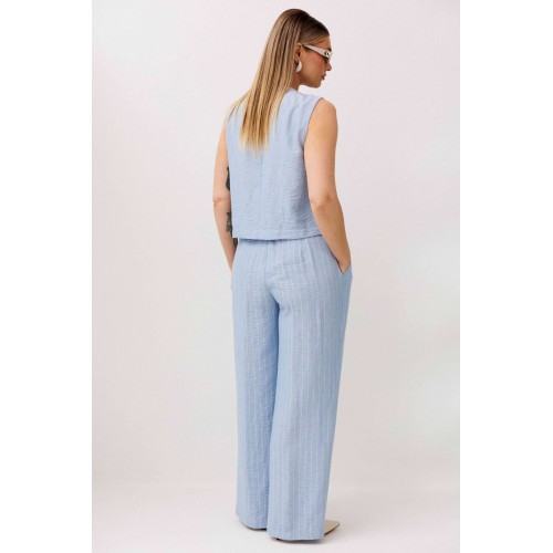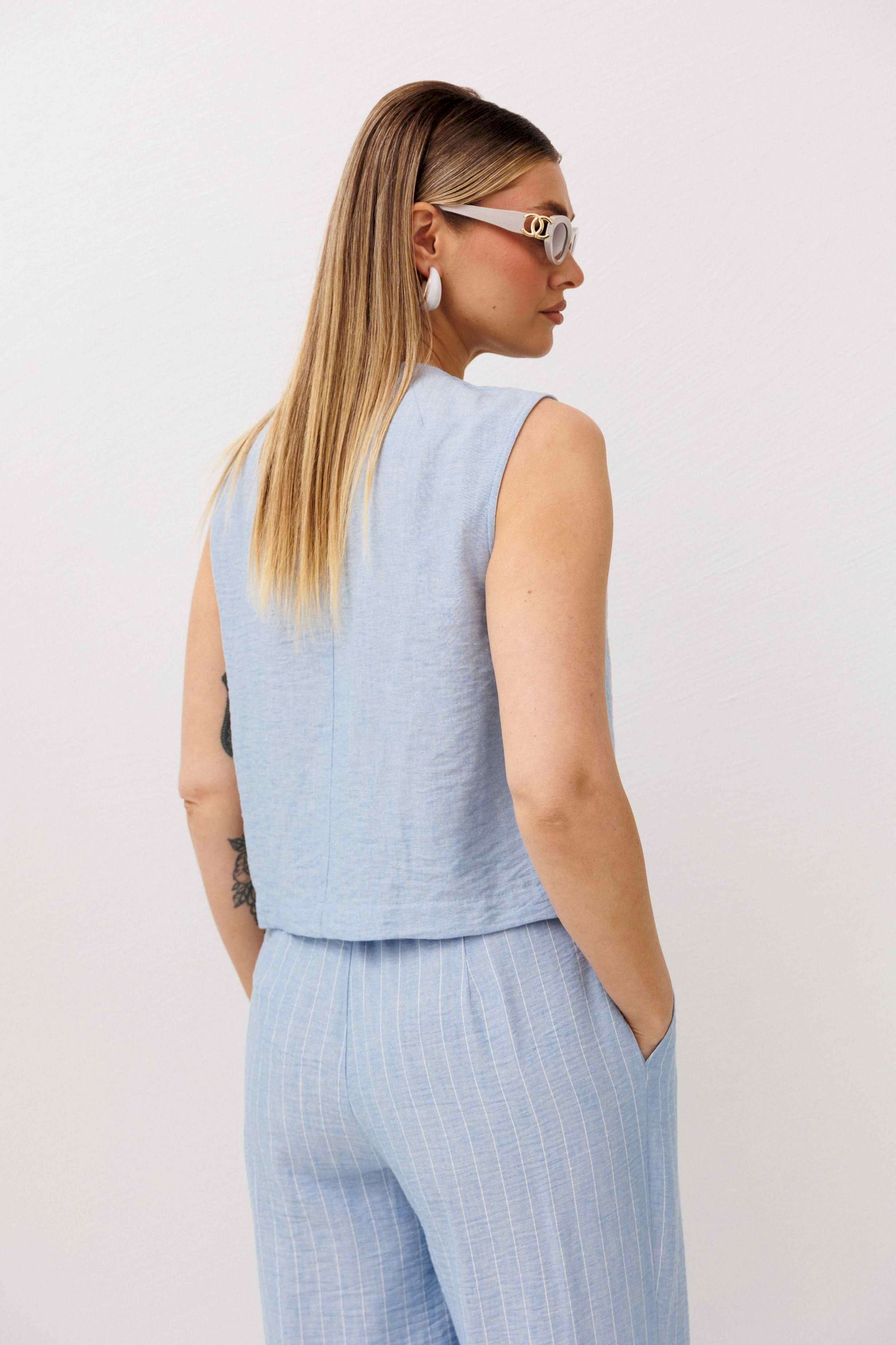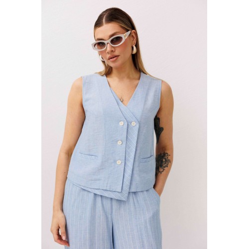 Легкий, стильный и невероятно комфортный комплект из льняного смесового полотна — идеальный выбор для теплого сезона. Он сочетает в себе натуральность, воздухопроницаемость и современный лаконичный дизайн, который легко впишется в повседневный гардероб. Жилет на пуговицах создает аккуратный, собранный силуэт, а свободные широкие брюки дарят ощущение легкости и свободы движений. Мягкий голубой оттенок и деликатная вертикальная полоска делают образ свежим, женственным и визуально вытягивают фигуру. Комплект отлично подойдет для прогулок, работы, встреч и отпускных образов. Носите его вместе или по отдельности — каждый элемент легко комбинируется с базовыми вещами и помогает создавать стильные сочетания на каждый день.