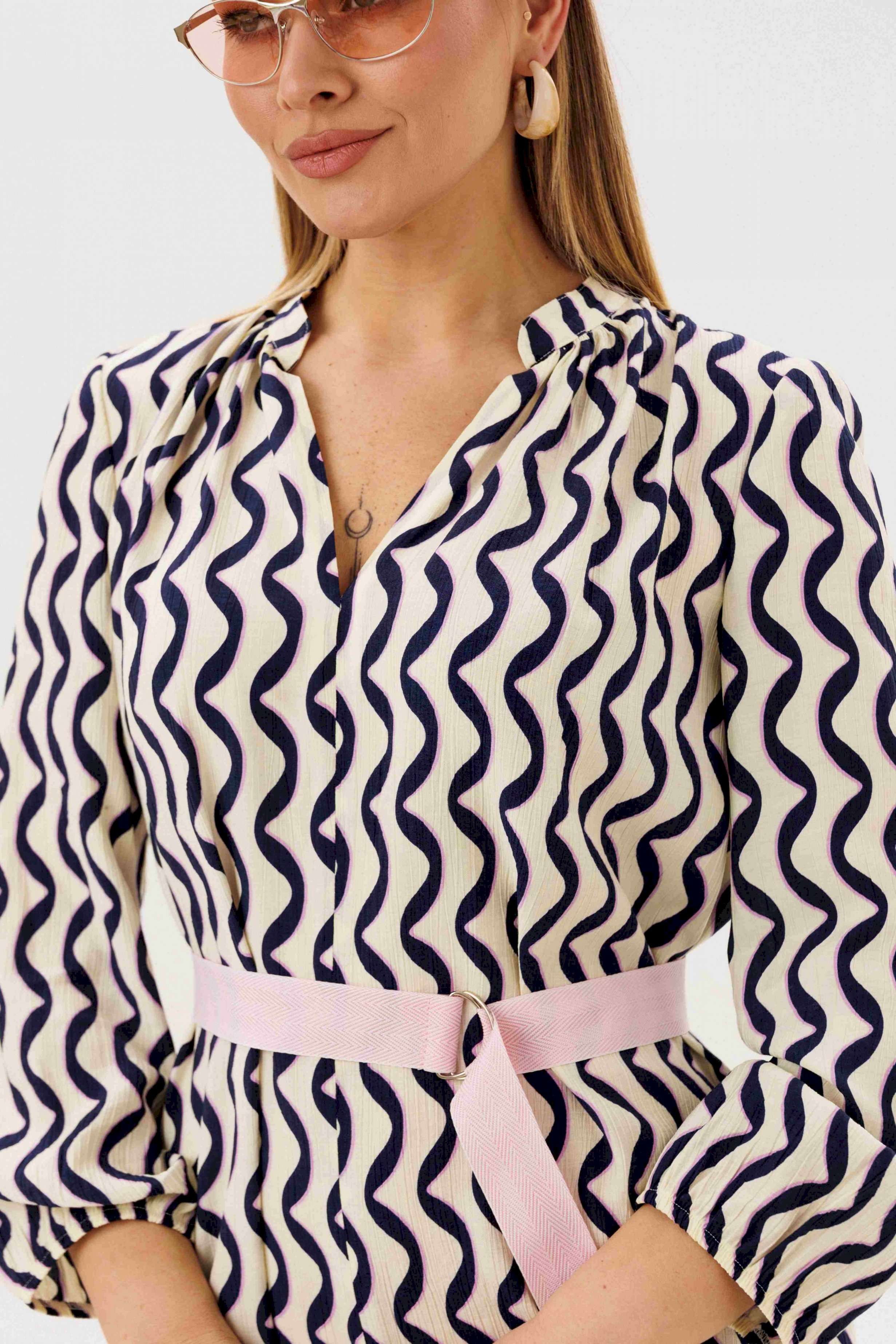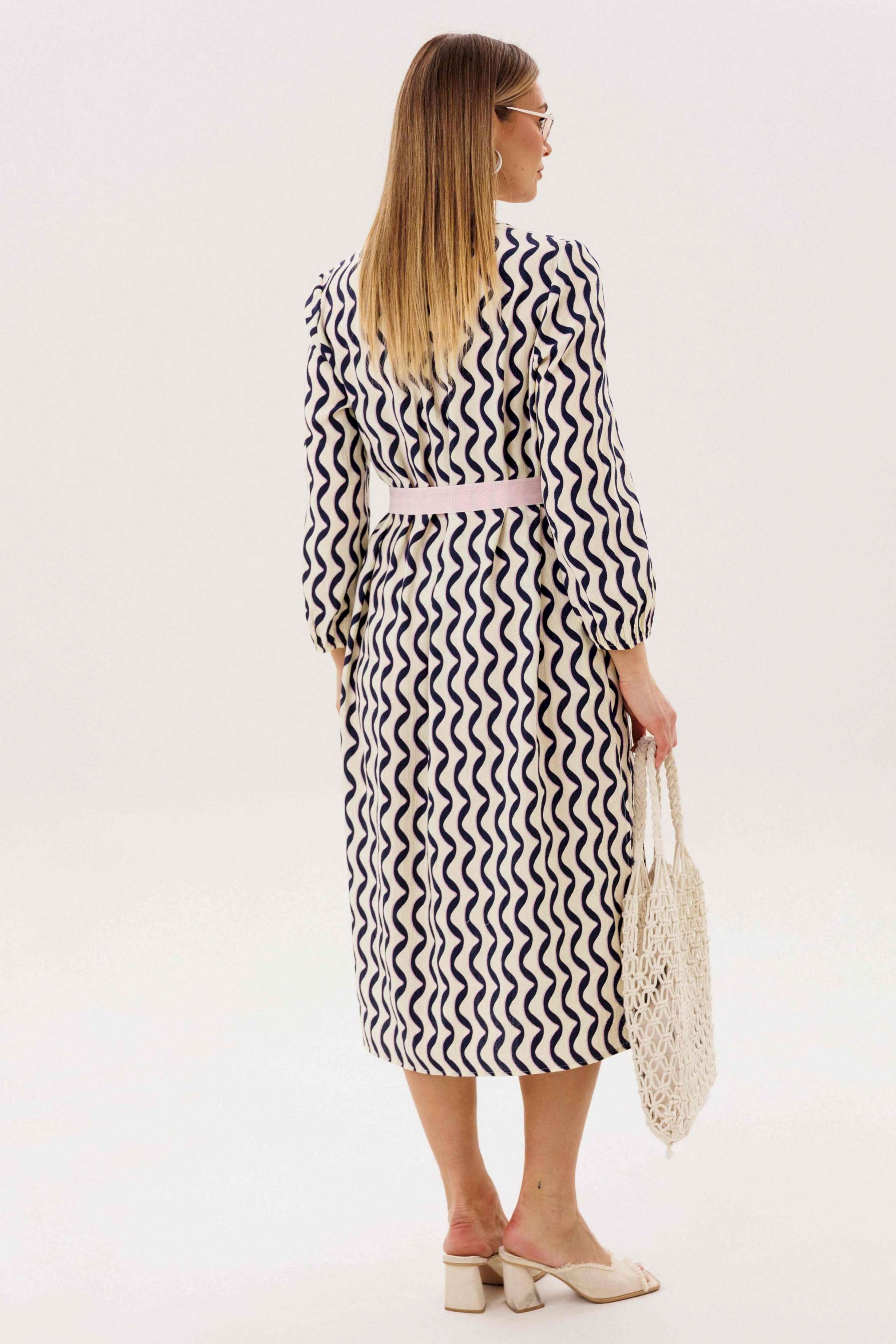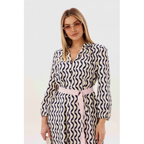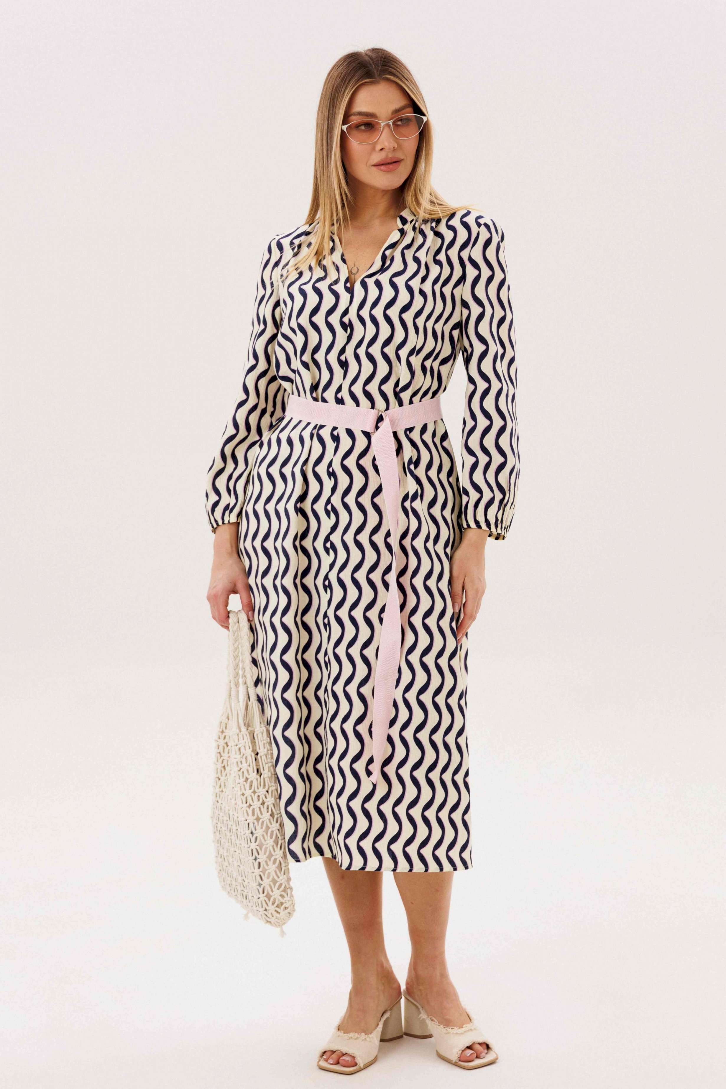Лёгкое и стильное платье А-силуэта выполнено из вискозного полотна с эффектом крэш, что придаёт изделию выразительную фактуру и обеспечивает комфорт в носке. Модель украшена актуальным графичным принтом, который делает образ современным и динамичным. Платье имеет частичную застёжку в верхней части полочки, что добавляет удобства и функциональности. Воротник-стойка формирует аккуратную линию горловины, а лёгкая сборка по шву втачивания воротника в области полочки и по центру спинки придаёт мягкий объём и женственность силуэту. А-силуэт красиво садится по фигуре, обеспечивая свободу движения и визуальную лёгкость. Съёмный пояс из контрастной ременной тесьмы позволяет подчеркнуть талию и варьировать образ — от свободного до более структурированного. Идеальный вариант для повседневных, летних и городских образов.
