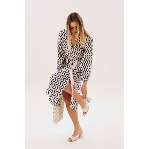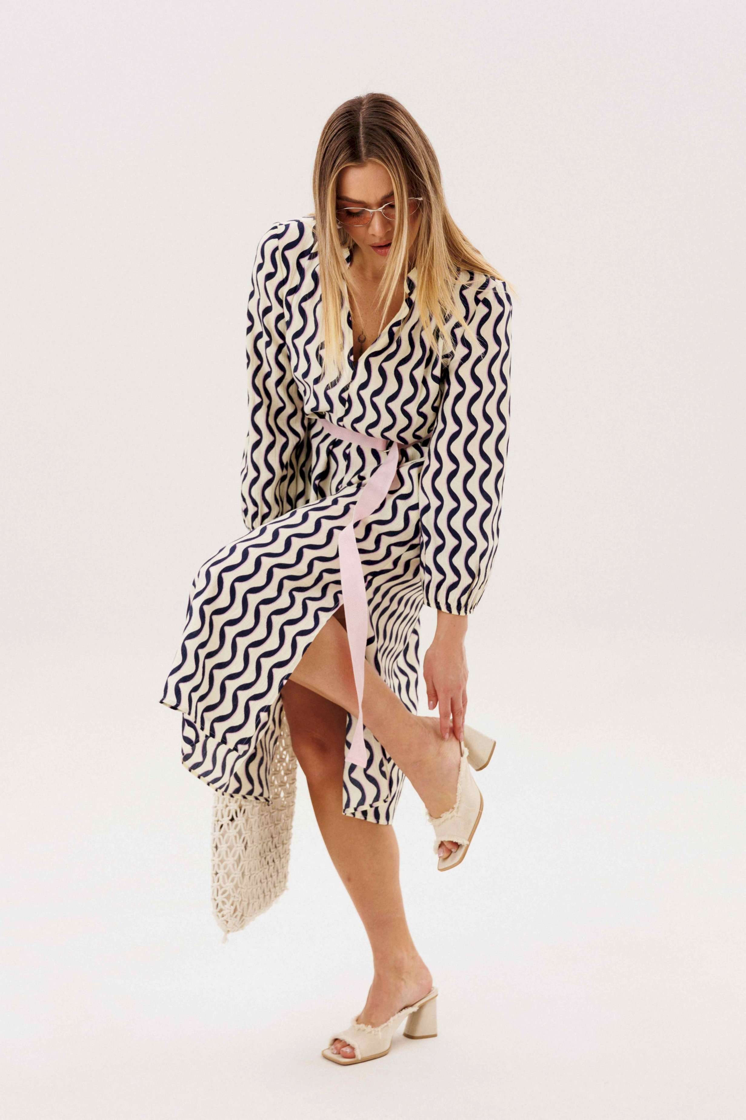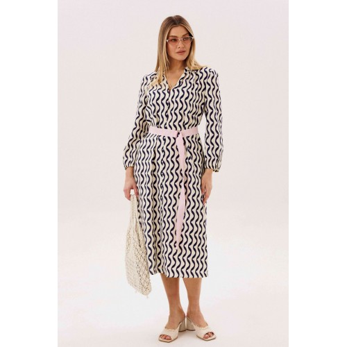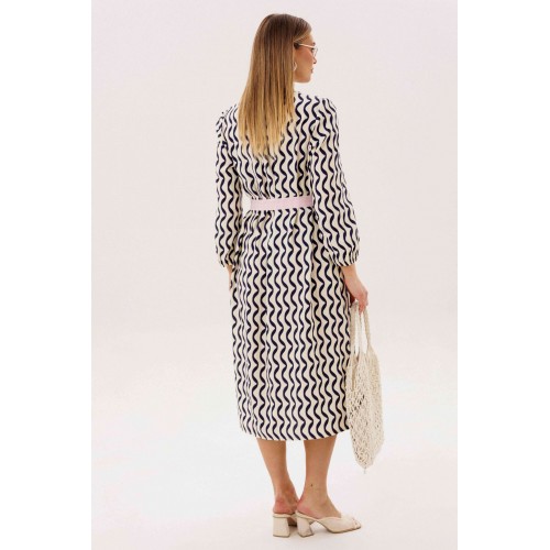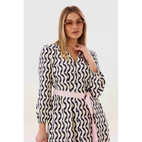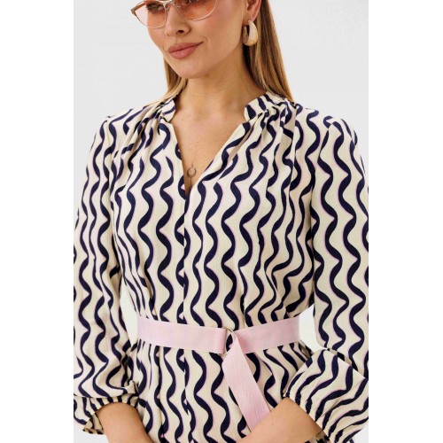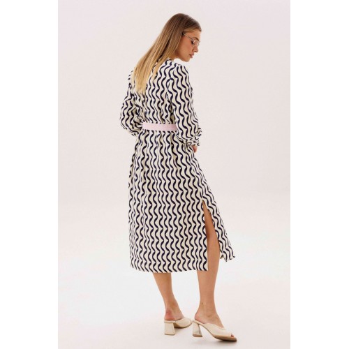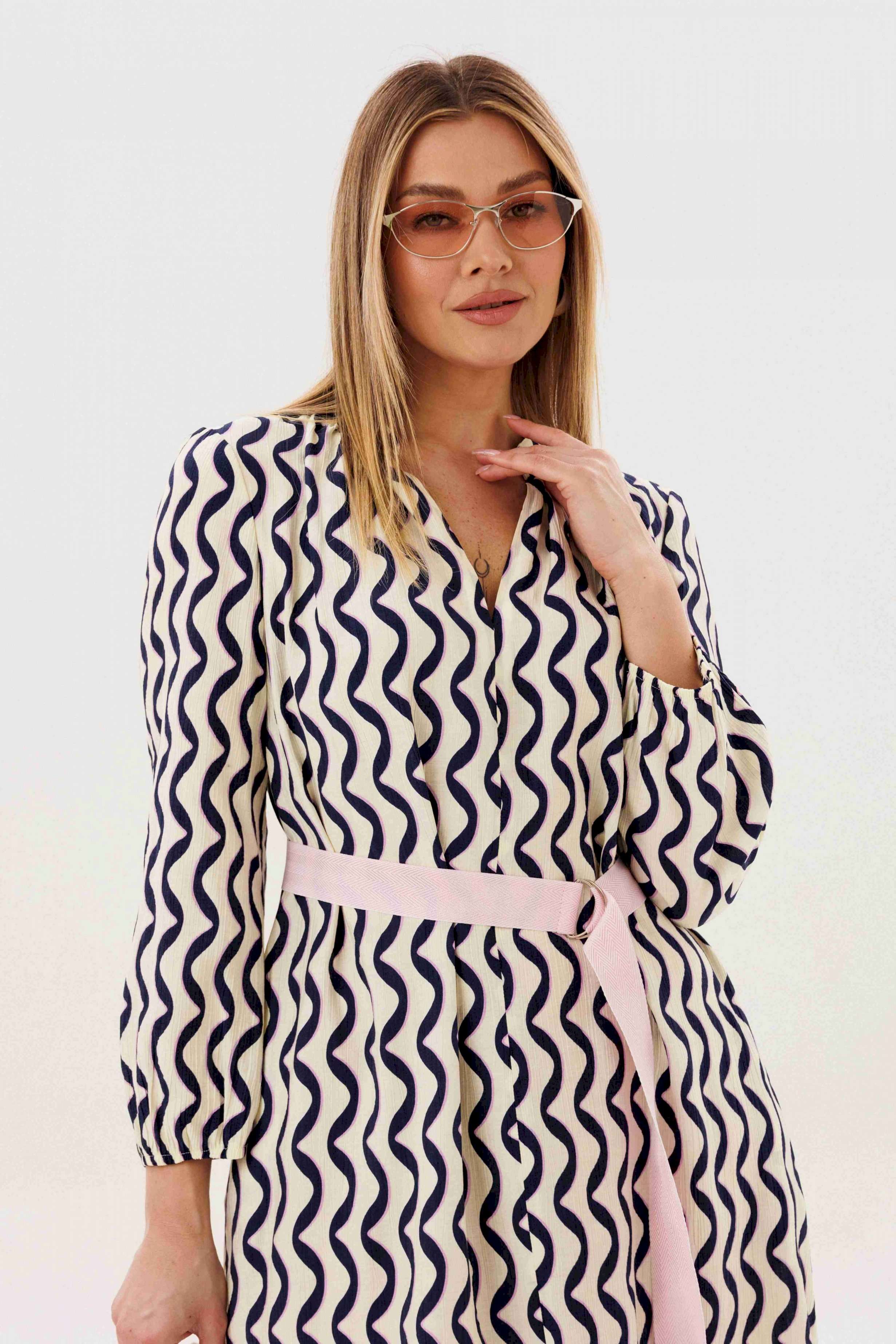 Лёгкое и стильное платье А-силуэта выполнено из вискозного полотна с эффектом крэш, что придаёт изделию выразительную фактуру и обеспечивает комфорт в носке. Модель украшена актуальным графичным принтом, который делает образ современным и динамичным. Платье имеет частичную застёжку в верхней части полочки, что добавляет удобства и функциональности. Воротник-стойка формирует аккуратную линию горловины, а лёгкая сборка по шву втачивания воротника в области полочки и по центру спинки придаёт мягкий объём и женственность силуэту. А-силуэт красиво садится по фигуре, обеспечивая свободу движения и визуальную лёгкость. Съёмный пояс из контрастной ременной тесьмы позволяет подчеркнуть талию и варьировать образ — от свободного до более структурированного. Идеальный вариант для повседневных, летних и городских образов.