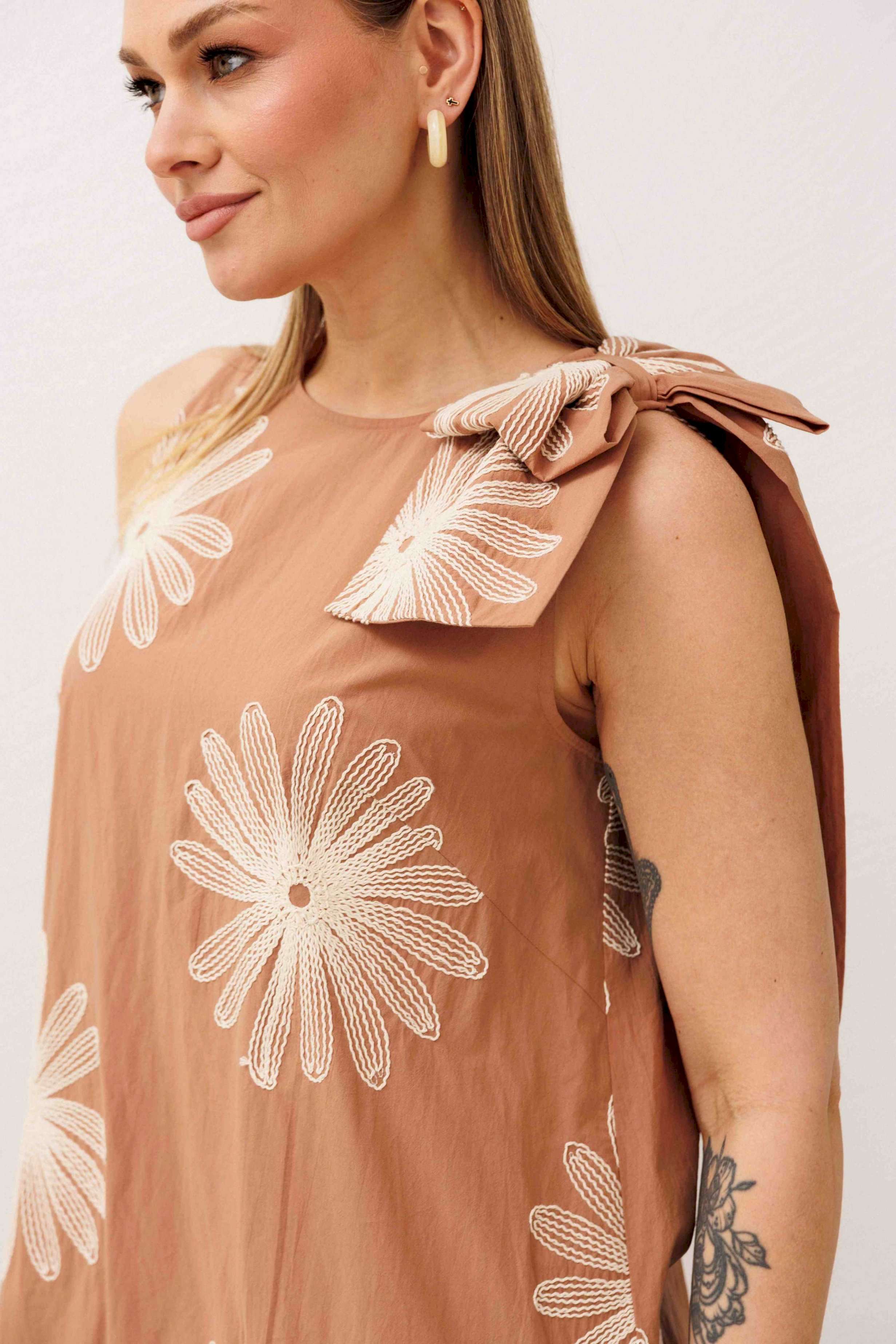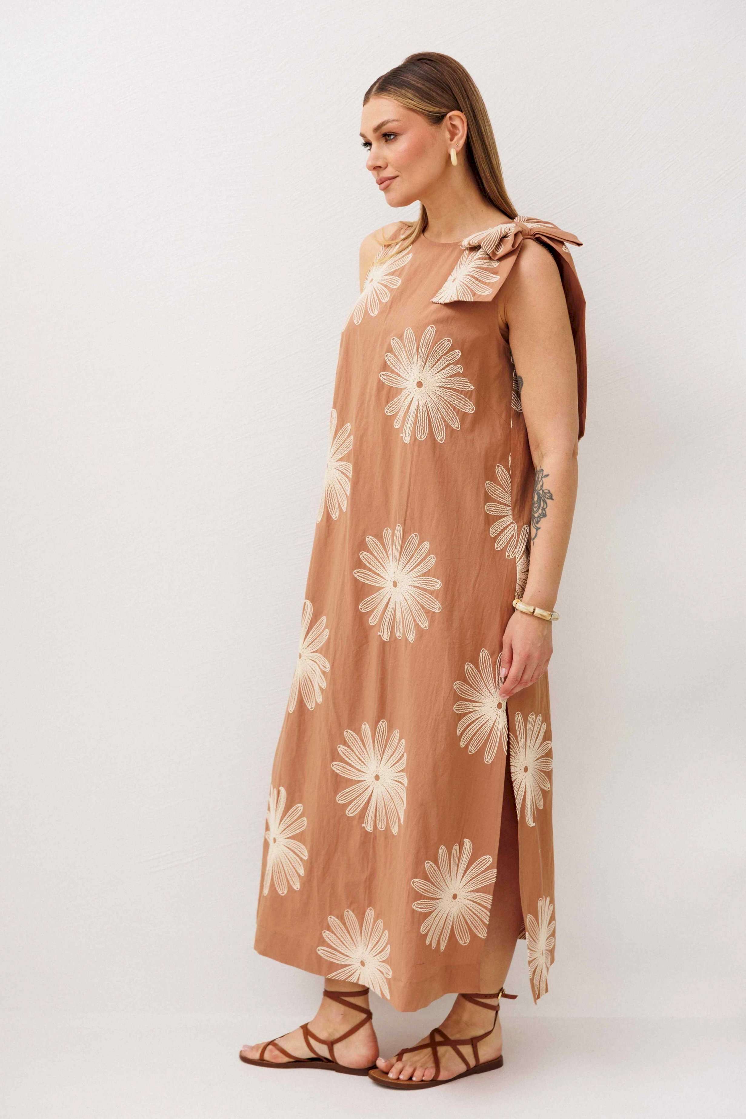Это стильное летнее платье-макси станет идеальным дополнением вашего гардероба для солнечных дней и особых моментов. Платье свободного А-силуэта, который отлично сидит на любой фигуре и подчеркивает ее достоинства. Элегантный акцент в виде крупного съемного банта на плече придает образу женственности. Изделие выполнено из легкой воздухопроницаемой хлопковой ткани. Это обеспечивает максимальный комфорт даже в самую жаркую погоду. Длина платья около 132 см