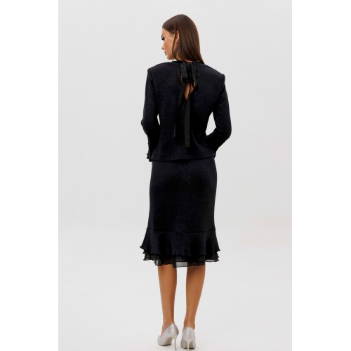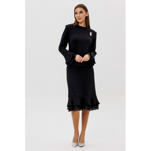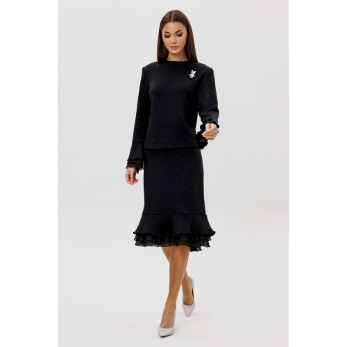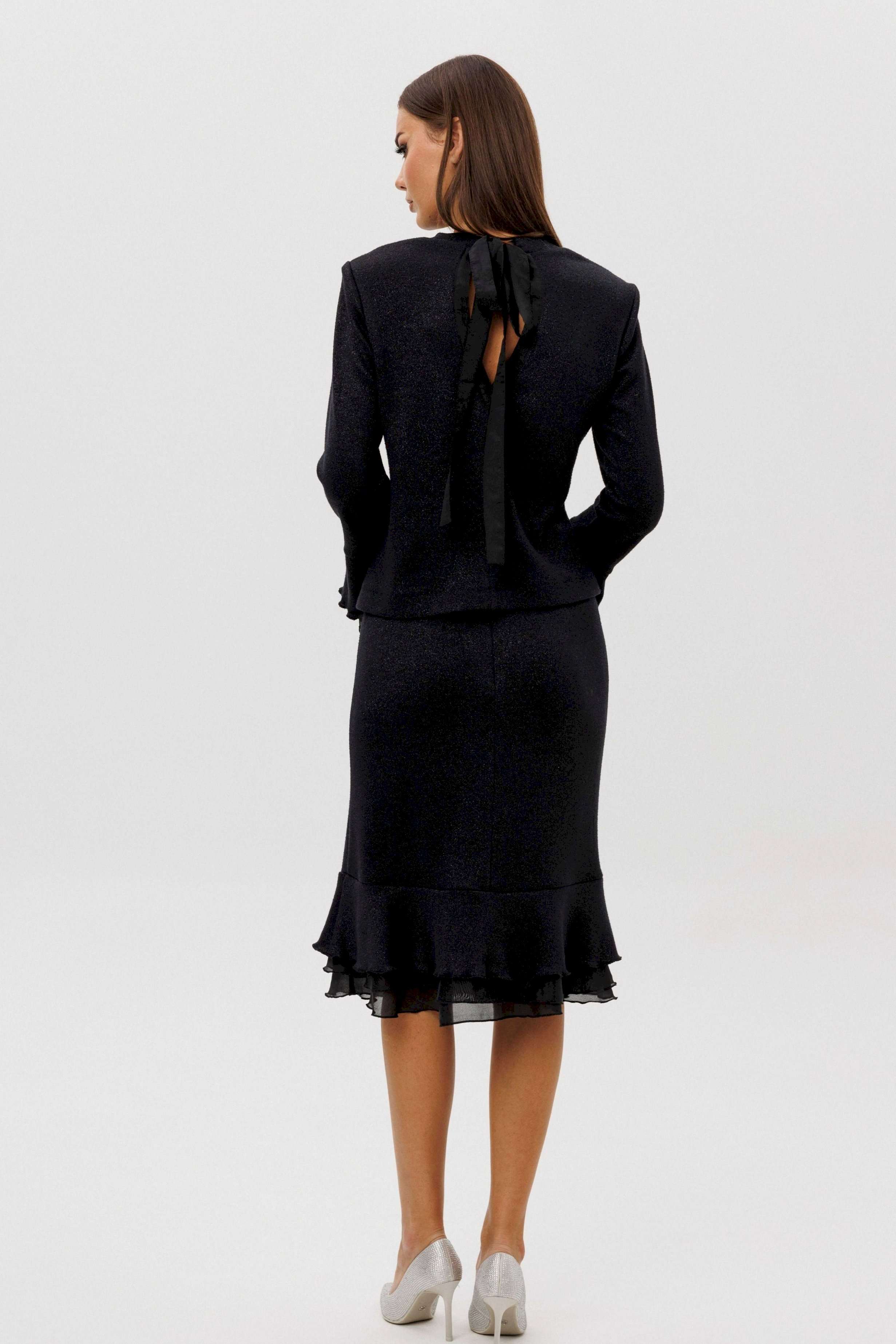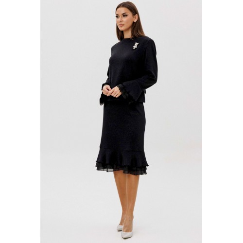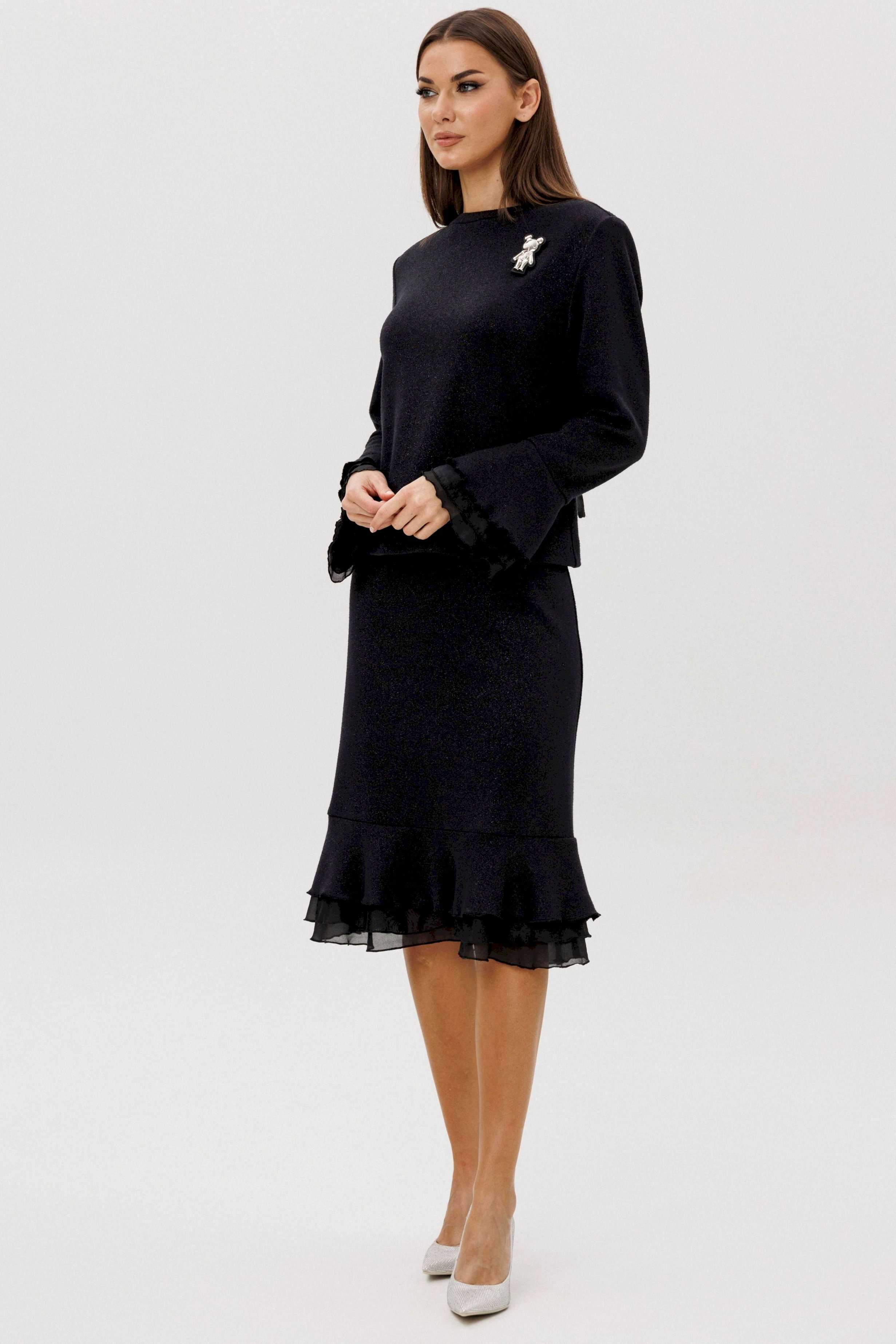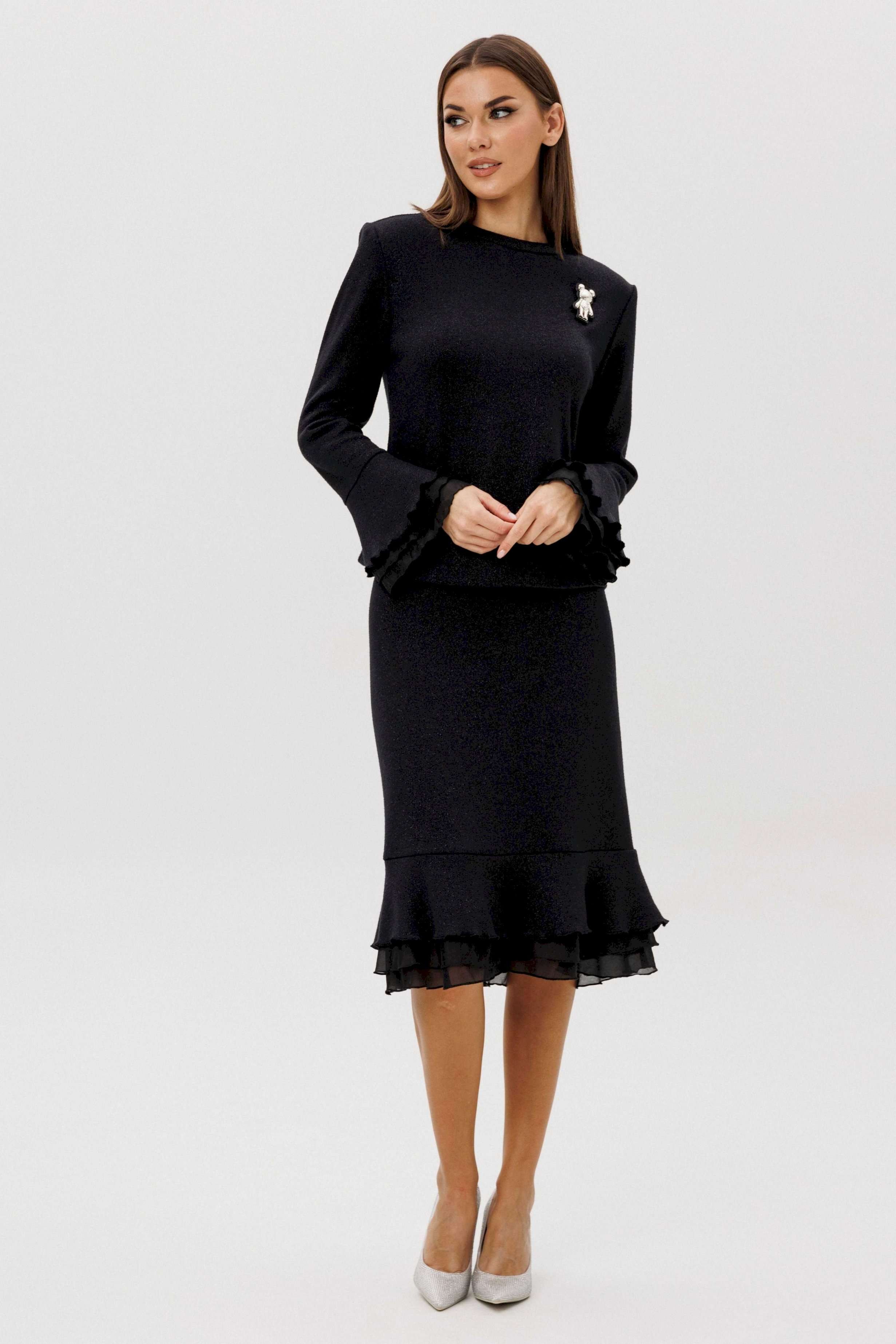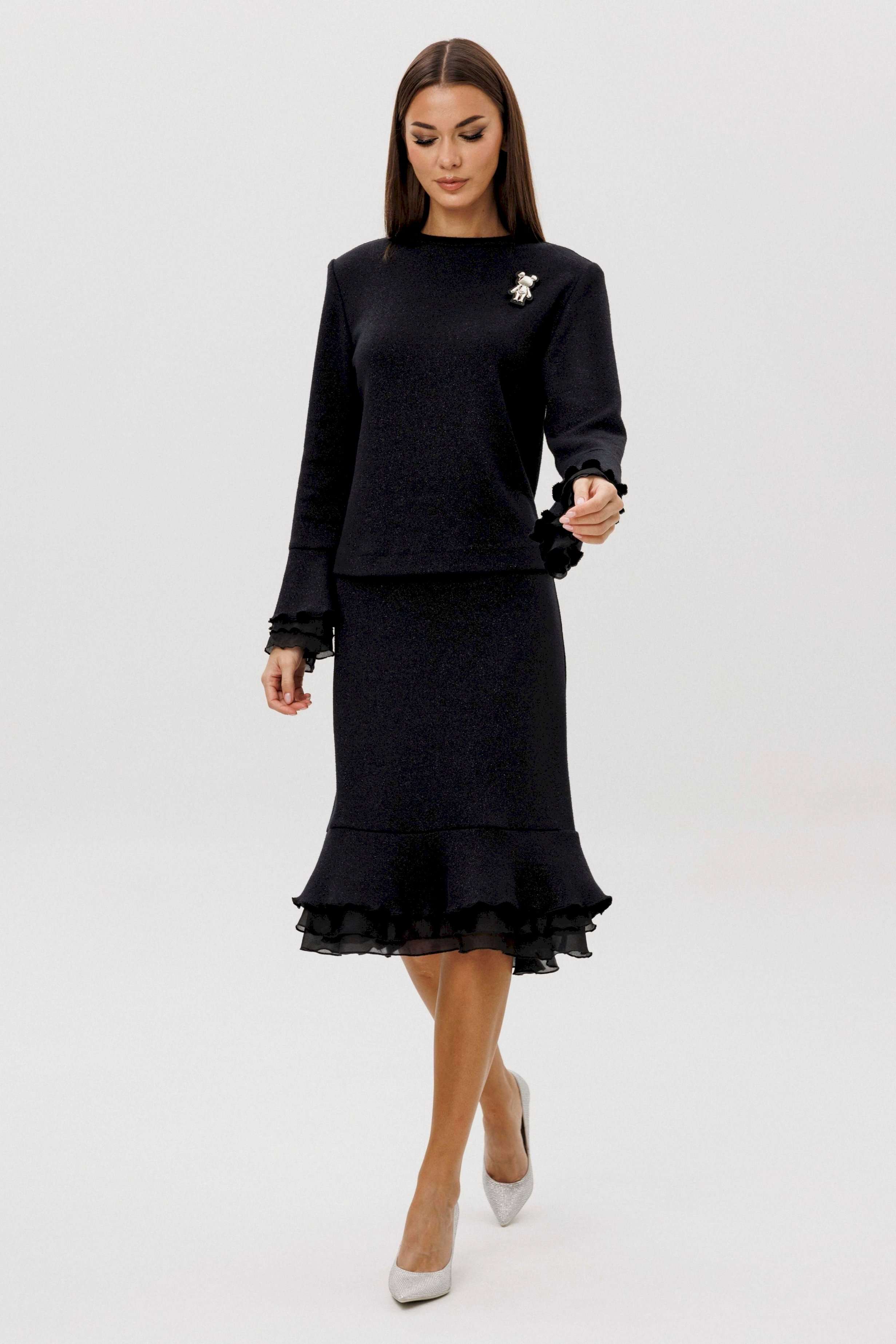 Изящный юбочный комплект из мягкого вискозного трикотажа с деликатным вкраплением люрекса — воплощение утончённости и женственности. Фактура полотна мягко переливается в цвете основы, создавая благородное сияние без излишней яркости. Воланы из лёгкого вискозного шифона придают образу воздушность и движение, а очаровательная бант-завязка на спинке становится стильным акцентом, добавляющим романтичное настроение. Комплект идеально подойдёт для праздничных событий, ужина или элегантного повседневного образа. В нём легко чувствовать себя уверенно и безупречно в любой ситуации.