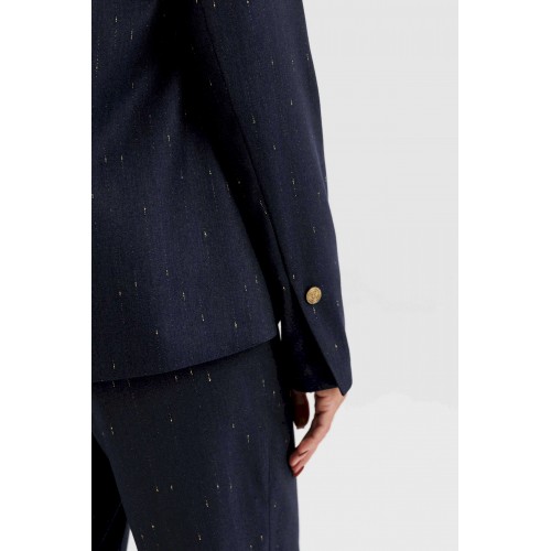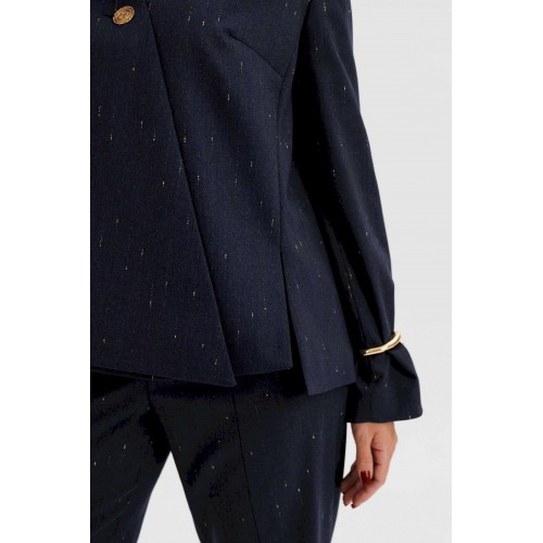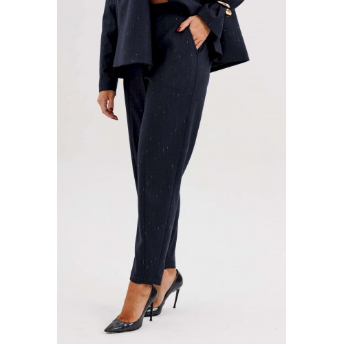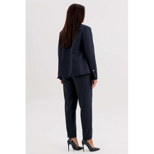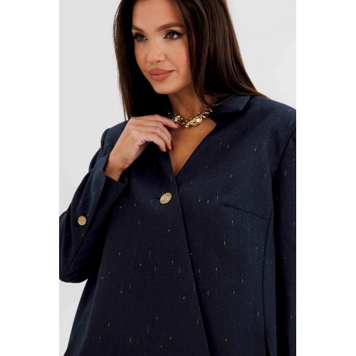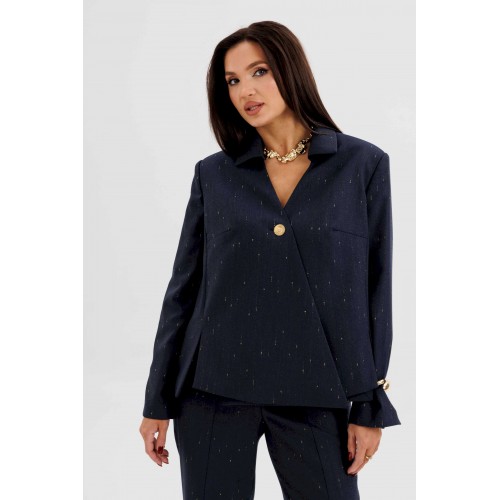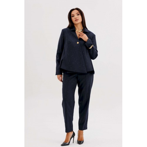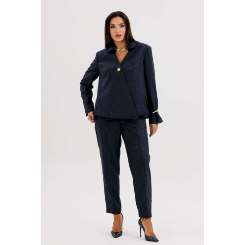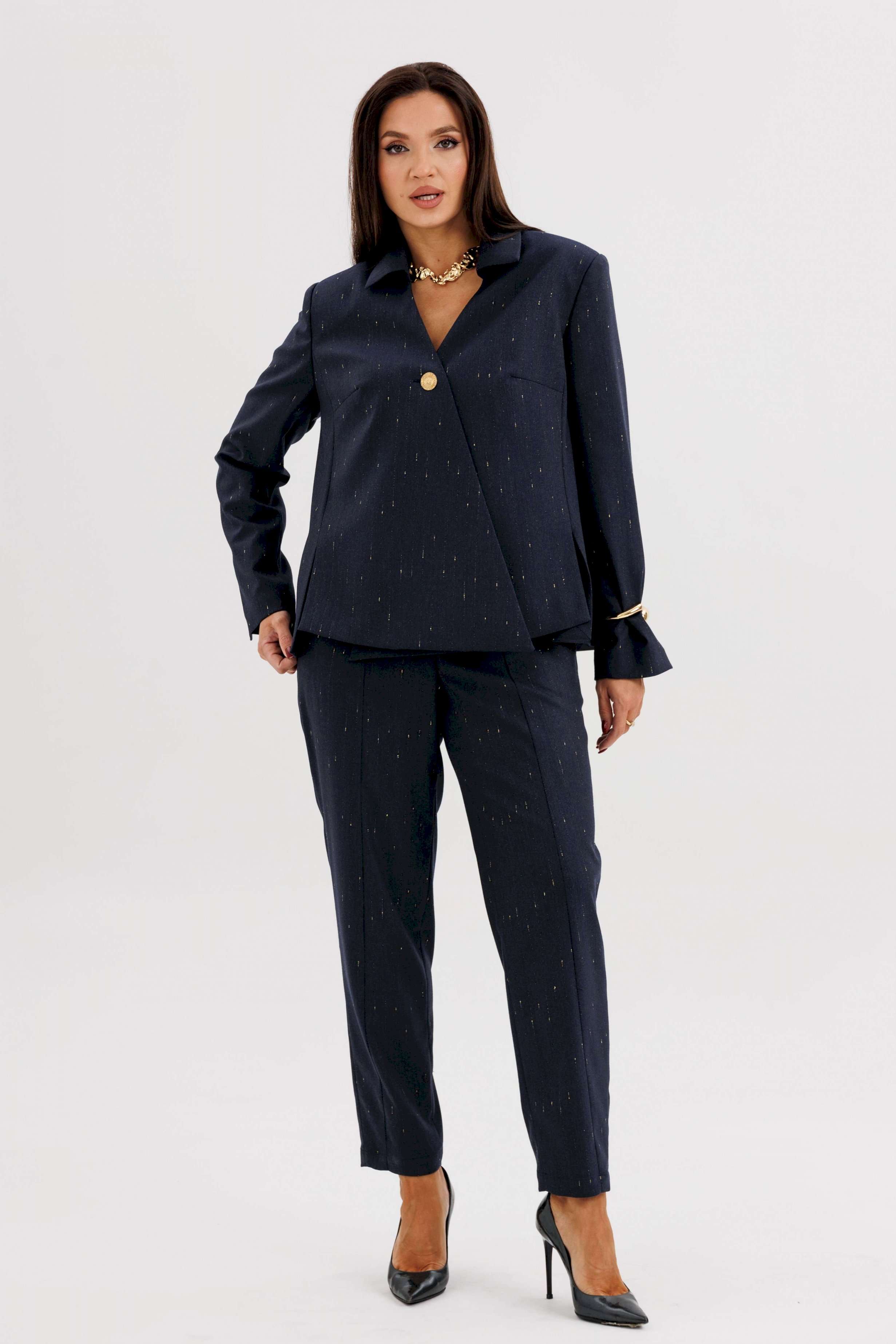 Элегантный брючный костюм из поливискозной ткани с лёгким вкраплением люрекса — выбор современных женщин, ценящих утончённый стиль и комфорт. Жакет прямого силуэта выполнен с необычной асимметричной линией борта, которая добавляет образу индивидуальности и лёгкий дизайнерский акцент. Застёжка на крупные декоративные пуговицы придаёт образу выразительность. Брюки со стрелками и аккуратной посадкой по фигуре визуально вытягивают силуэт, создавая гармоничные пропорции. Костюм идеально подойдёт для офисных будней, деловых встреч и стильных повседневных выходов. В нём каждая деталь работает на образ — от благородного оттенка ткани до мягкого блеска люрекса. Стиль, подчеркивающий характер и уверенность в себе.