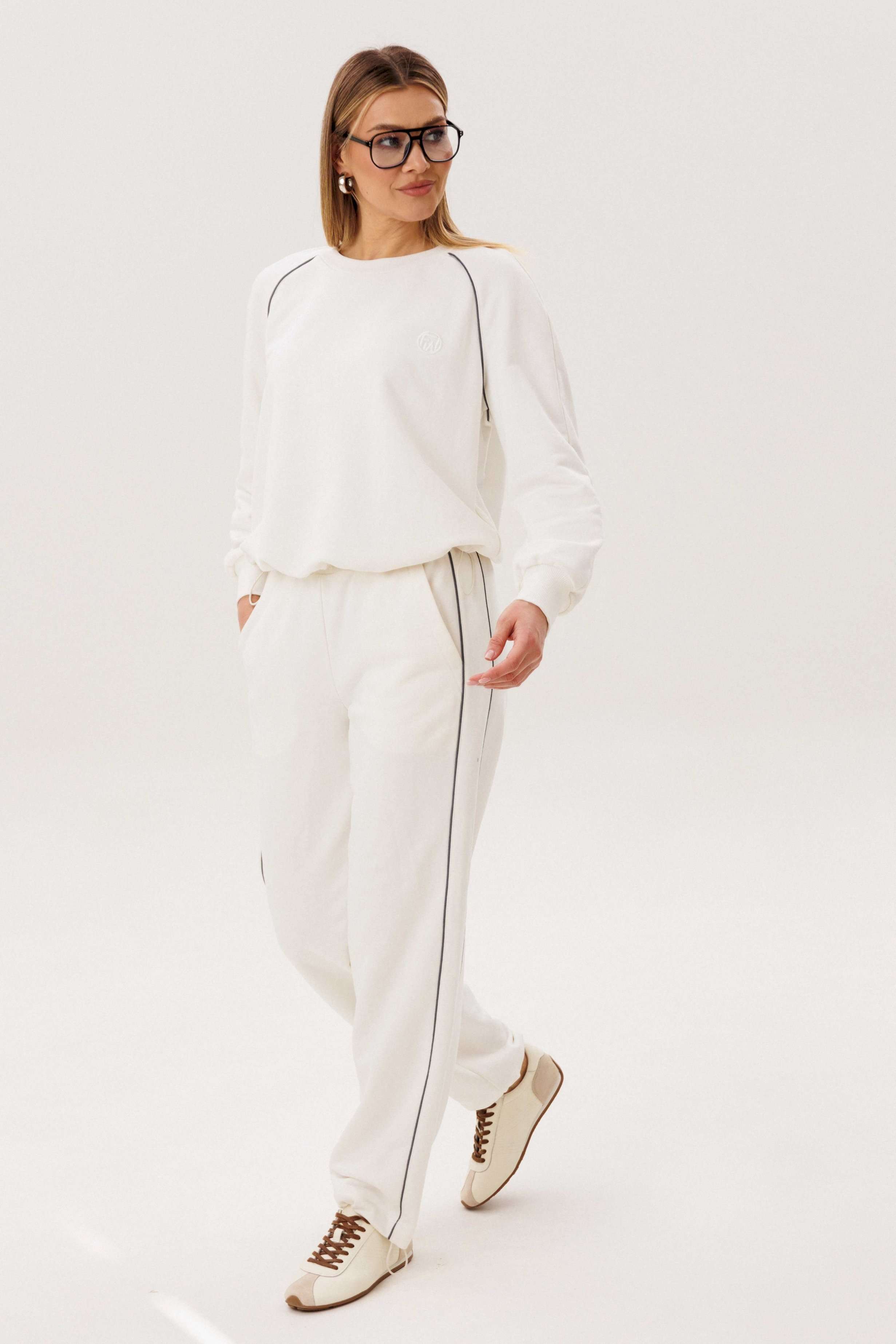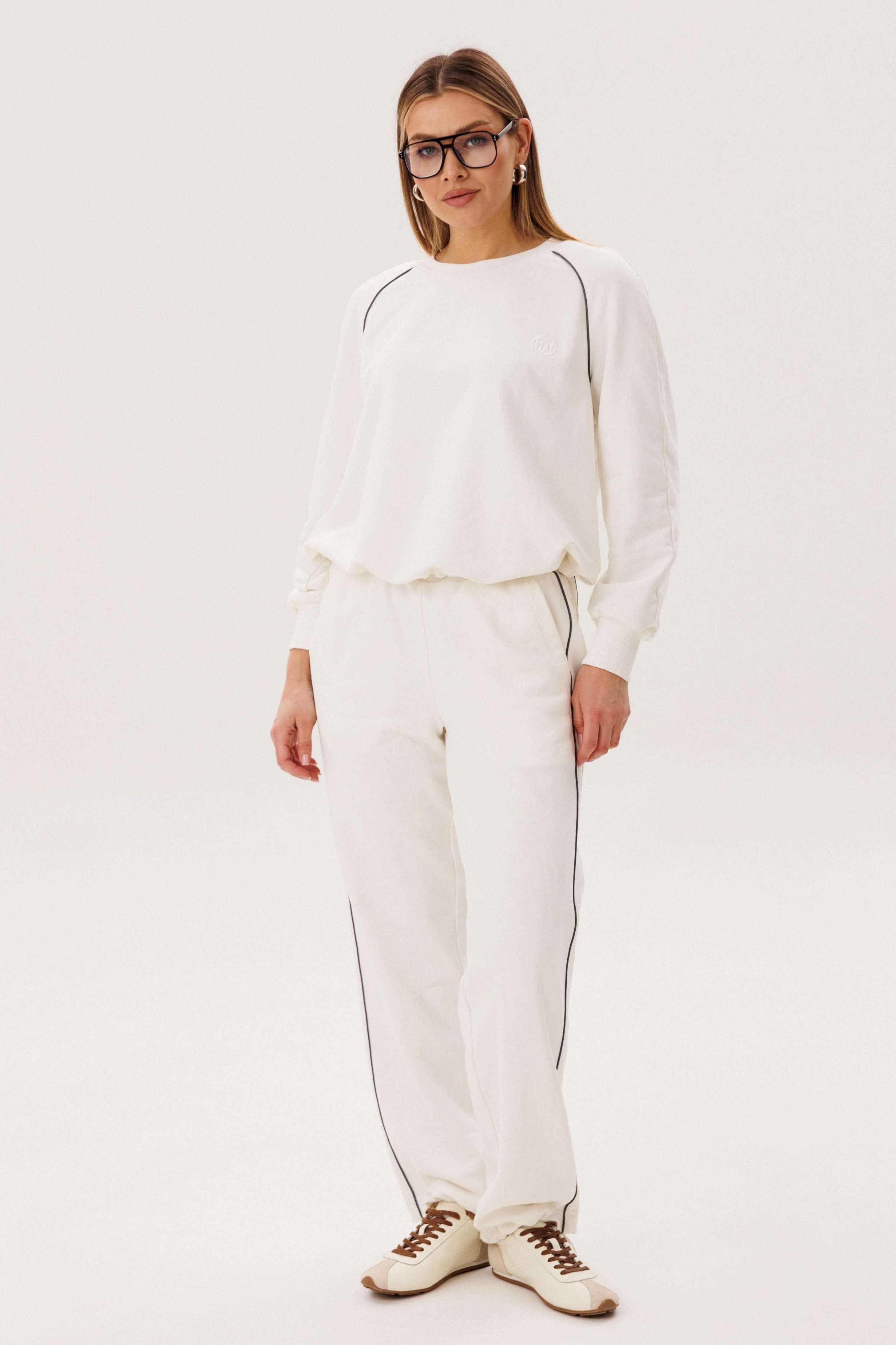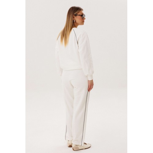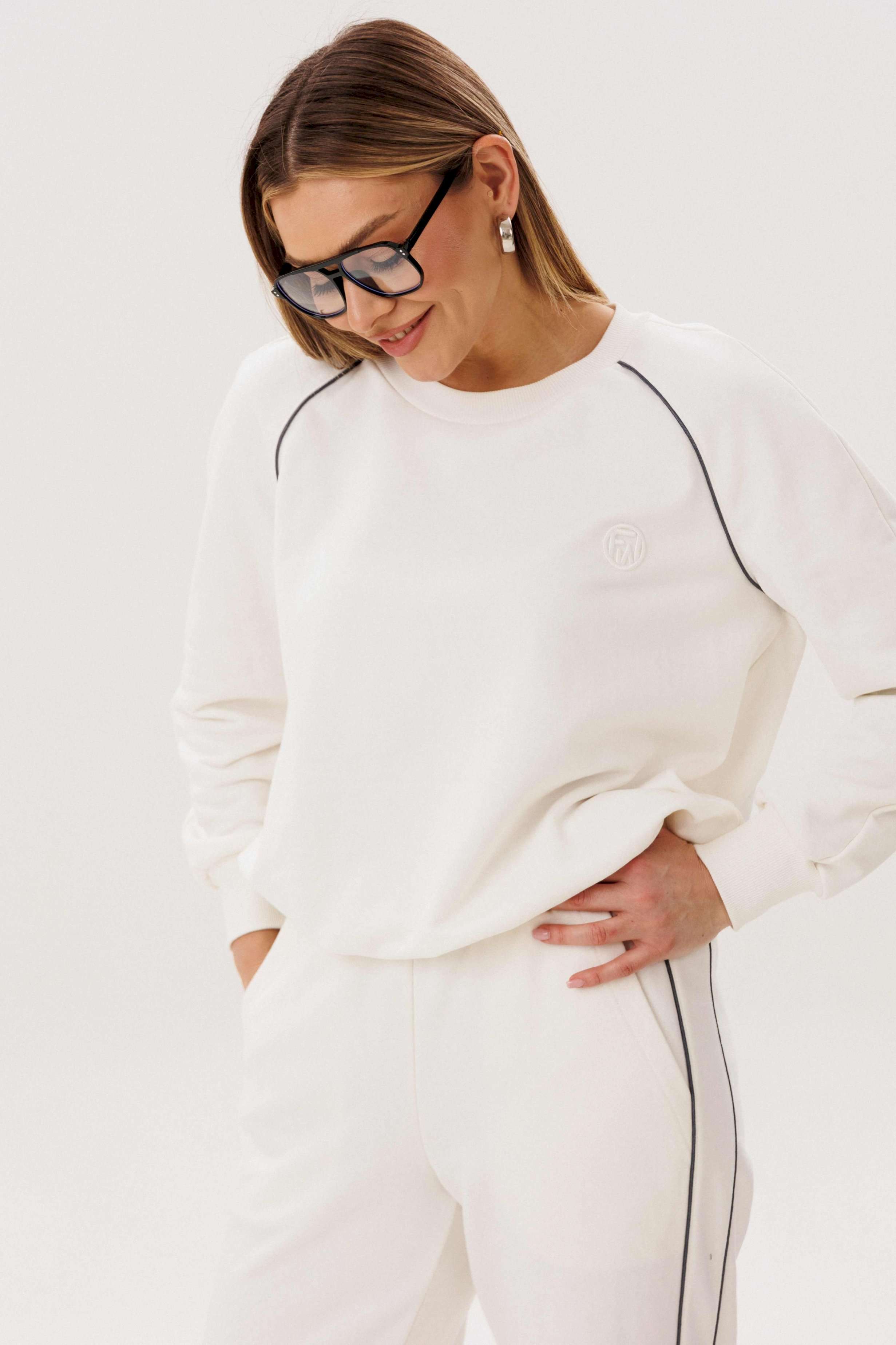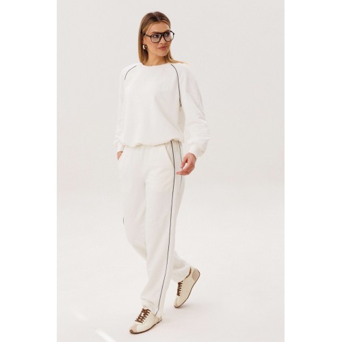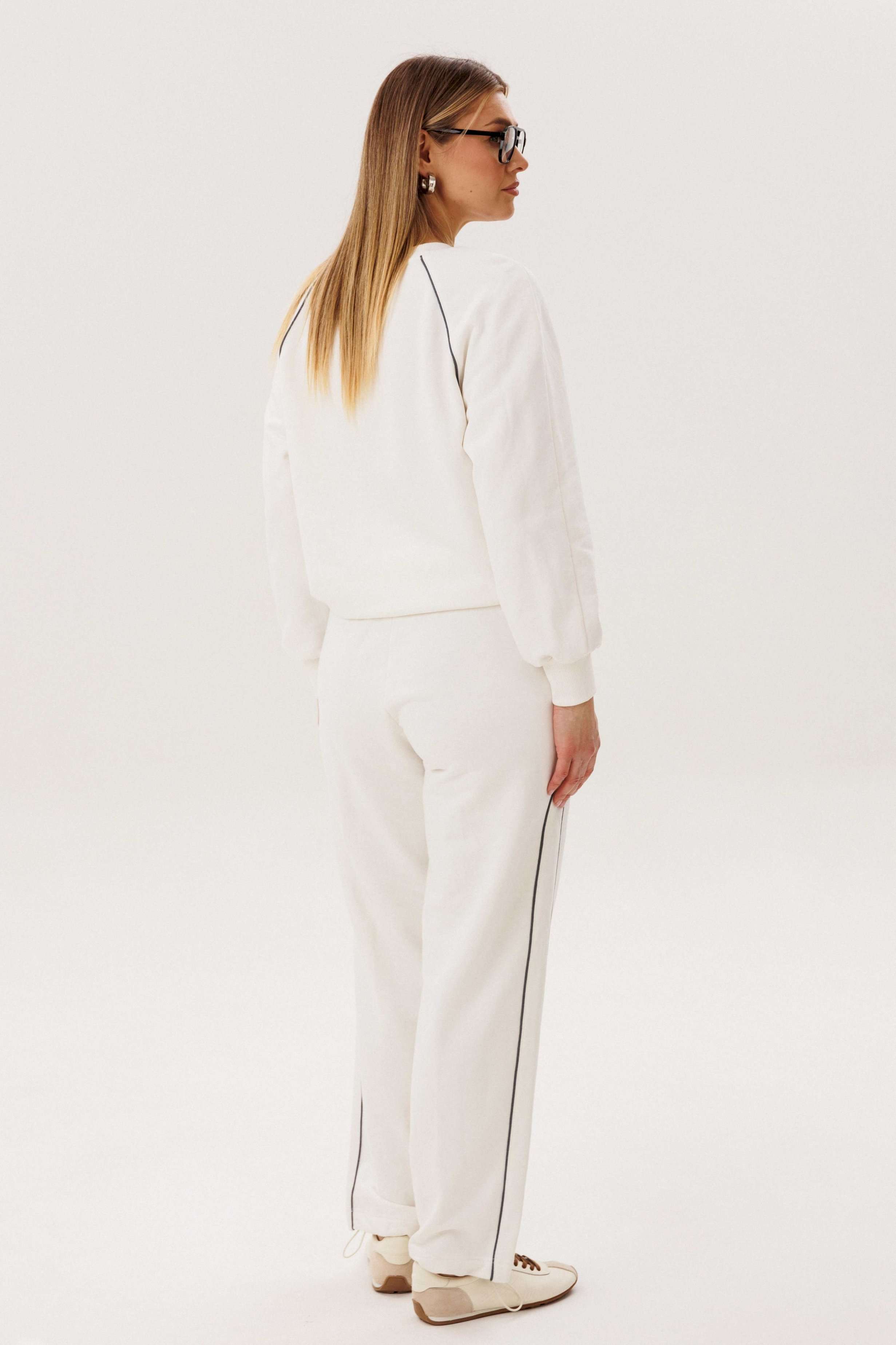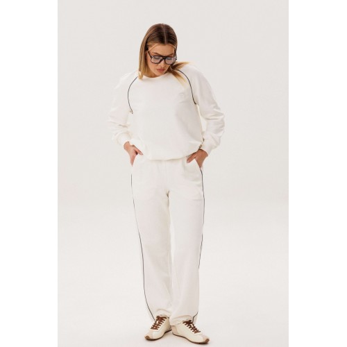 Спортивный костюм не предназначенный для занятия спортом, эдакая разновидность спортивной одежды в современной моде, выражающая характерную для спорта эстетику с помощью динамического кроя и отделки. Свободный свитшот покроя реглан с отделочными контрастными кантами по линии притачивая рукава и брендовой вышивкой на полочке. Брюки свободные, расслабленные, на эластичном поясе, с отрезным лампасом, декорированным отделочным кантом. По низу брюк-кулиса с эластичной тесьмой и фиксатором эффектно меняющая стиль брюк с прямого в \"\" алладины\"\". Длина свитшота около 60 см. Длина рукава около 60см. Длина брюк около 105 см.