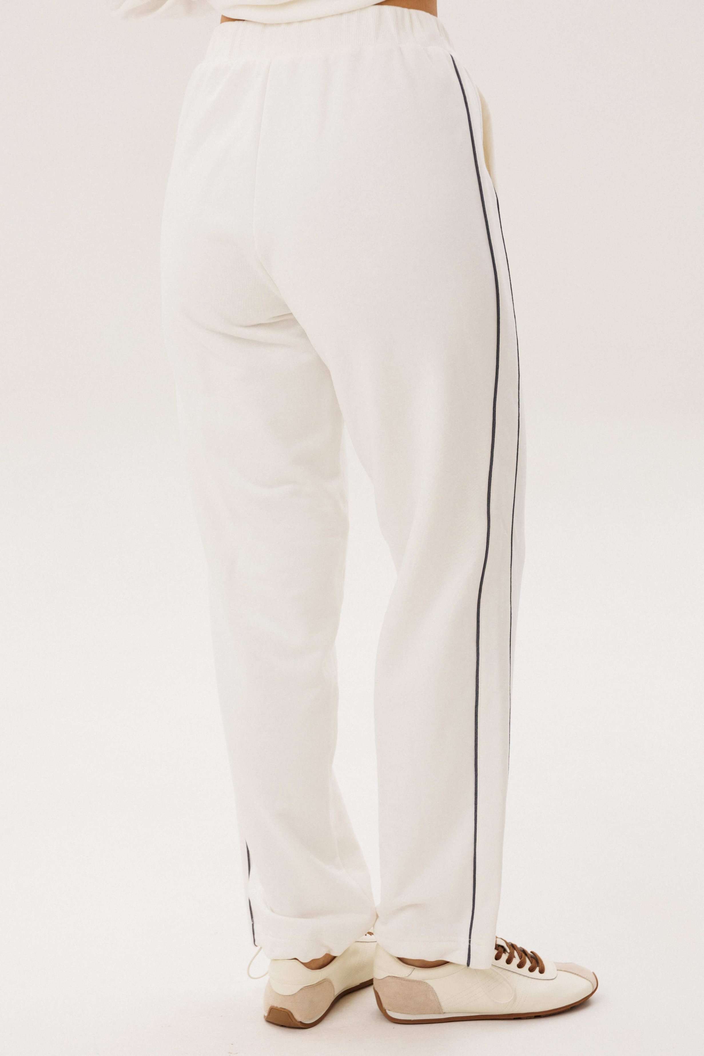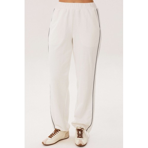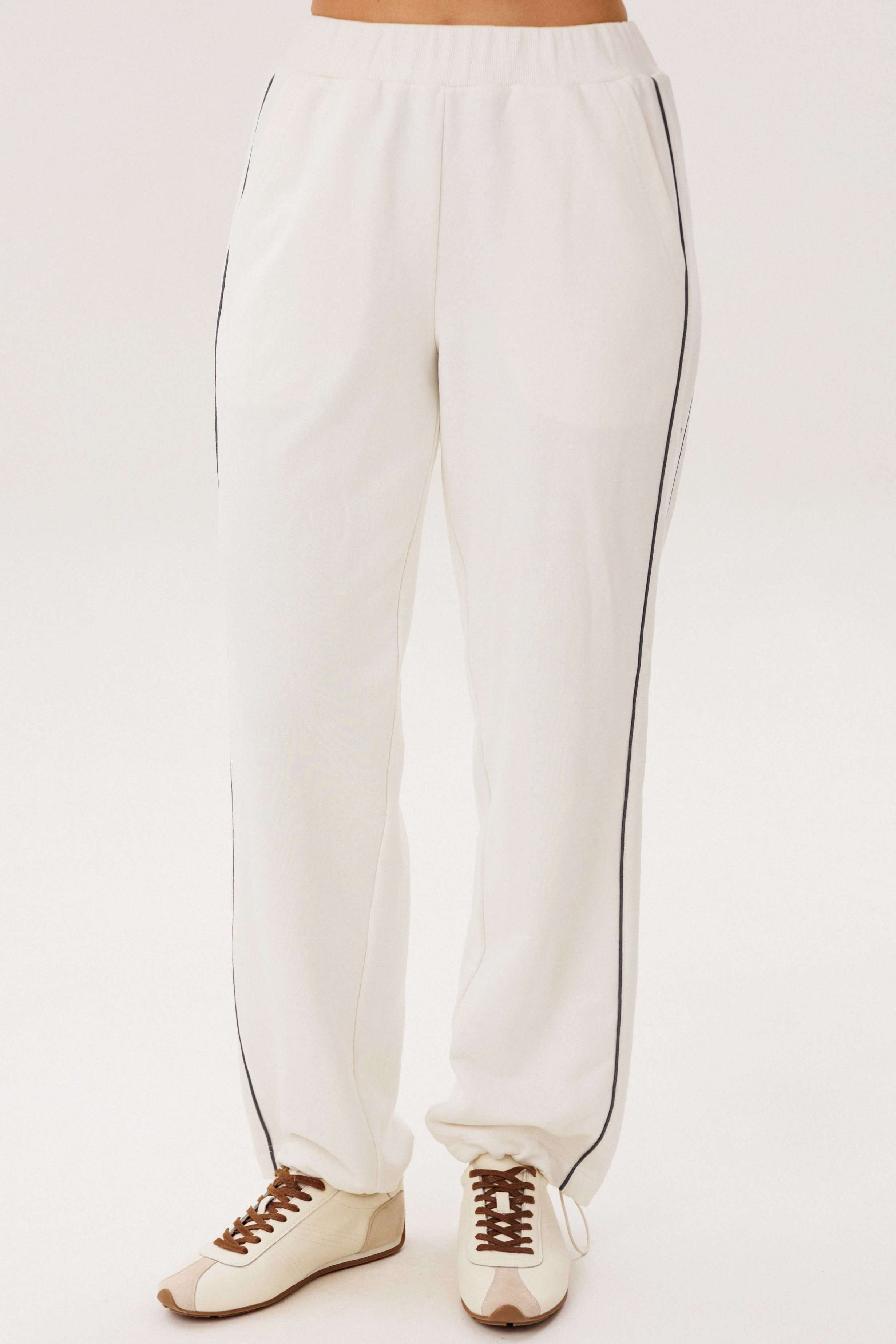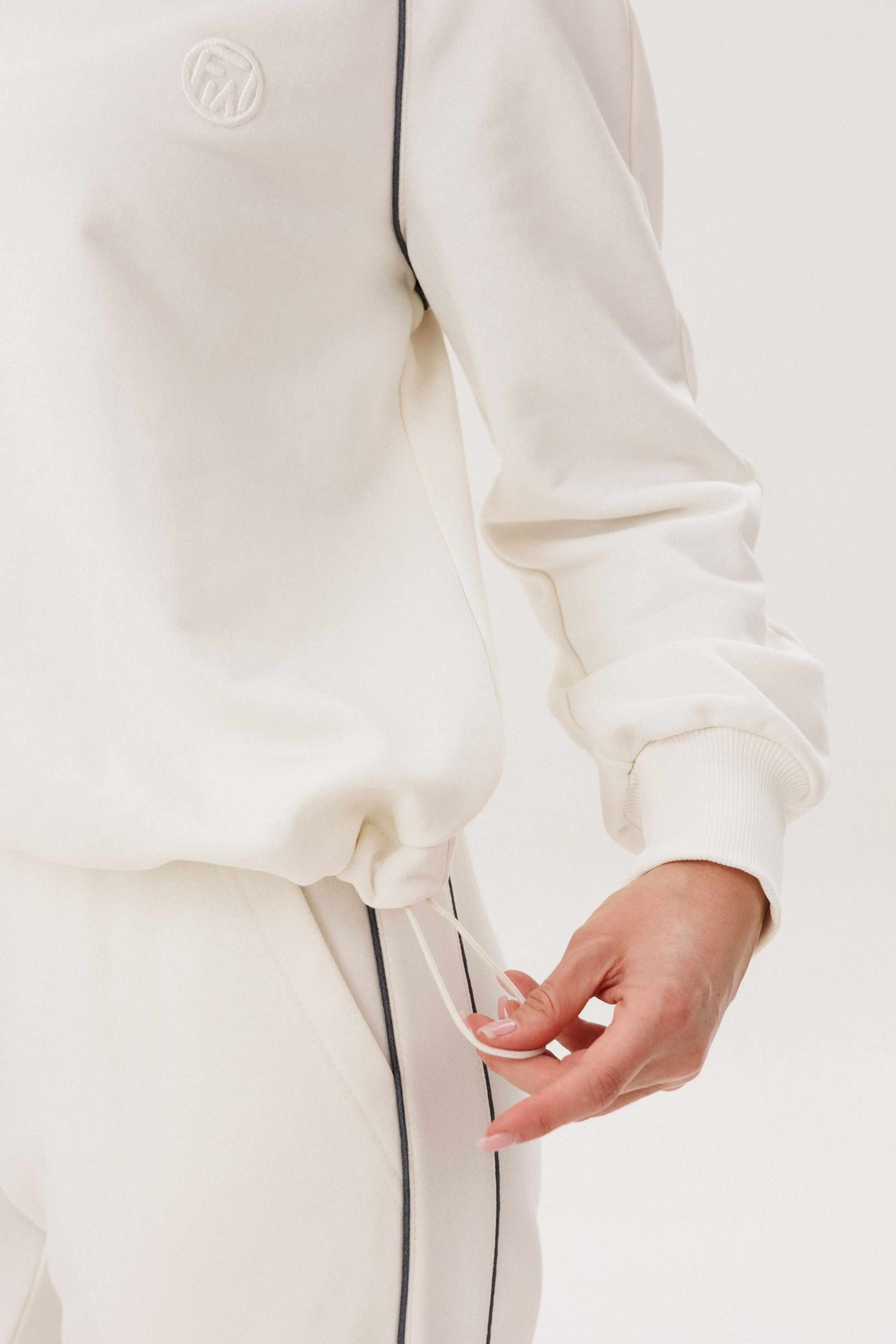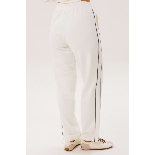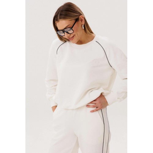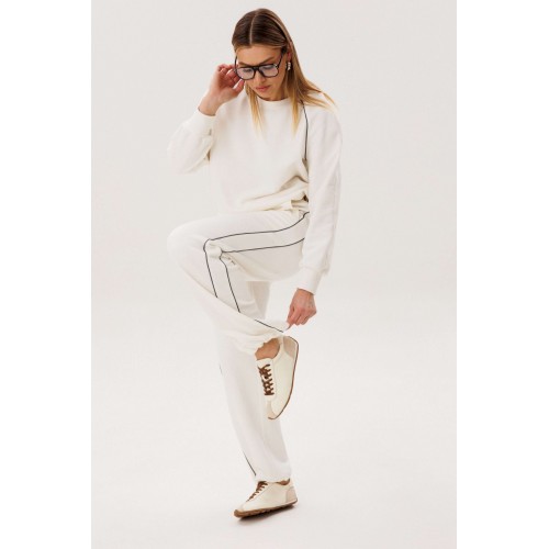 Спортивный костюм не предназначенный для занятия спортом, эдакая разновидность спортивной одежды в современной моде, выражающая характерную для спорта эстетику с помощью динамического кроя и отделки. Свободный свитшот покроя реглан с отделочными контрастными кантами по линии притачивая рукава и брендовой вышивкой на полочке. Брюки свободные, расслабленные, на эластичном поясе, с отрезным лампасом, декорированным отделочным кантом. По низу брюк-кулиса с эластичной тесьмой и фиксатором эффектно меняющая стиль брюк с прямого в \"\" алладины\"\". Длина свитшота около 60 см. Длина рукава около 60см. Длина брюк около 105 см.